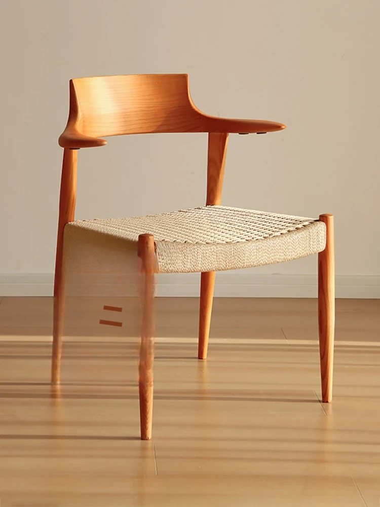 山木北欧風侘び寂びスタイルのレトロな無垢材ハンギング耳牛角椅子、手すり付き、紐編み背もたれ、書斎やオフィスに最適なリラックスチェア!日本の美学を感じる一品をあなたの空間に。