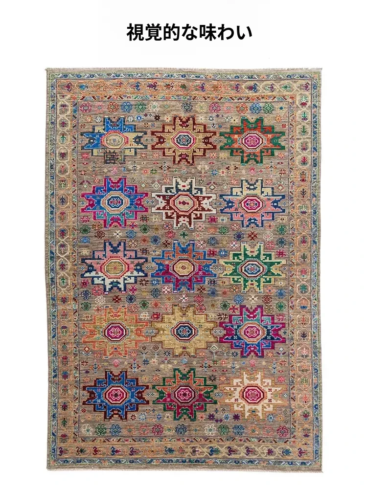 視覚と味覚を刺激するアフガニスタン直輸入の高級手織りカーペット!アメリカンスタイルのリビングにぴったり、環境に優しくフォルムも美しい、安心の無ホルムアルデヒド製品です。