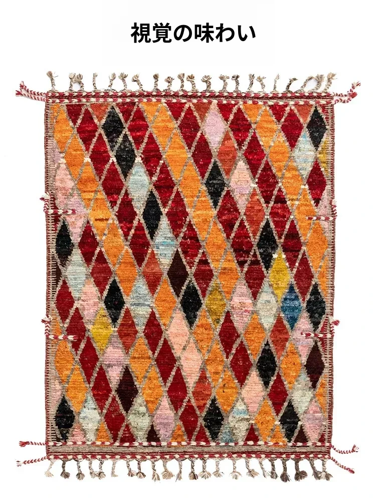 ビジュアルな香りを楽しむ!手作りの長毛ウールラグ、輸入モロッコスタイルで、リビングや寝室に最適。厚手で、接着剤やホルムアルデヒド不使用、安心安全な一品です。