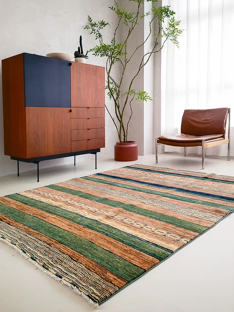 アフガニスタン直輸入 おしゃれな侘寂スタイルの手織りカーペット 高級感あふれるウール製 シンプルでラグジュアリーなストライプデザイン 寝室にぴったりのアイテム!
