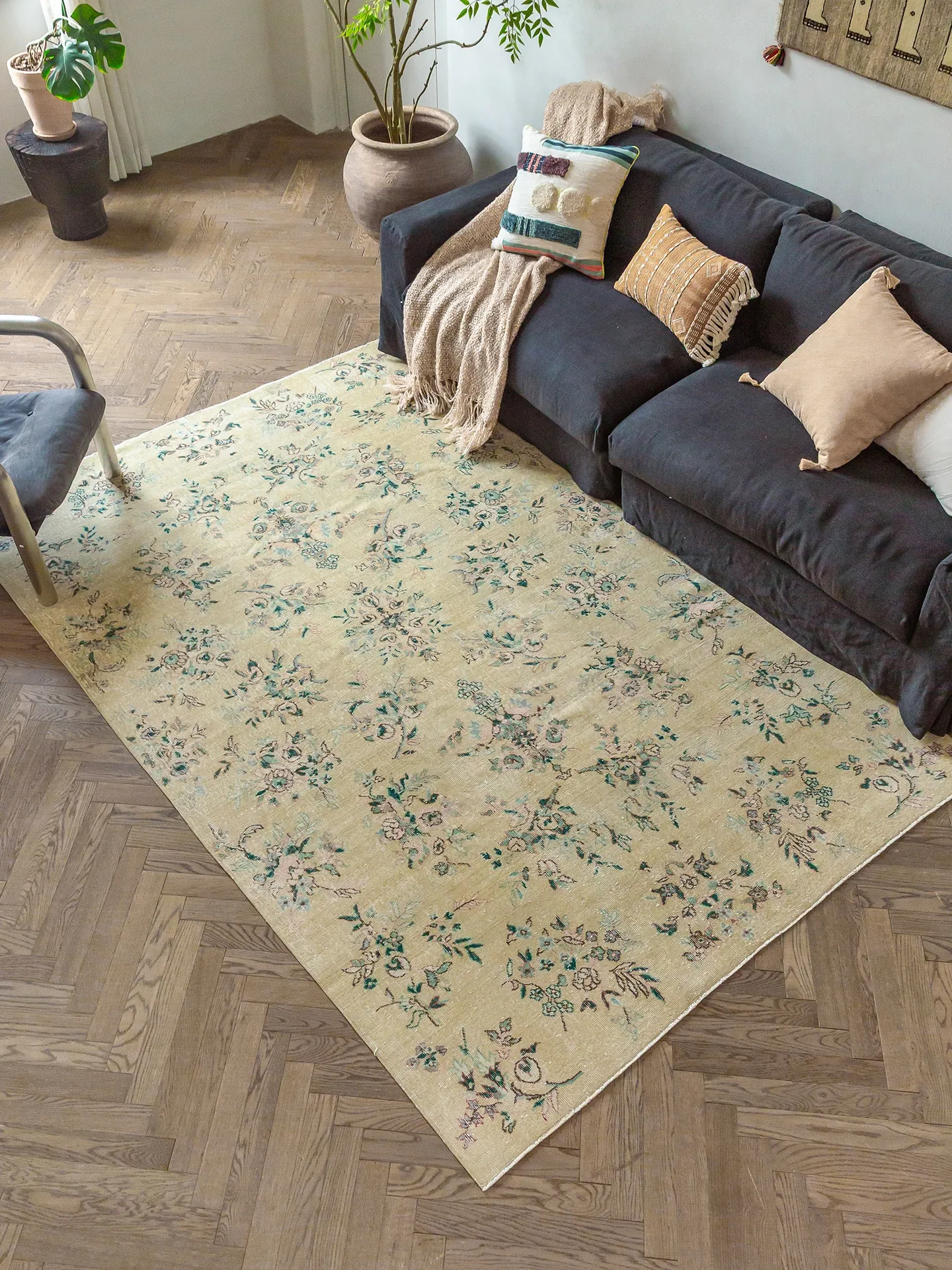視覚的な美味しさを感じる!トルコ直輸入のヴィンテージ風リビングラグ、手作りウール編み、高級感あふれるアンティーク仕上げでお部屋を華やかに。