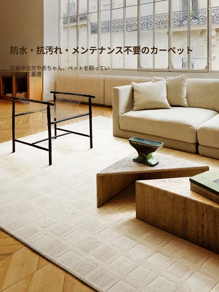 視覚と味覚を楽しむ防水・防汚のリビングラグ!手間いらずでお手入れ簡単、クリーミーな風合いで軽やかさと高級感を演出。侘寂の美しさを引き立てる、あなたの空間にぴったりのアイテムです。