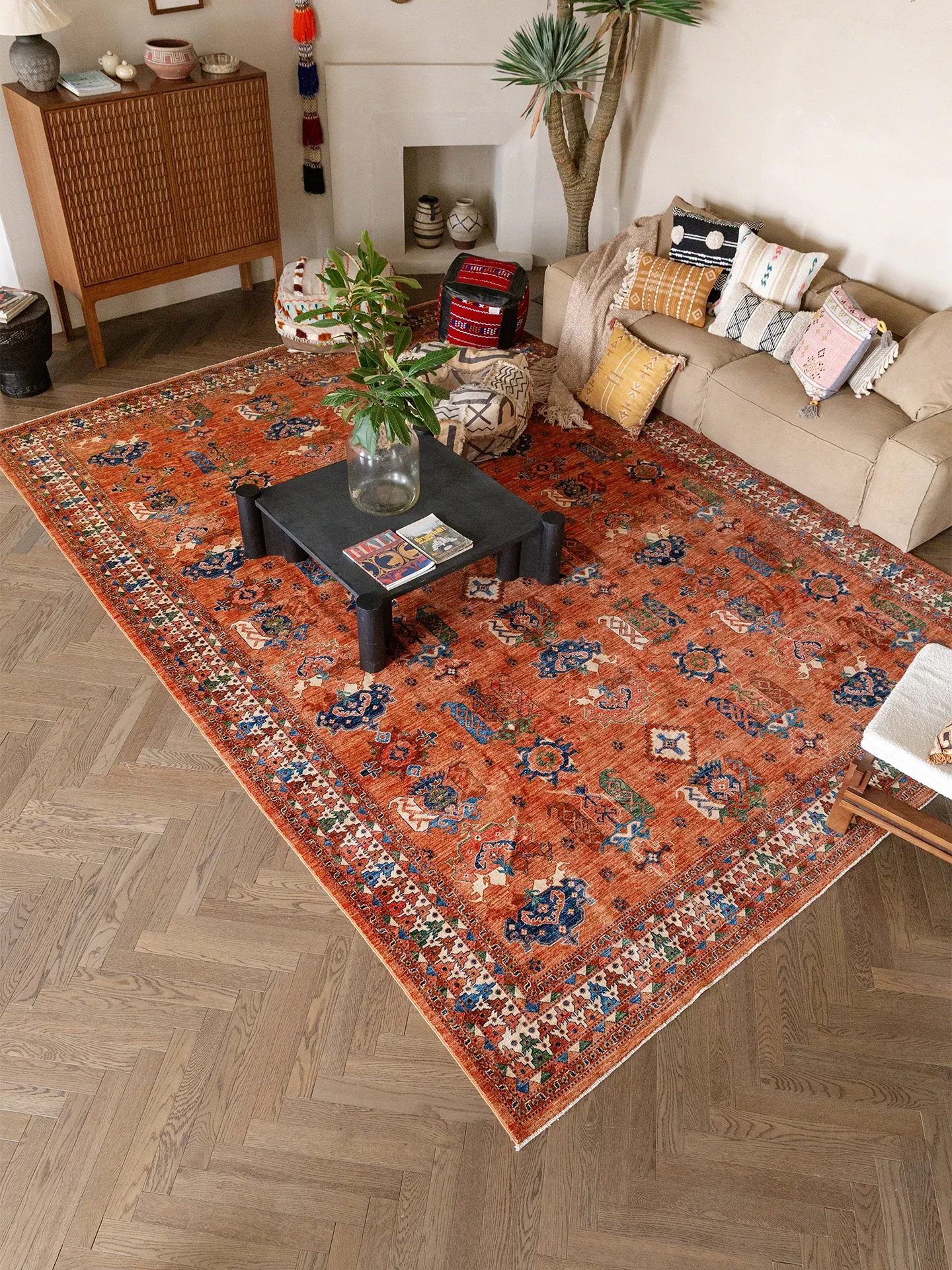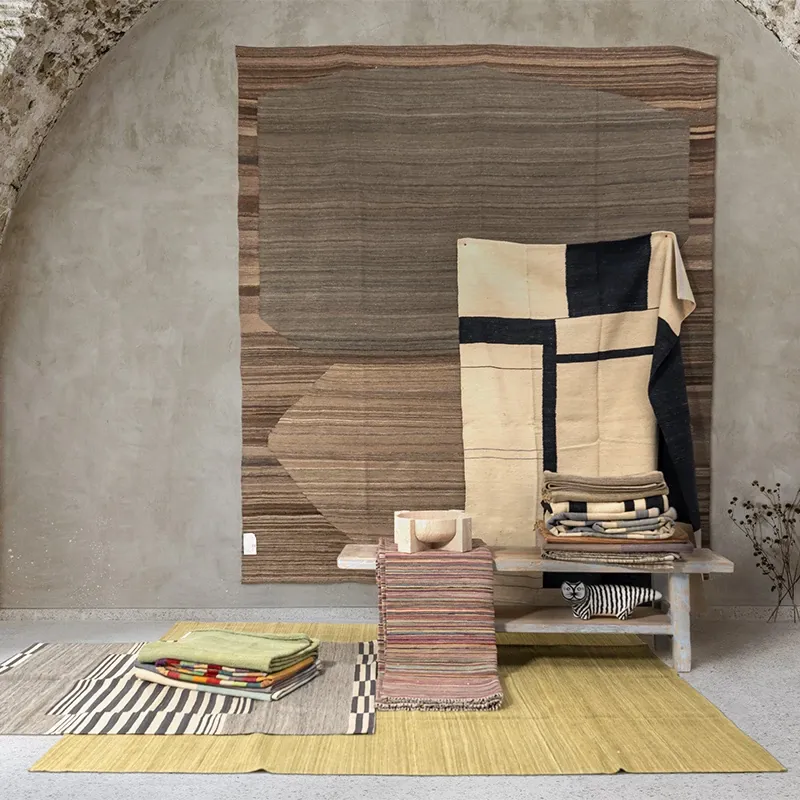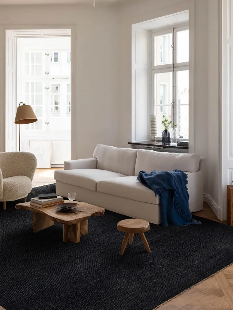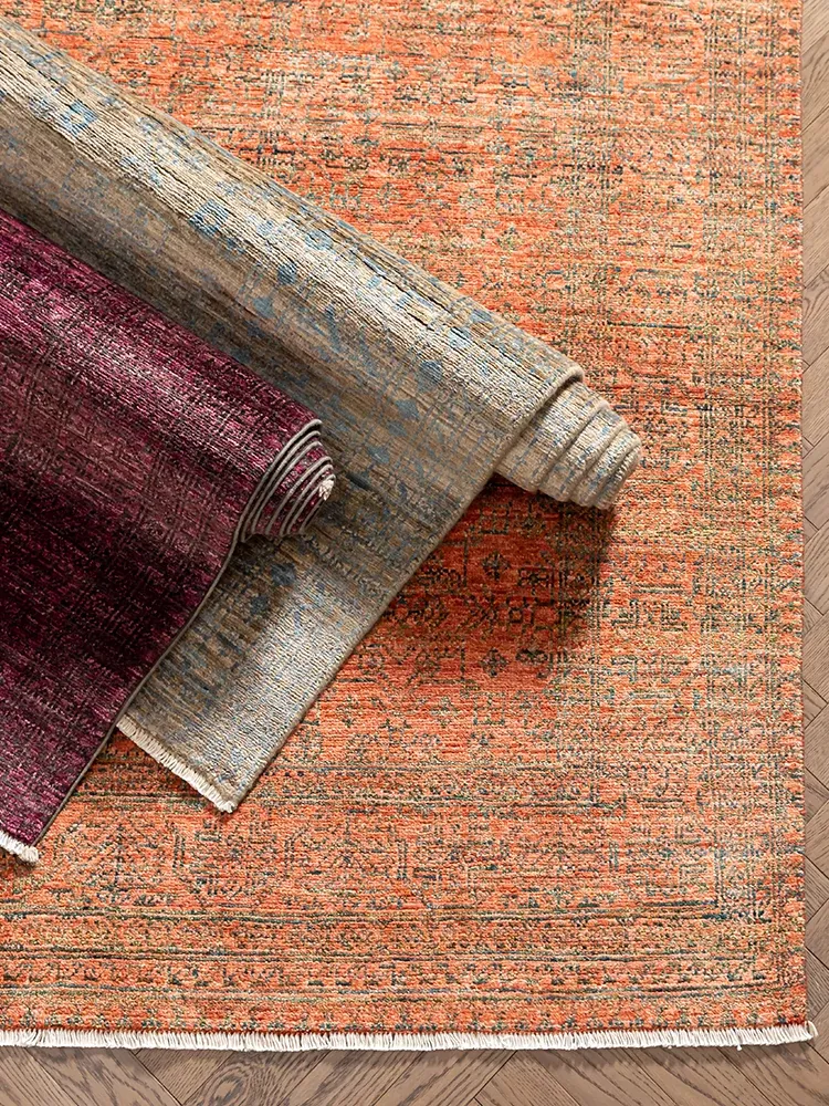 ビジュアルと味わいのある無接着剤の輸入手作り天然ジュートカーペット。レトロなデザインで、高級感あふれる侘寂スタイルのリビングにぴったり!