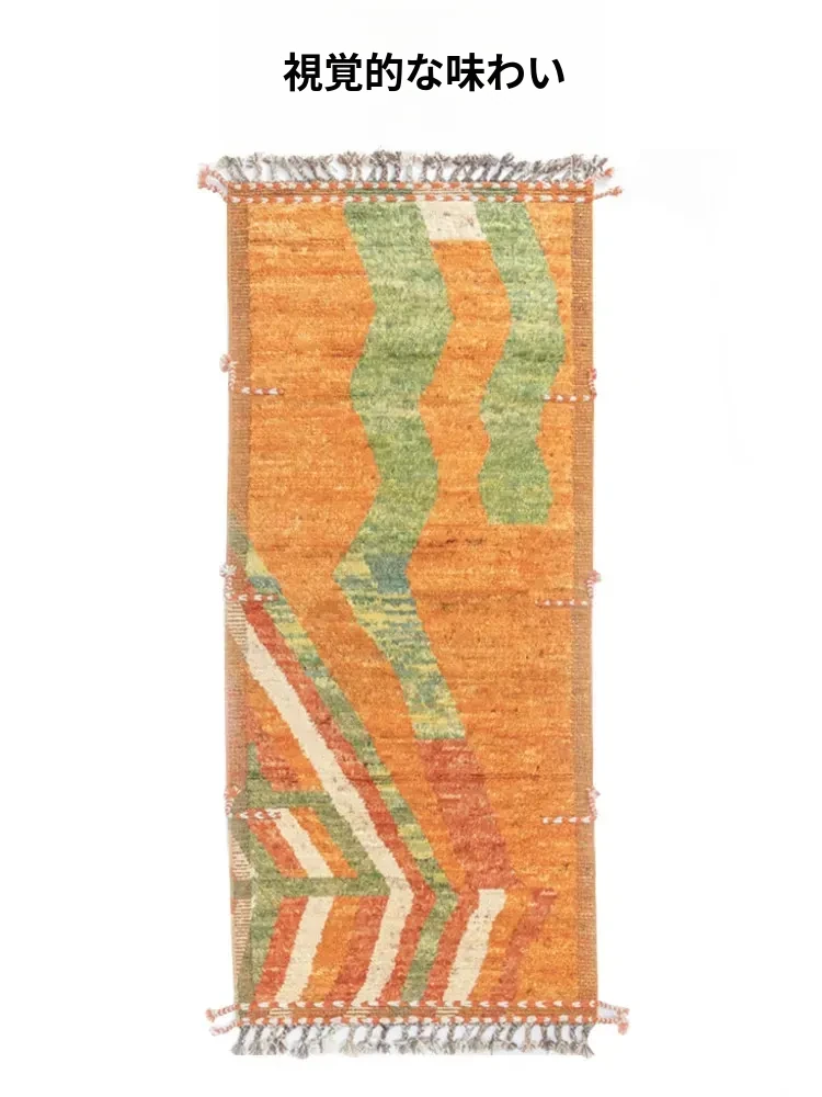 ビジュアルテイストの長方形輸入手作りウールラグ、モロッコスタイルの厚手ベッドサイドカーペット。接着剤・ホルムアルデヒド不使用で安心、安全な暮らしをサポートします。