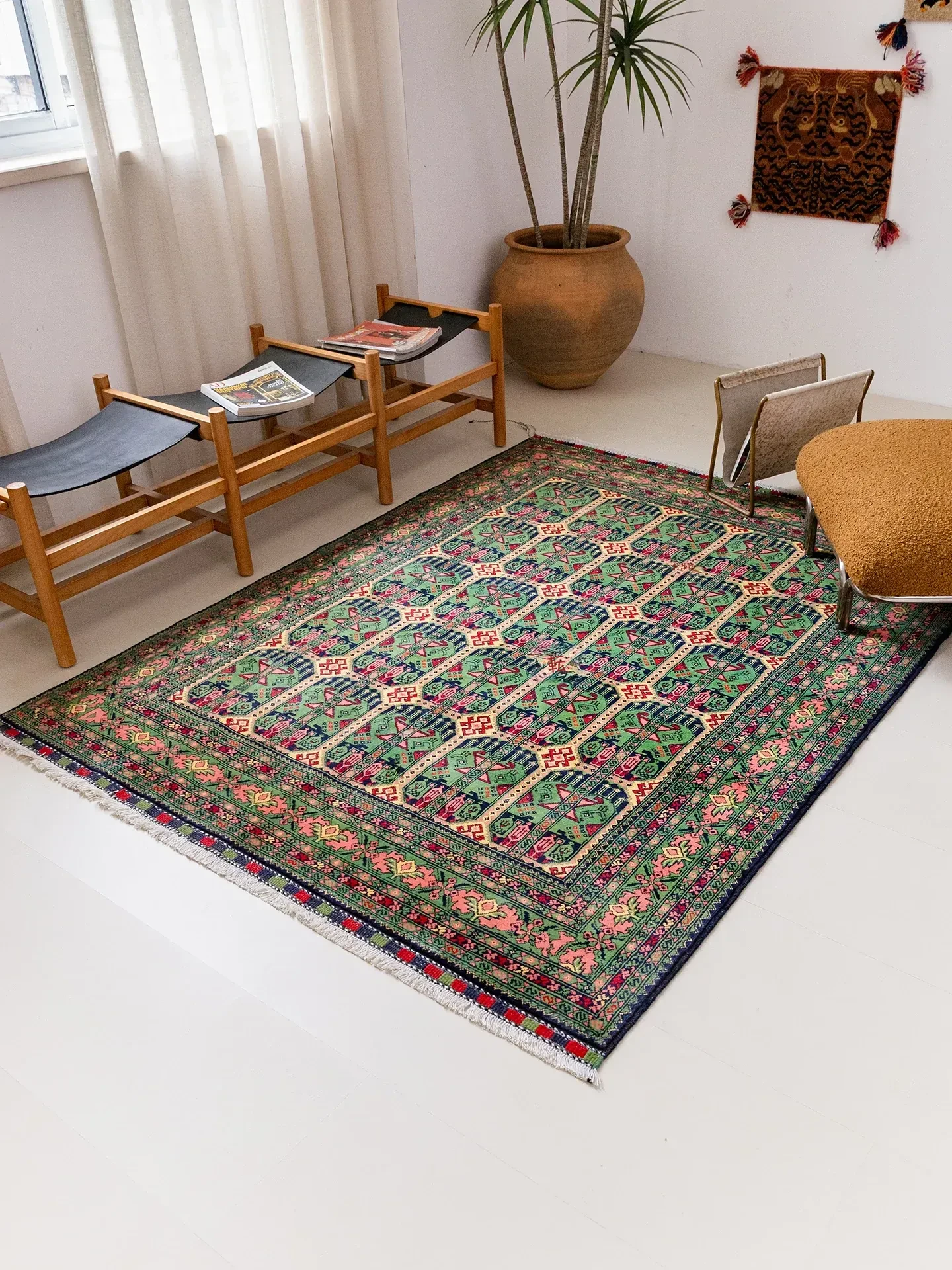 視覚と味覚が融合したアフガニスタン直輸入の手作りノットウールラグ。レトロなペルシャ民族風デザインで、リビングルームを華やかに彩る大地毯。心地よい質感と独特の魅力をお楽しみください!