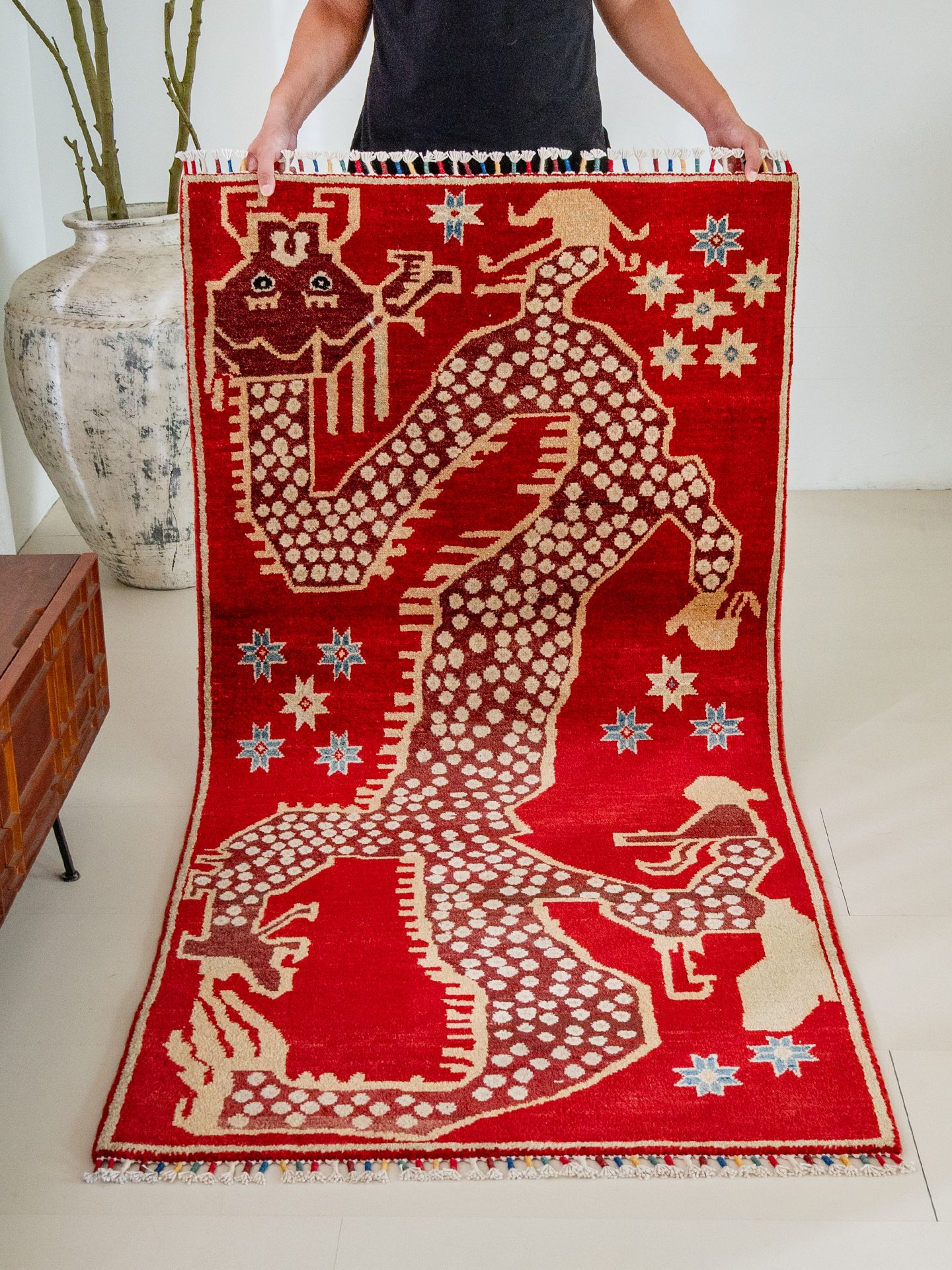 視覚と味覚を楽しむ!アフガニスタン直輸入の手織りヴィンテージウールカーペット。リビングルームにぴったりな高級感あふれるドラゴンデザインのタペストリーで、贅沢な空間を演出します。