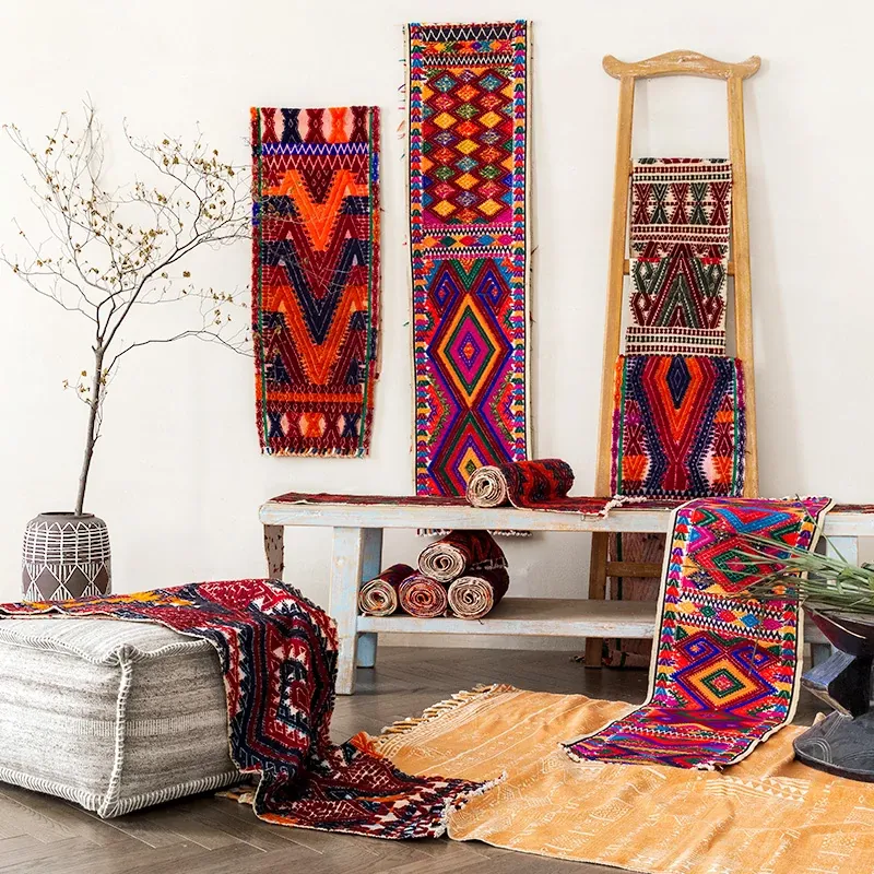 アフガニスタン直輸入のペルシャ風レトロ手織りウール民族柄ラグ、リビングや玄関、ダイニングにぴったりなテーブルランナーとしても使用可能!おしゃれで温かみのあるインテリアを演出します。