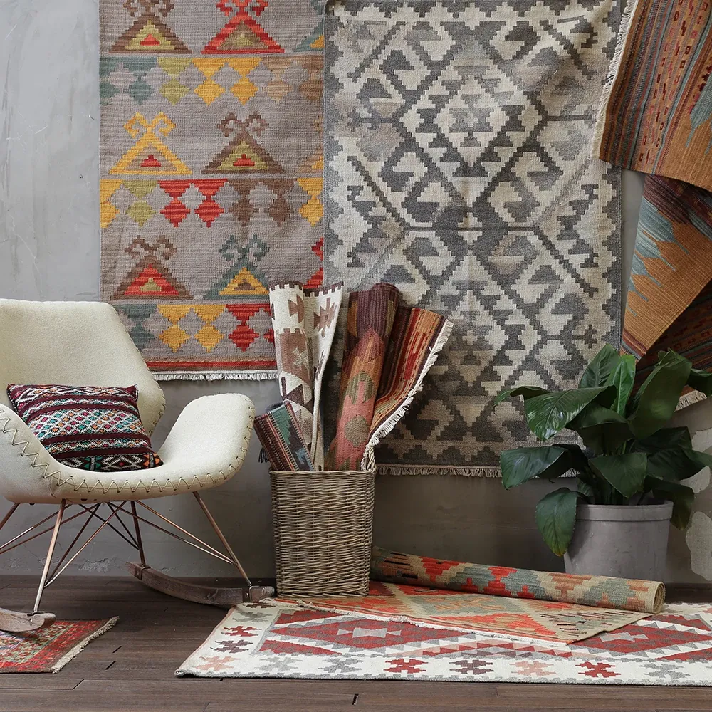視覚の味わい インド直輸入キリム 北欧民族風の幾何学模様 手作りウール織り ラグ カーペット リビングルームや寝室に最適!