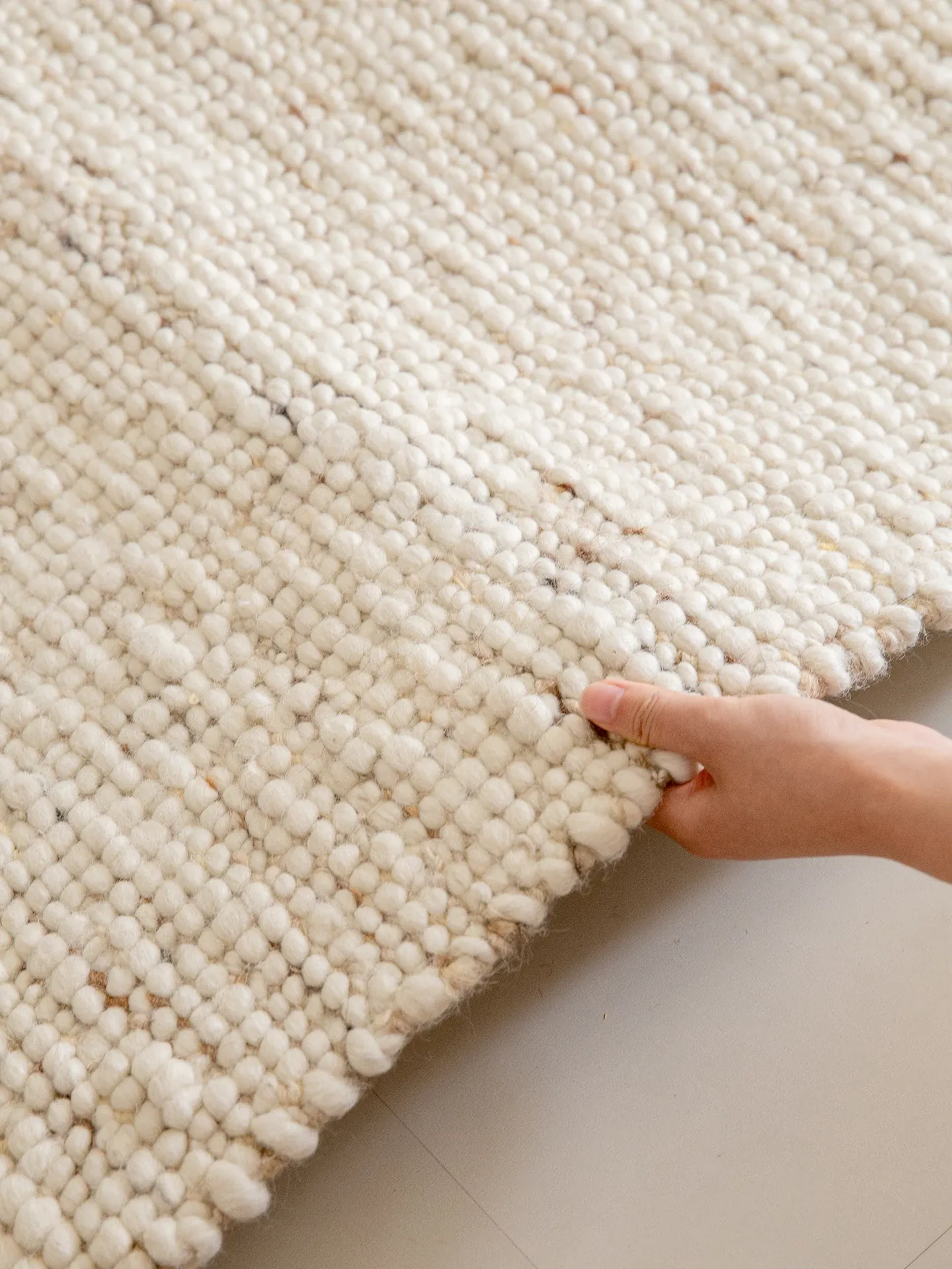 リビング用大判ラグ輸入手作りウールクリーム色の侘寂風テーブルマット、寝室にも最適なミニマルでラグジュアリーな家用ベッドサイドマット