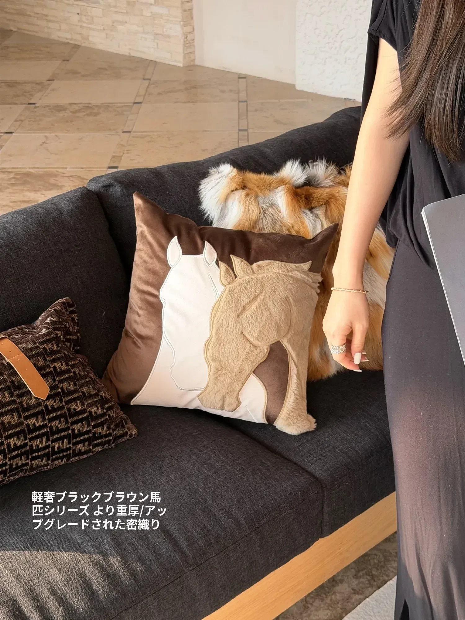 テックスドリームのオートミール色ロイヤルホース柄のクッションカバー、モダンでヴィンテージ感漂うソファにぴったり!リビングルームをおしゃれに演出するファー素材の抱き枕カバー。