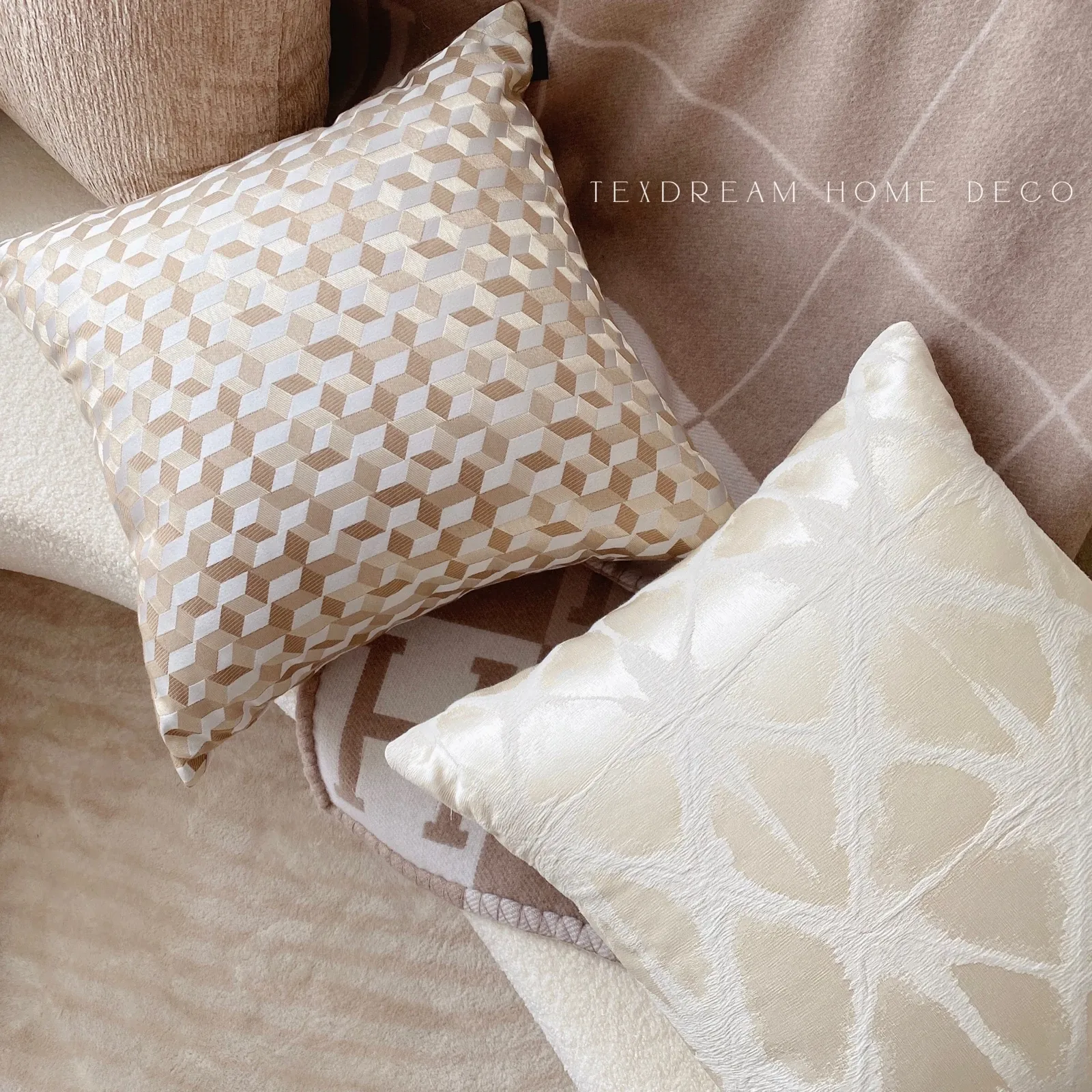 Texdreamのスタイル ふんわりとした麦穂ベージュ フランス風ジャカードクッションカバー リビングルームやソファにぴったりのラグジュアリーな本革枕カバー