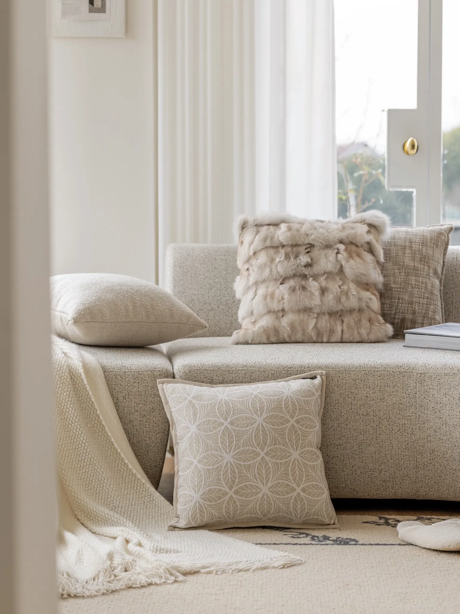 テックスドリームのクリームベージュファー抱き枕、モダンでシンプルなリビングにぴったり!高級感あふれるデザインで、あなたのソファに特別なアクセントを加えます。快適さとスタイルを両立させた一品です。