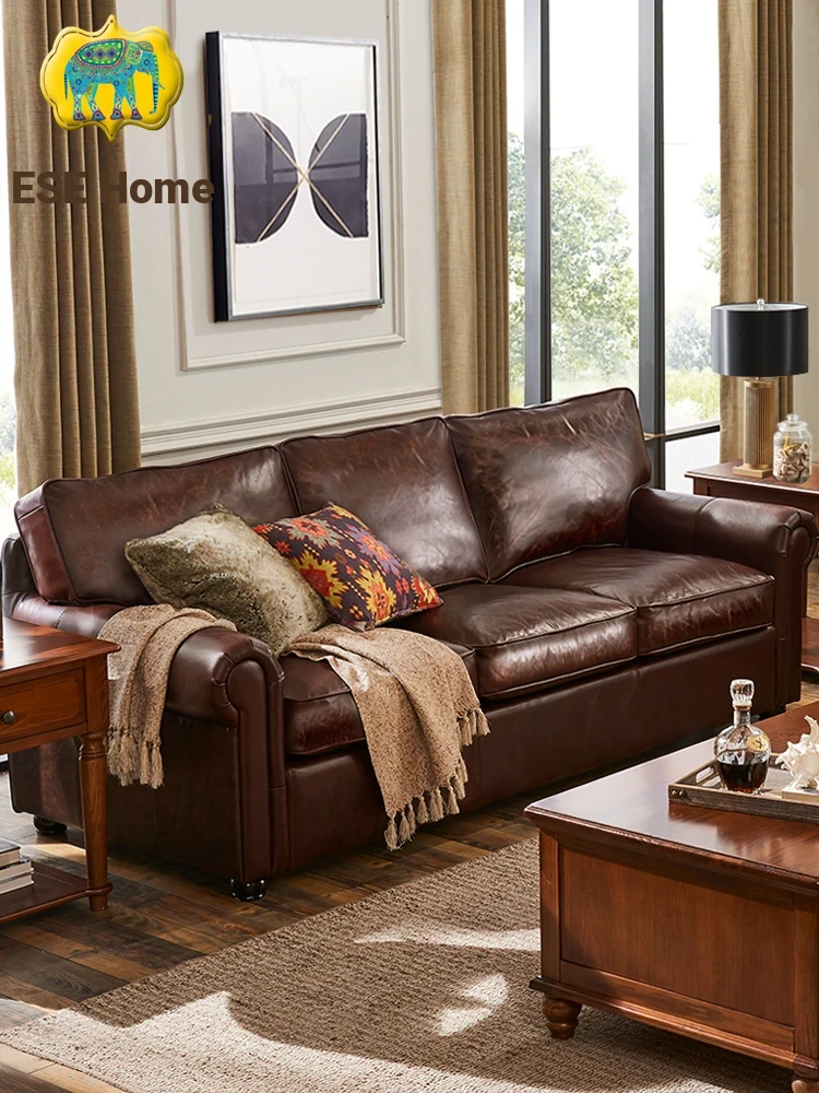 Elegant American Genuine Leather Sofa Set - High-End Vintage Living Room Furniture for Luxurious Minimalist Homes, Perfect for Small Spaces