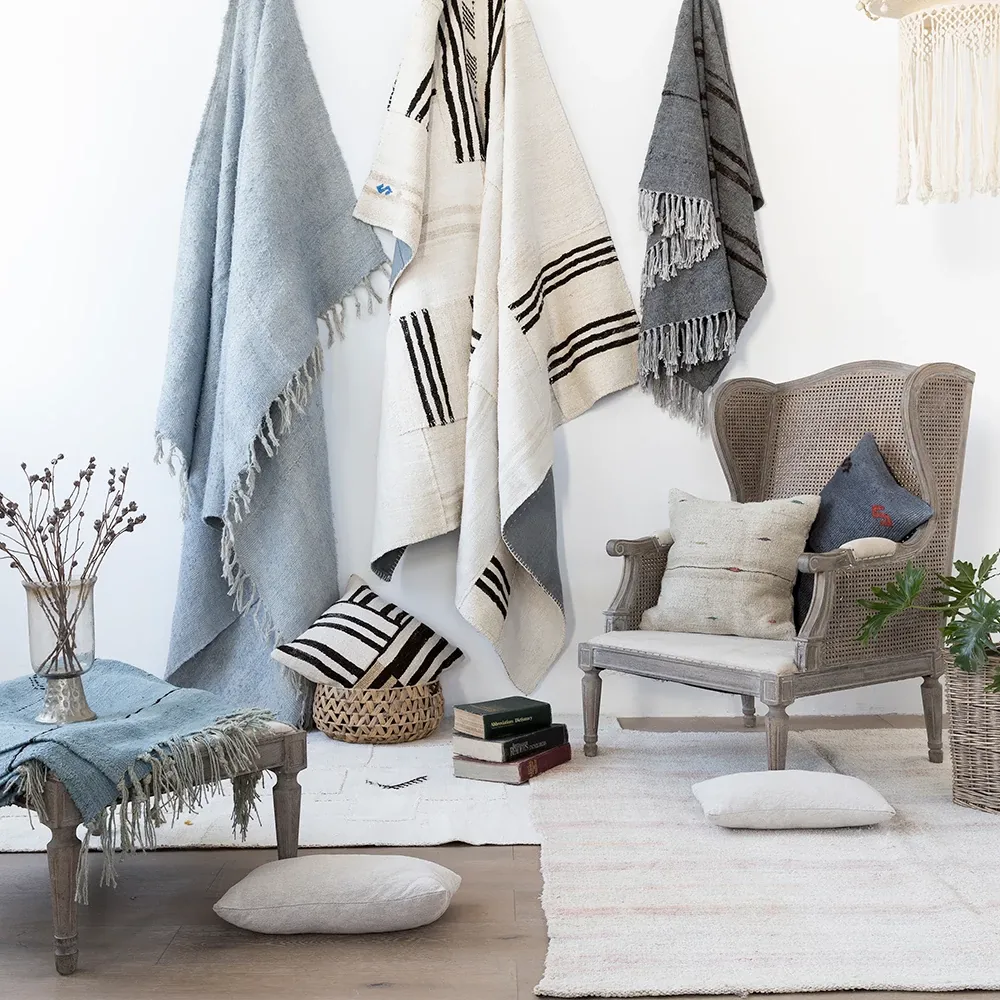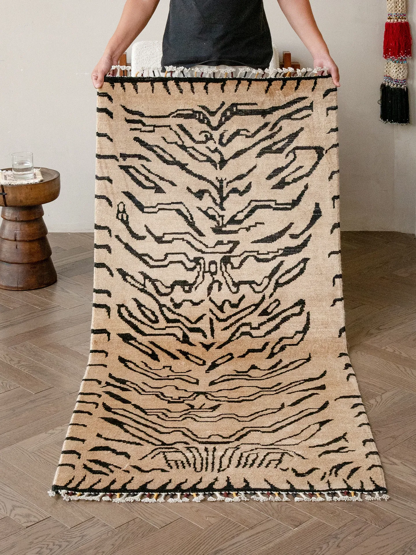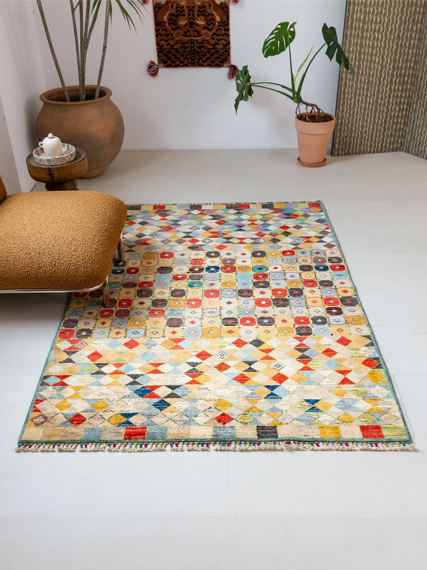 Visual Taste: Imported Afghan Handwoven Wool Area Rug - Modern Vintage Wabi-Sabi Style, Glue-Free, Perfect for Elevating Your Living Room Décor.