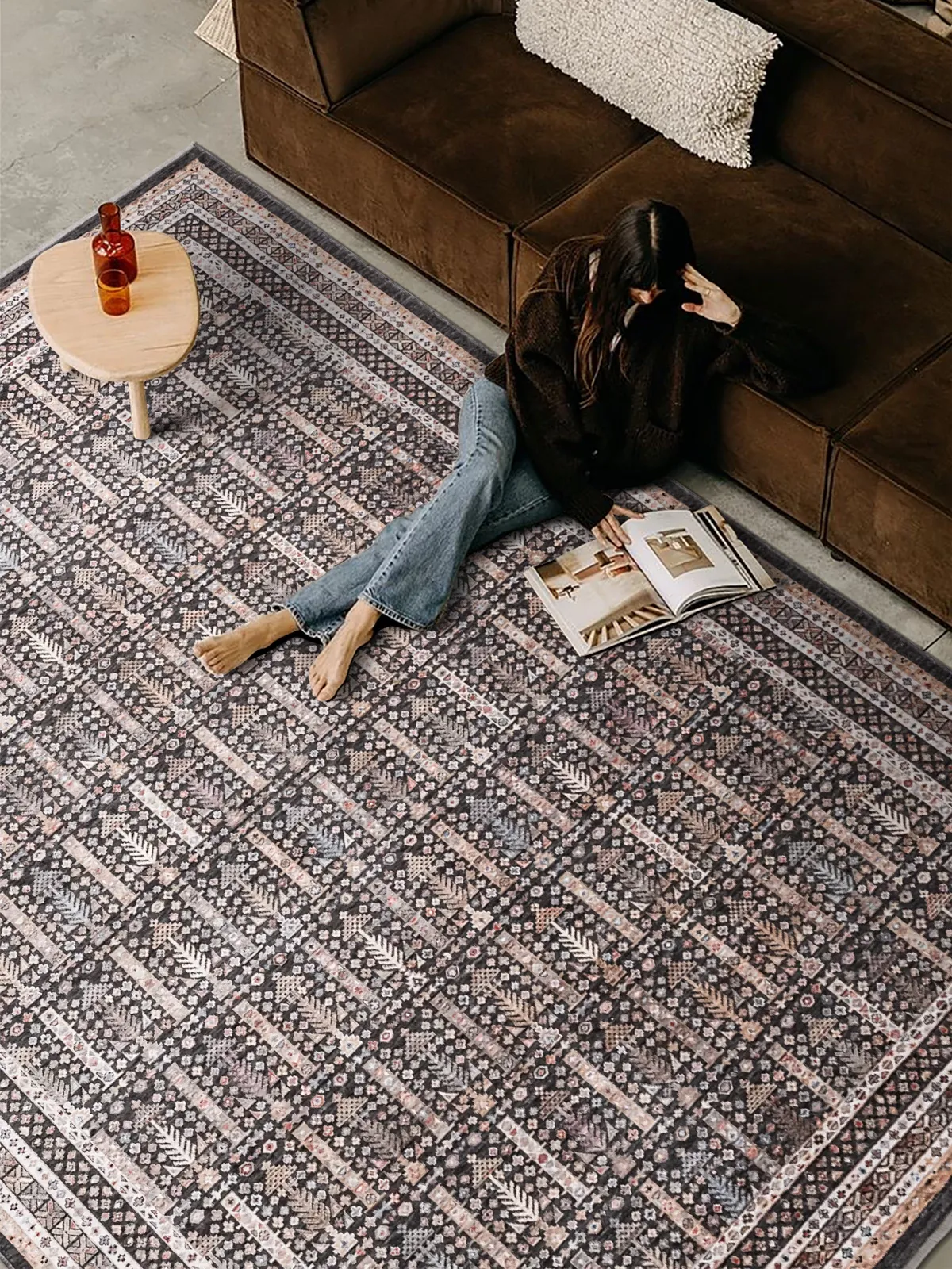 Vintage-Inspired Black Turkish Woven Area Rug for Living Room - Imported, French-Style, High-End, Stain-Resistant, No Glue, Perfect for a Chic Home Decor