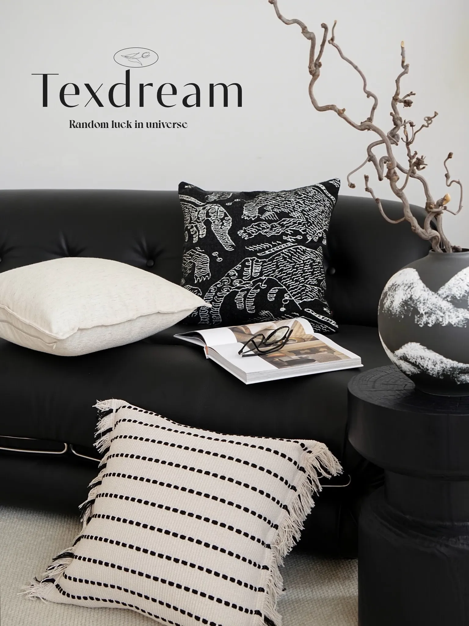 TEXDREAM Attitude Black and White Textured Minimalist Sofa Throw Pillow - Wabi-Sabi Style Luxury Hotel Bedside Cushion for Elegant Interiors