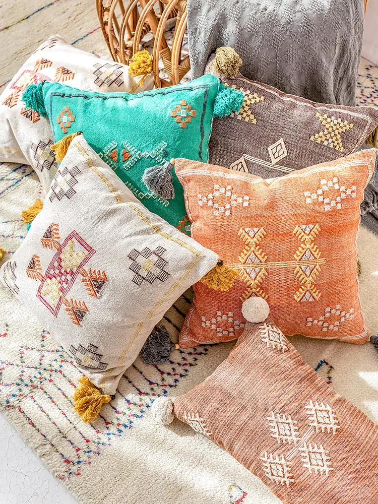 Visual Delight: Handcrafted Bohemian-Style Nordic Sofa and Bed Pillows Imported from India - Perfect for Your Cozy Home Decor!