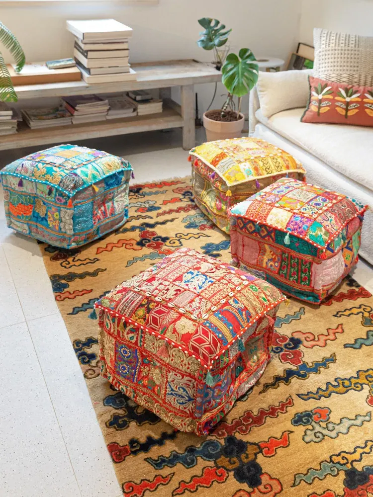 Handmade Indian Bohemian Wabi-Sabi Floor Cushion Stool - Versatile Sofa Bench, Vanity Seat, and Shoe Bench for Cozy Home Décor