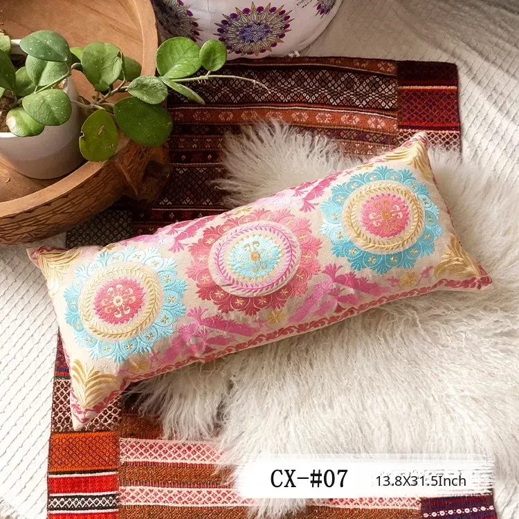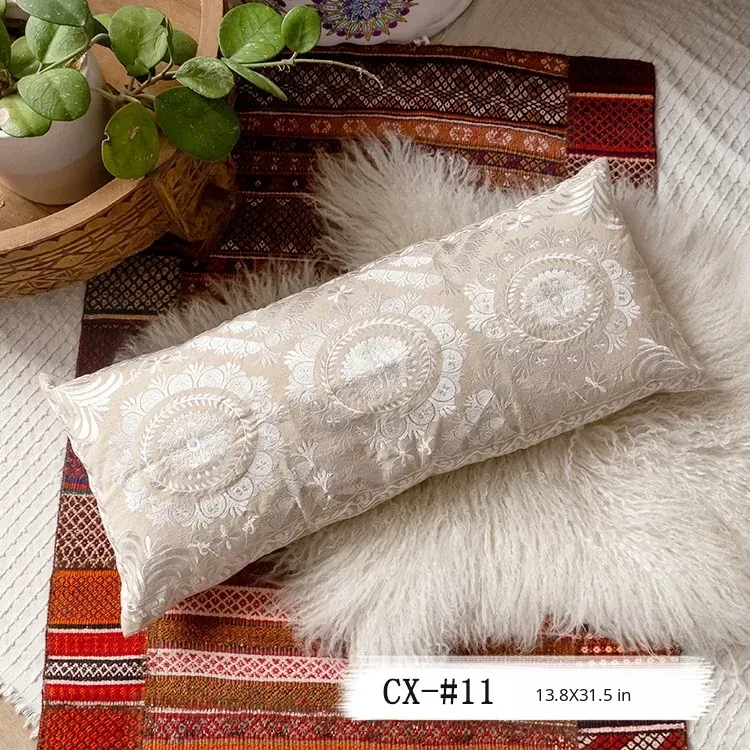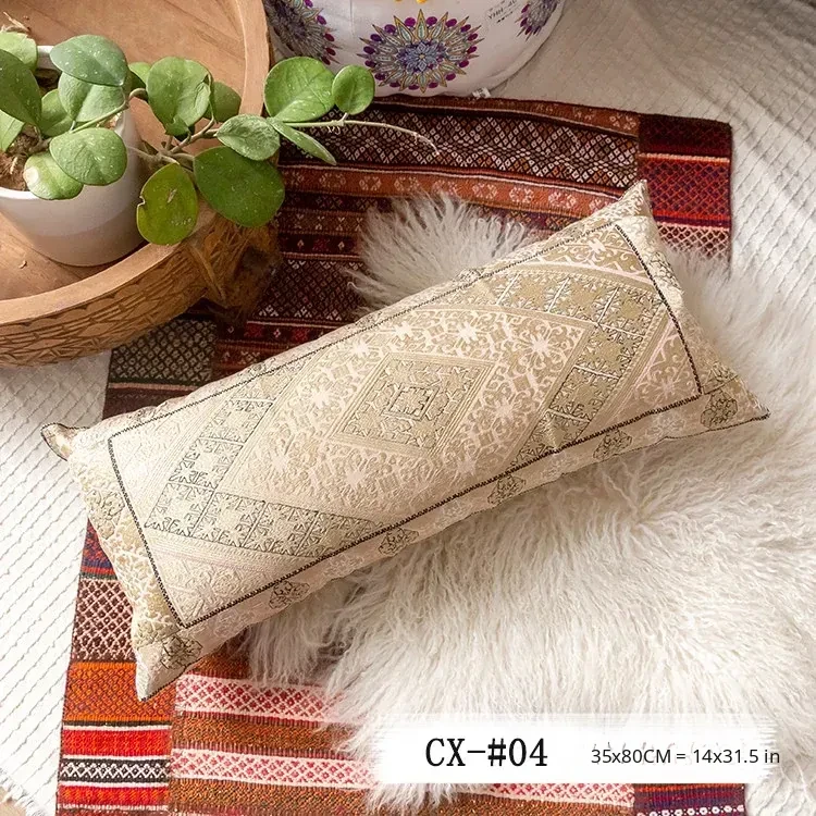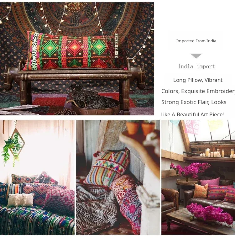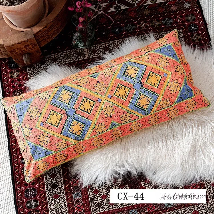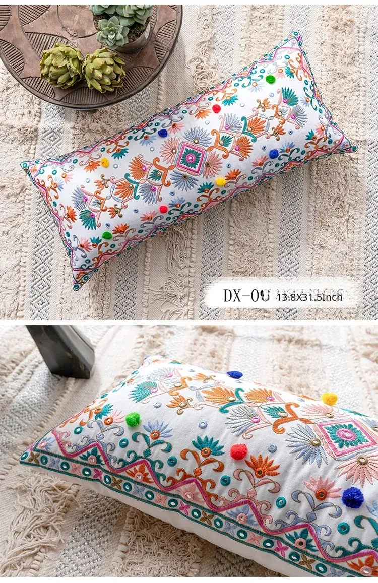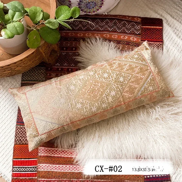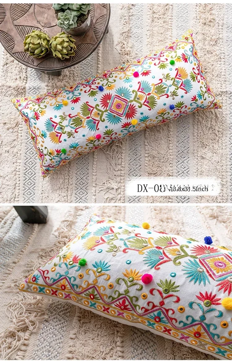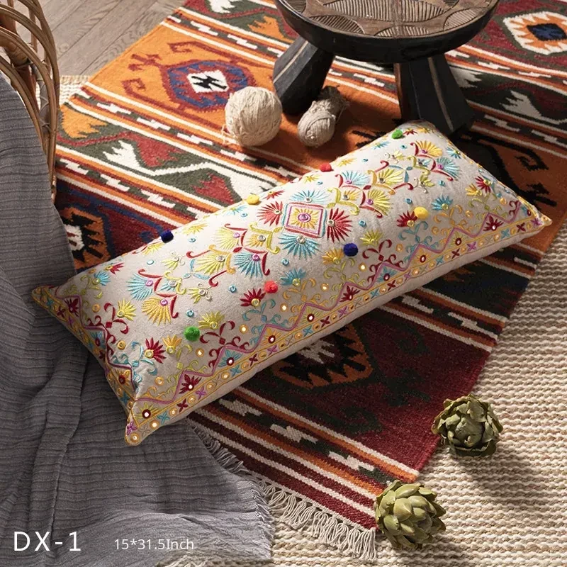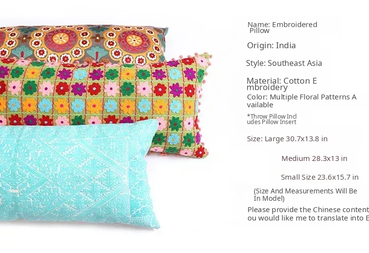 Exotic Indian Embroidered Long Pillow - Southeast Asian Ethnic Style Mix, Perfect for Bedroom Decor, Thai-Style Headboard Cushion, Ideal for Lumbar Support!