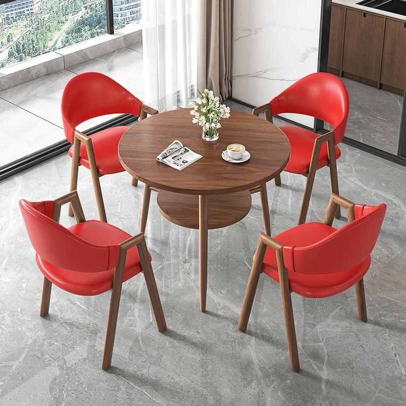 80 Round Table +4 Red Leather Chair-Walnut Foot