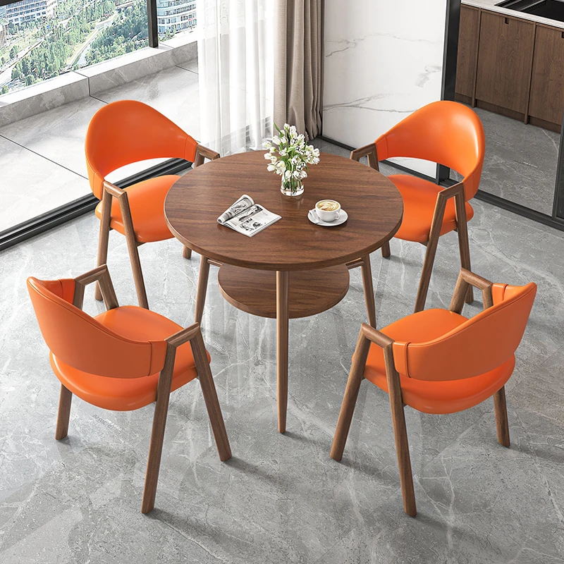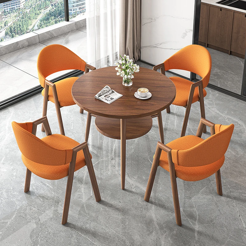80 Round Table +4 Orange Cloth Chair-Walnut Foot