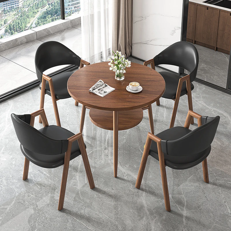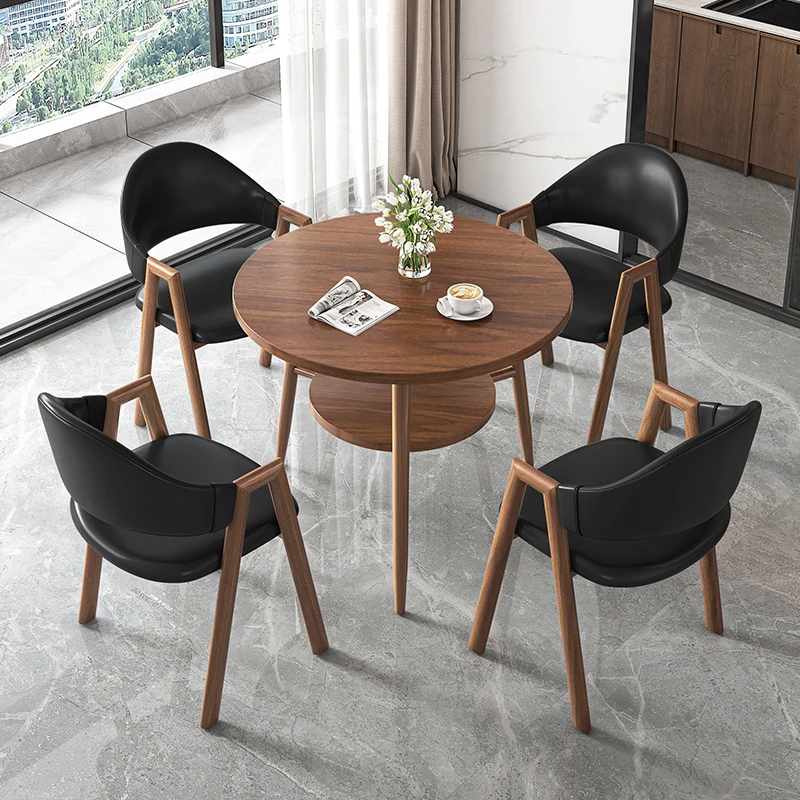 80 Round Table +4 Black Leather Chair-Walnut Foot