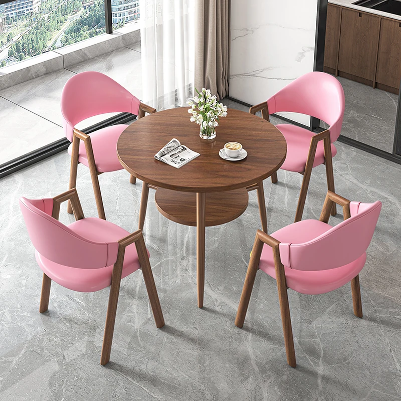 80 Round Table +4 Pink Leather Chair-Walnut Foot