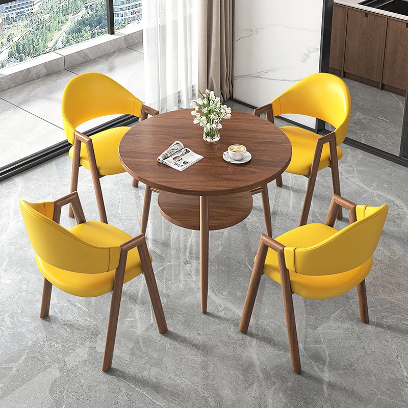 80 Round Table +4 Yellow Leather Chair-Walnut Foot