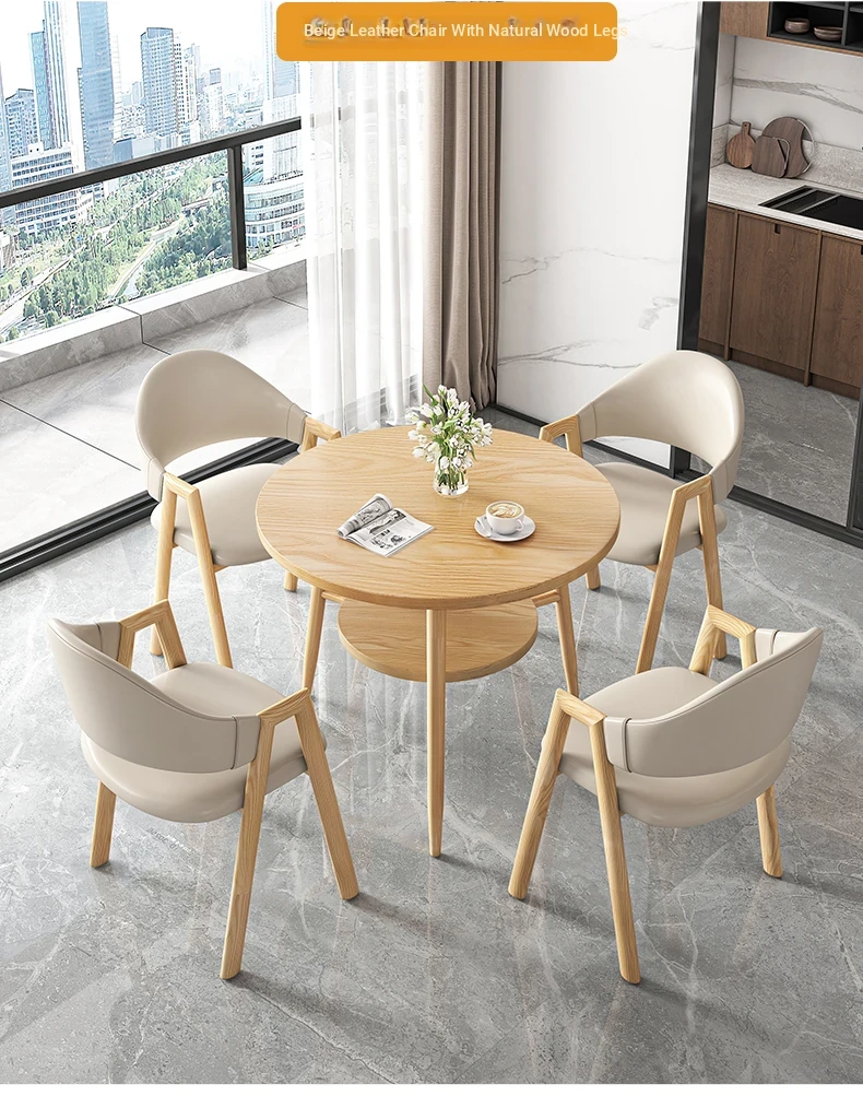 80 Round Table +4 Beige Leather Chair-Log Color Foot
