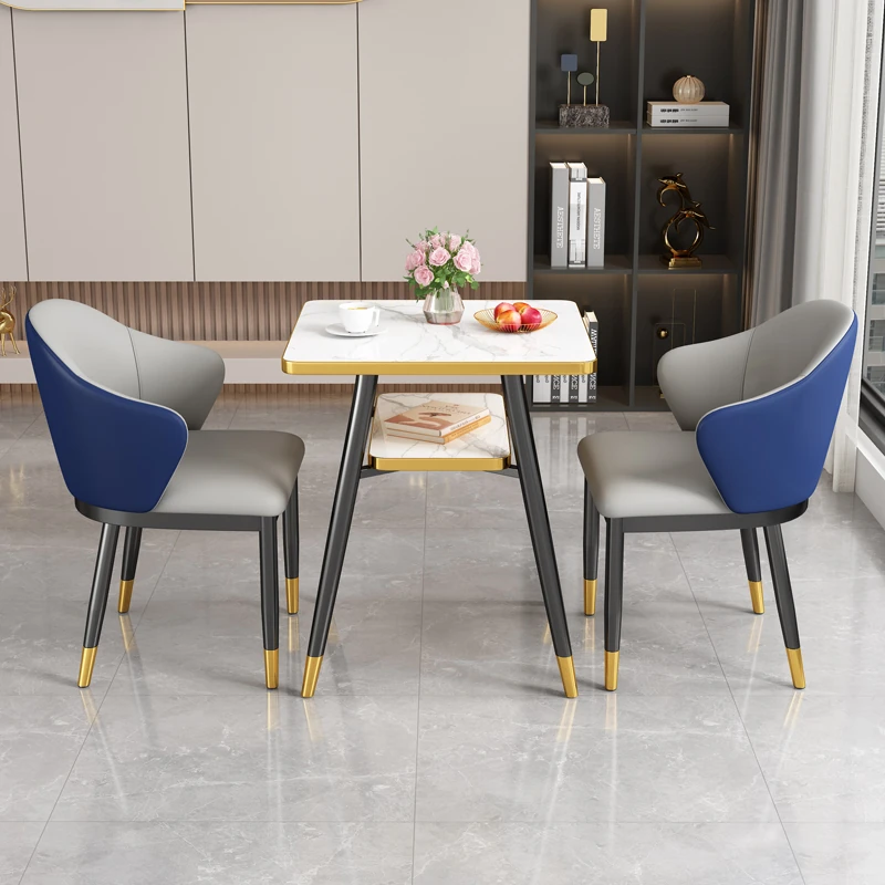 Dark blue gray 60 imitation marble square table +2 leather chairs