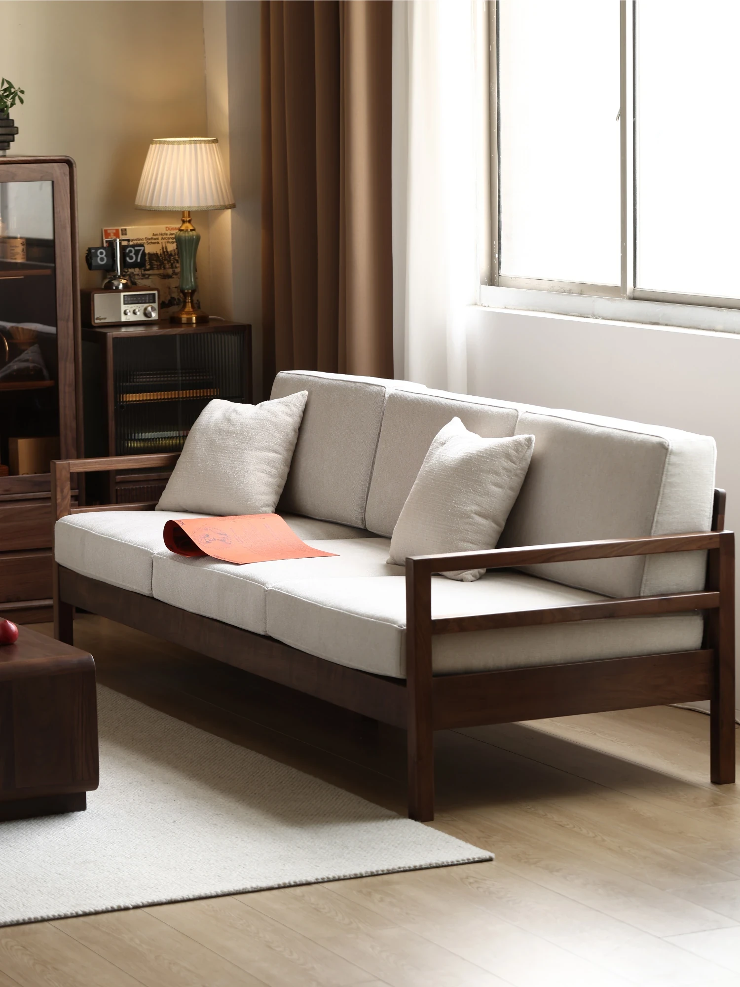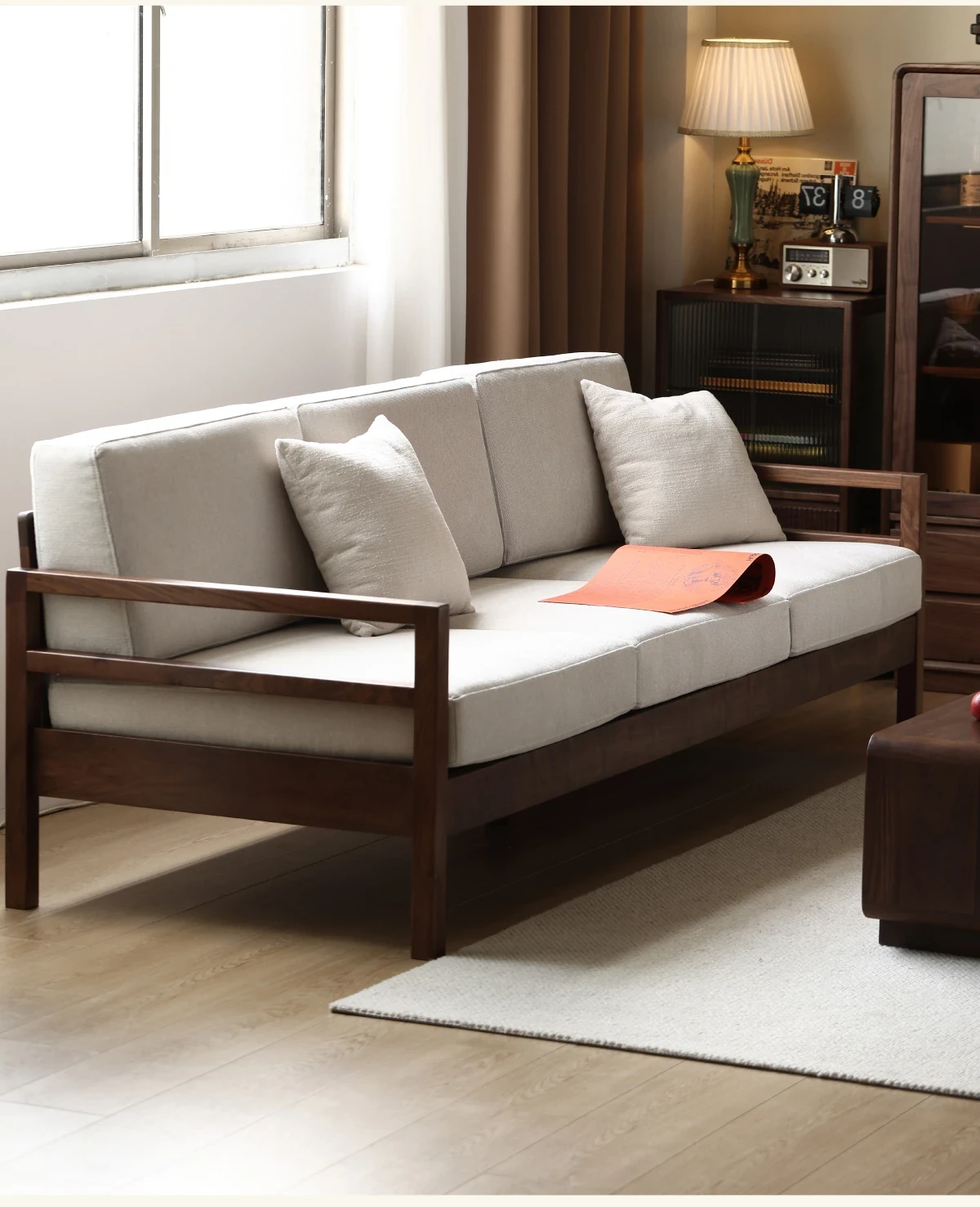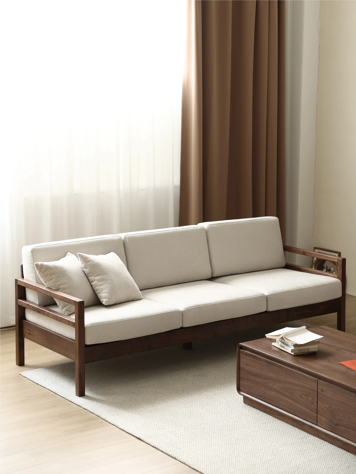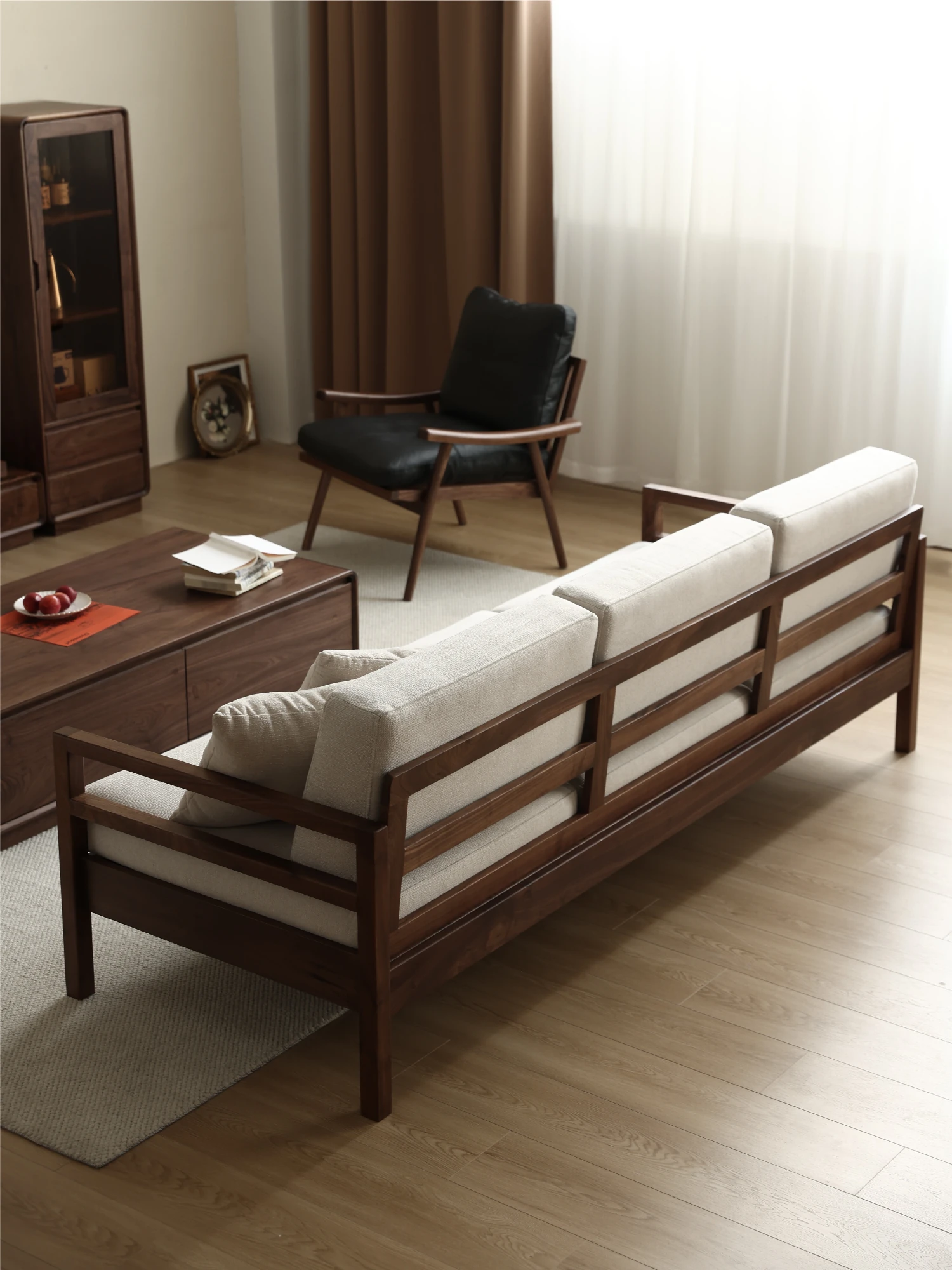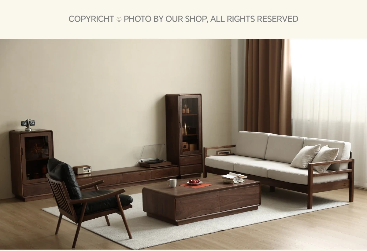 Modern Nordic Solid Wood Sofa in North American Black Walnut - Minimalist Design for Small Spaces, Perfect for Year-Round Comfort!