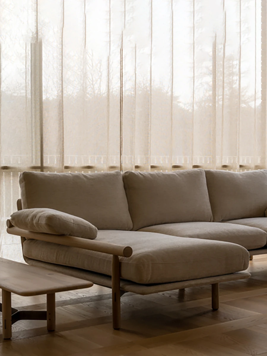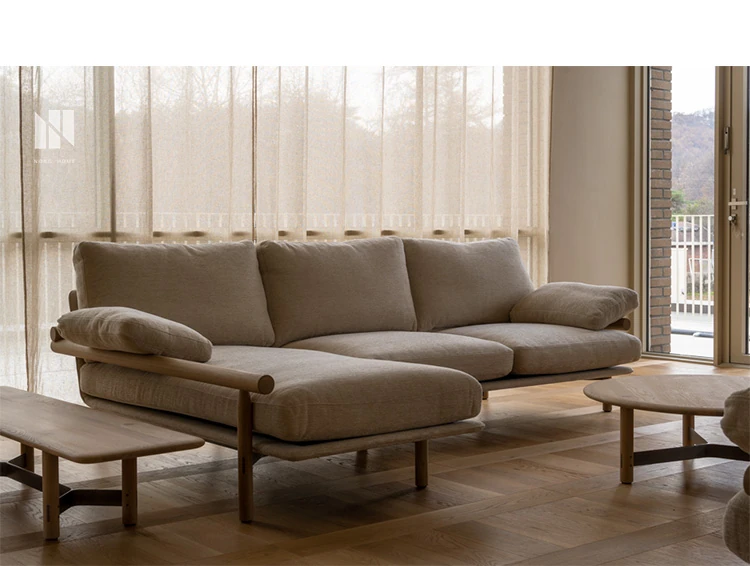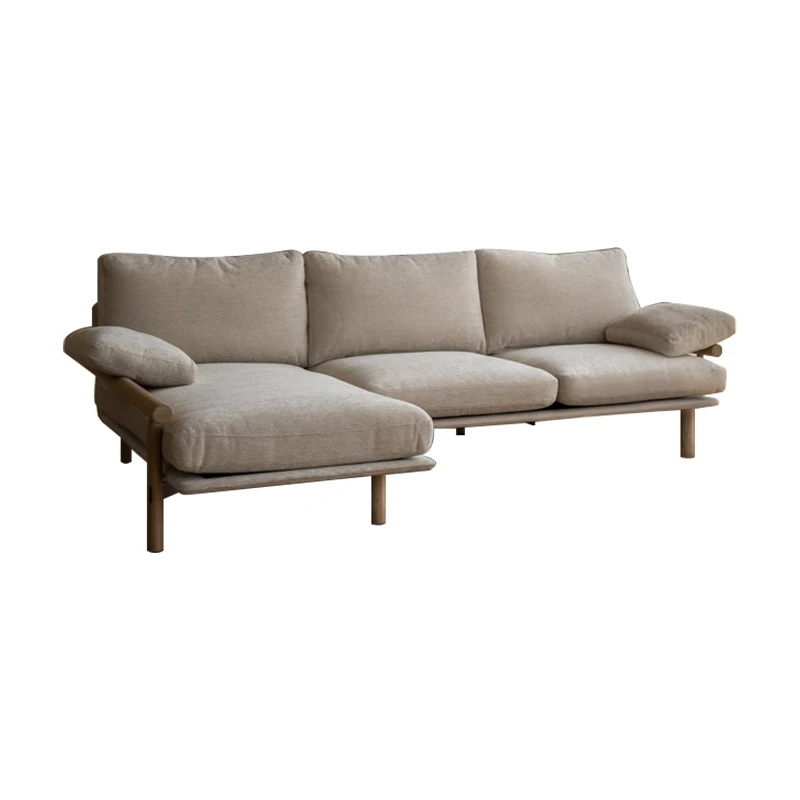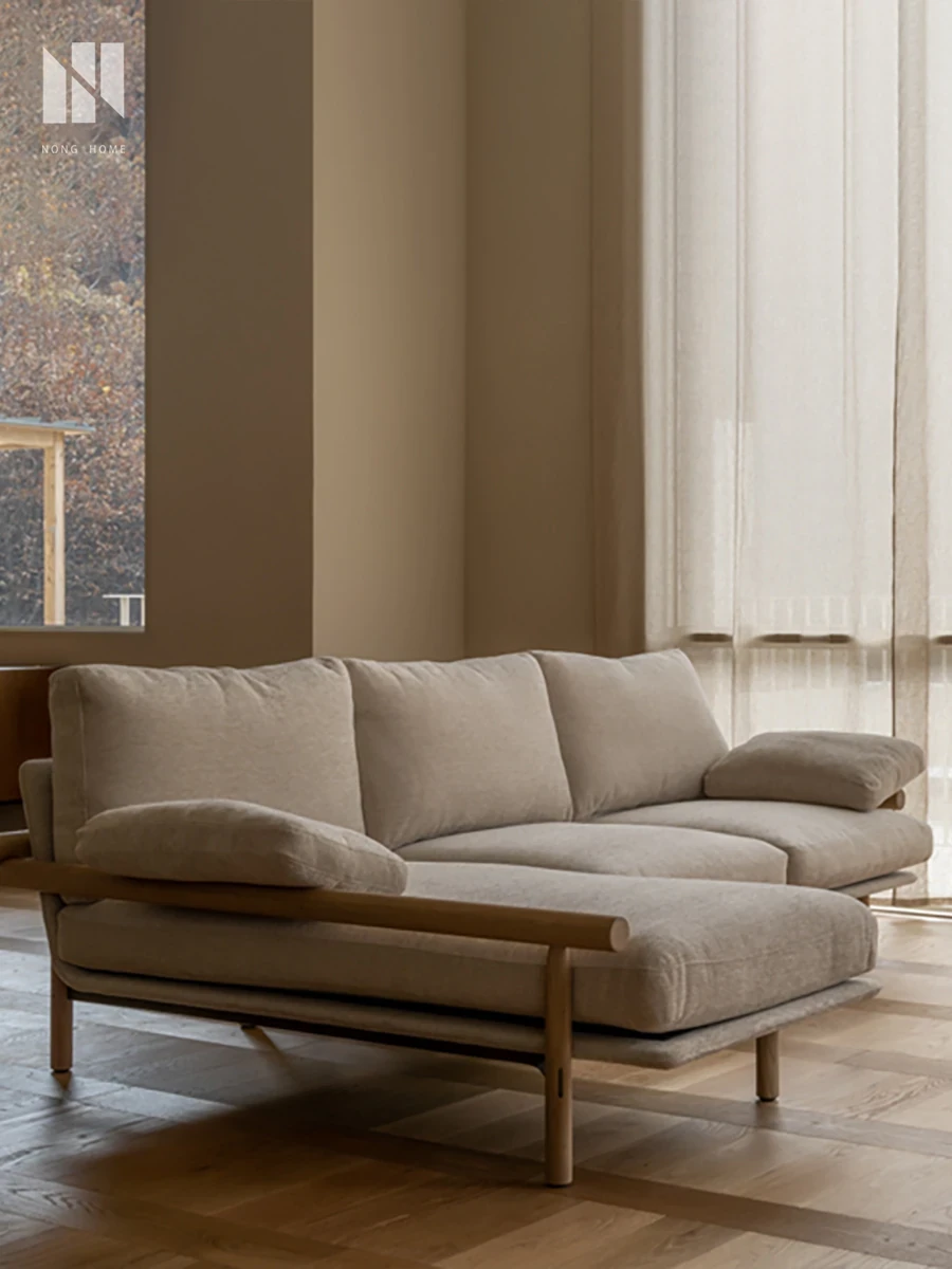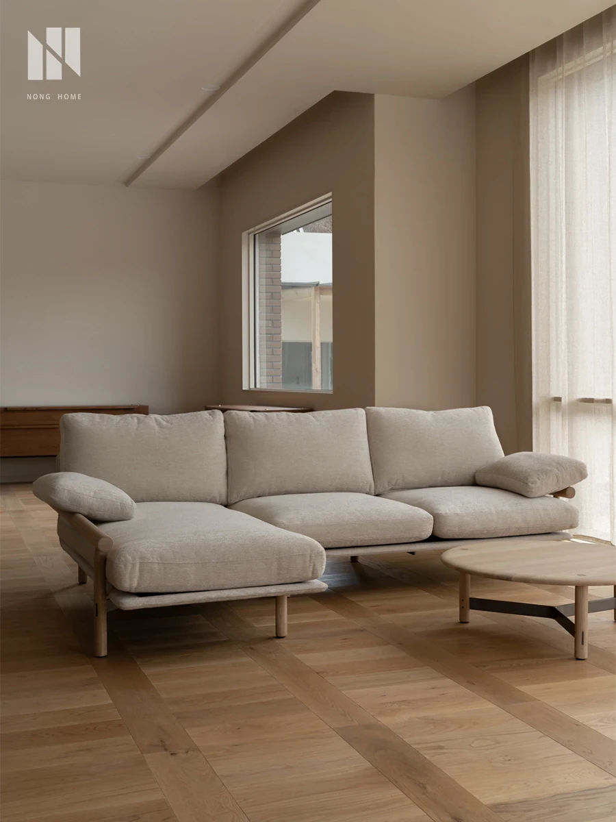 Nongju Retro Solid Wood Sofa - Stylish Three-Seater Fabric Sofa for Living Room, Japanese Minimalist L-Shaped Design in Natural Wood Finish