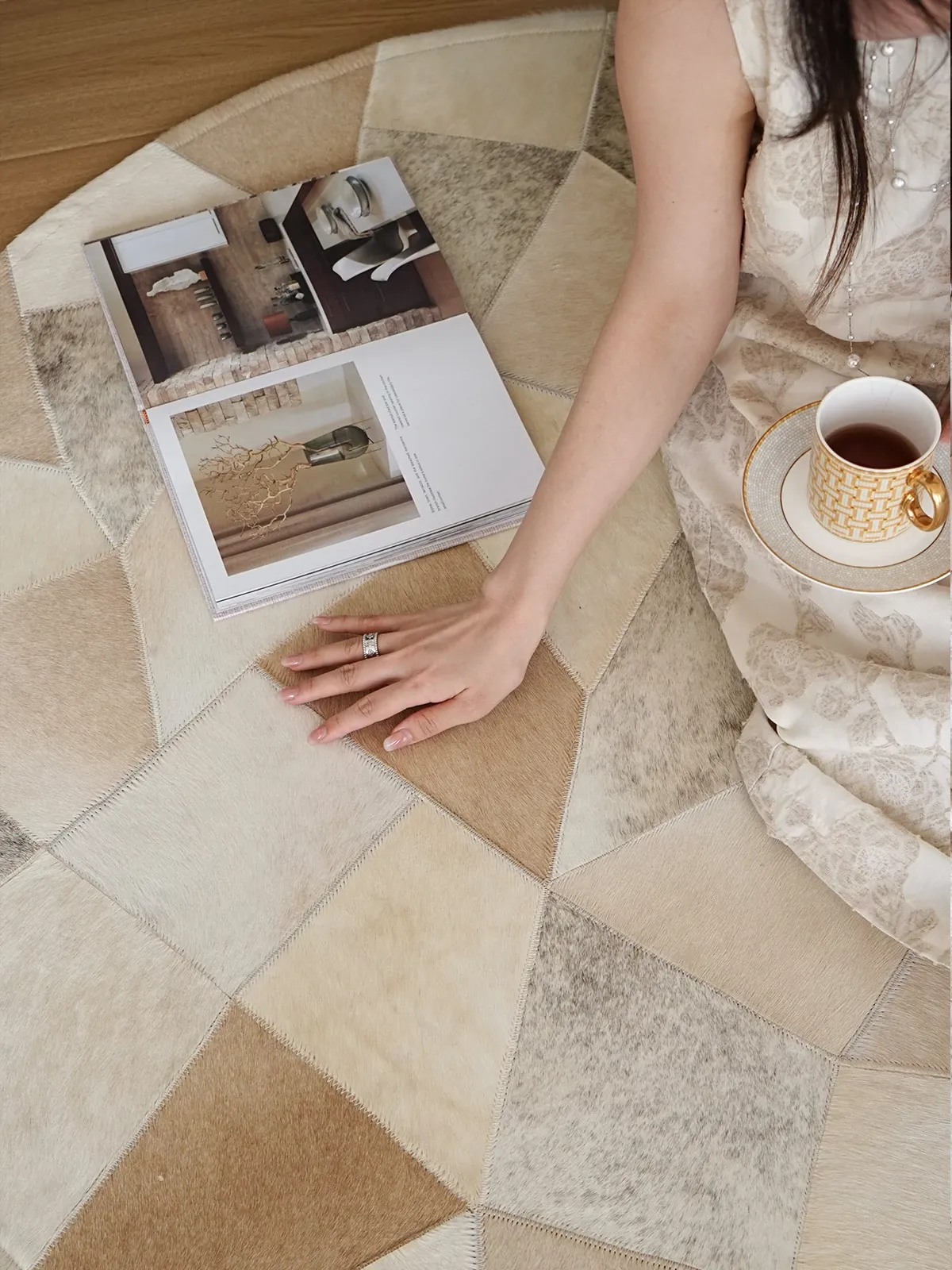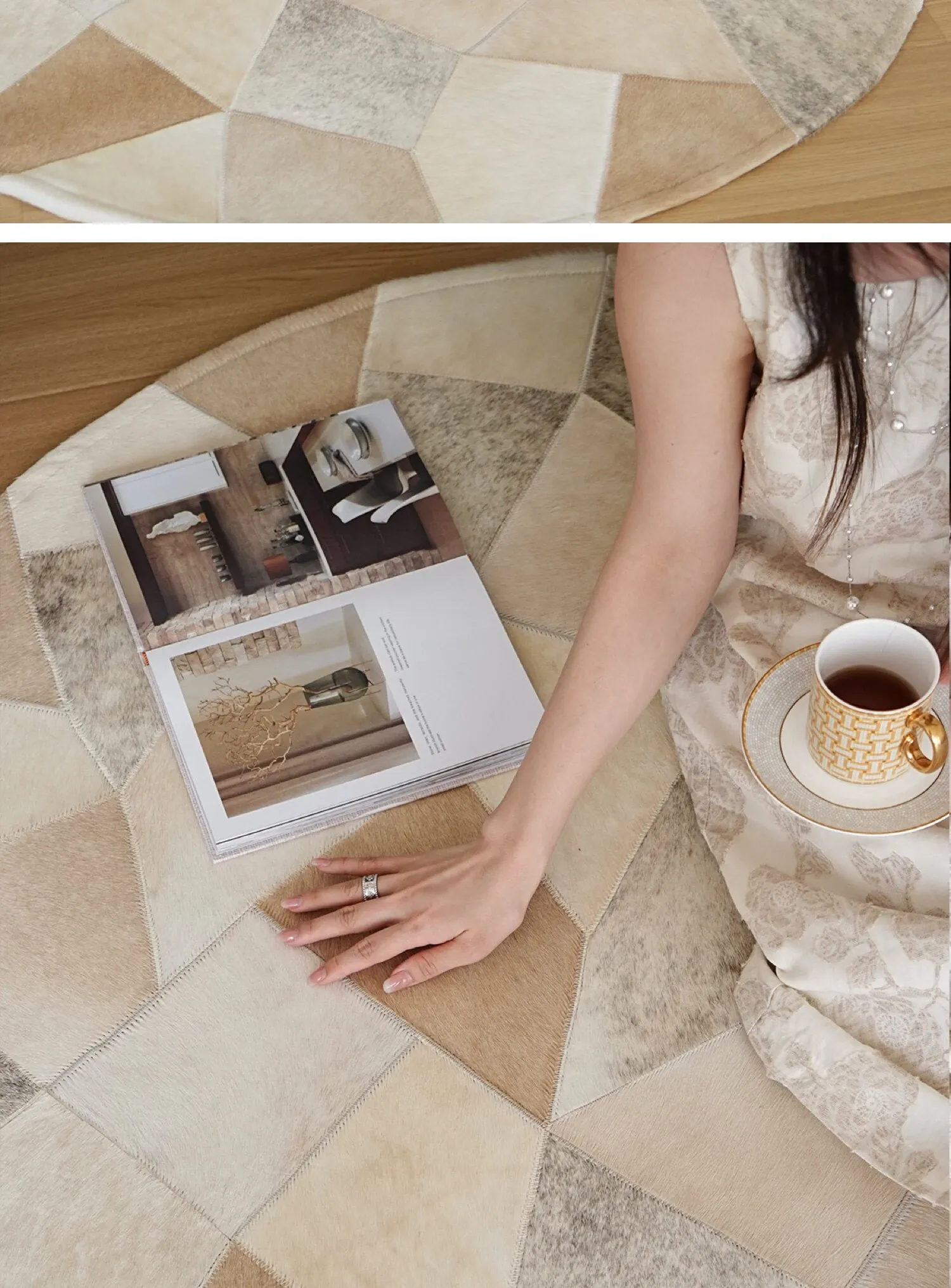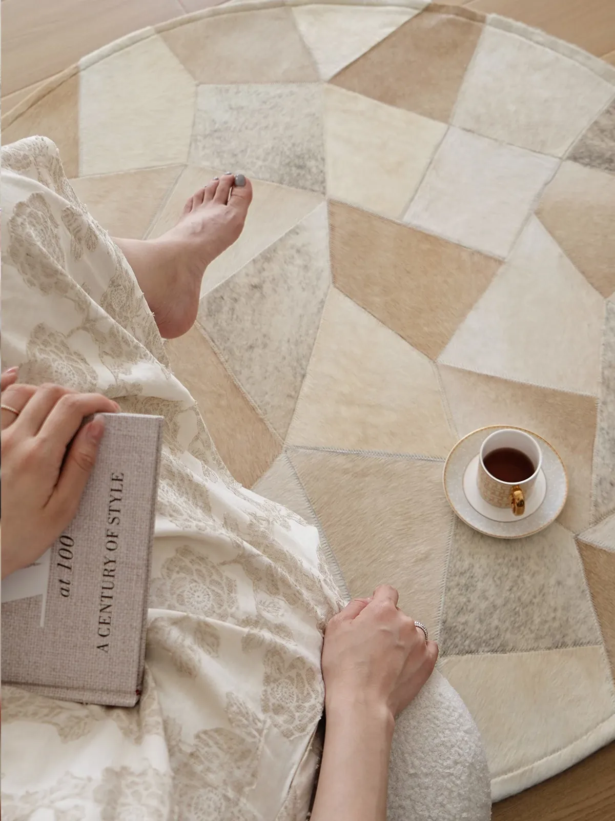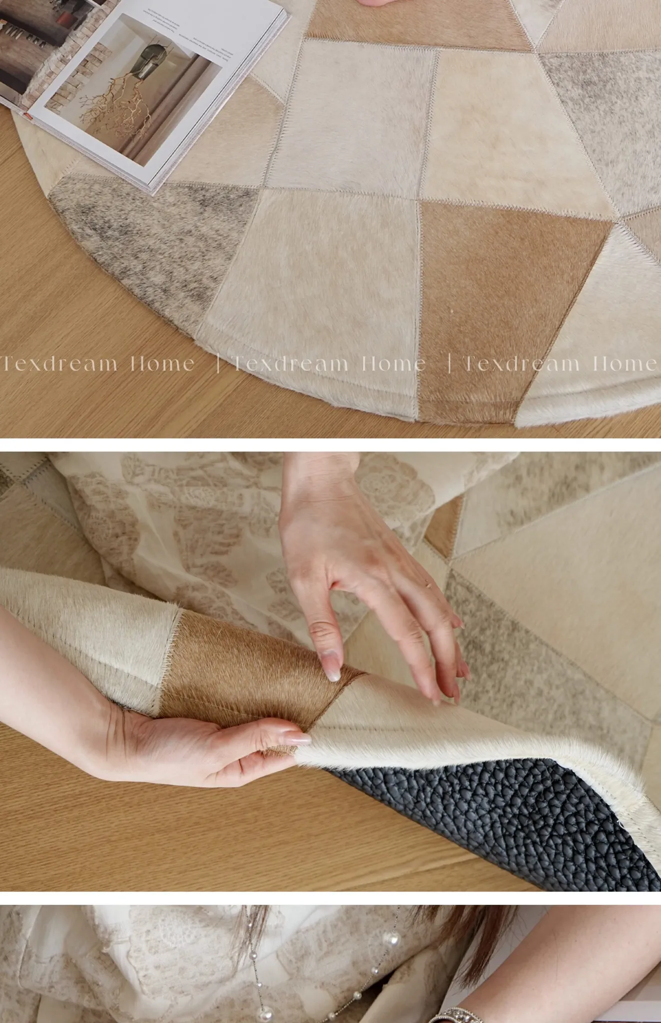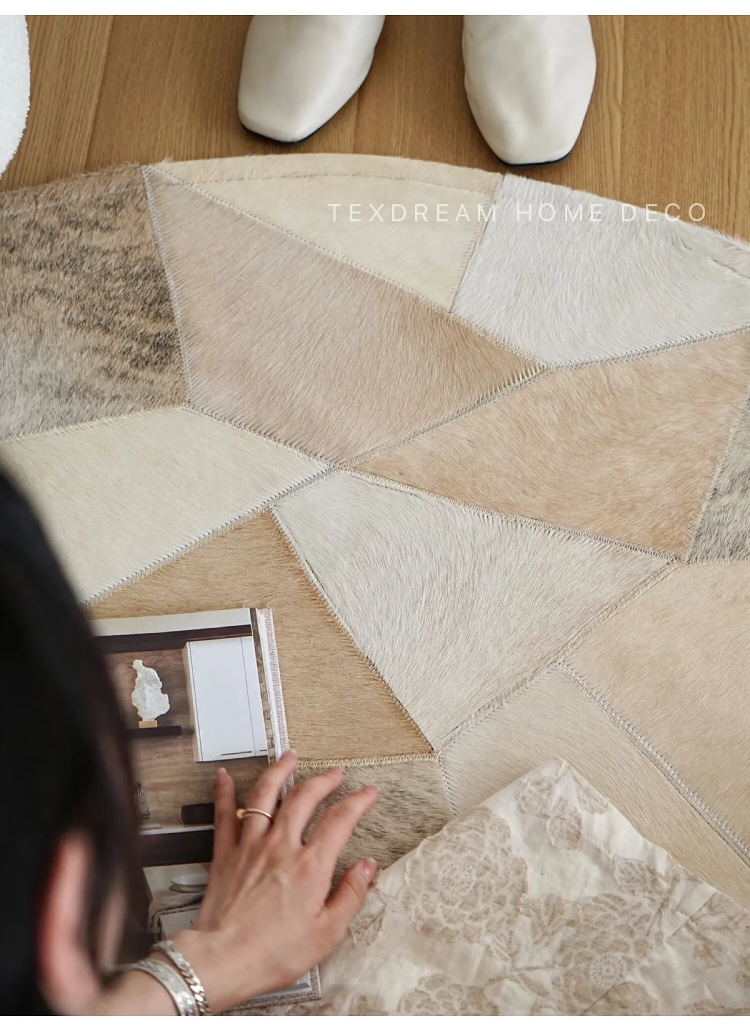 Texdream Attitude Danish Cowhide Patchwork Rug - Elegant French-style Round Carpet for Living Room, Coffee Table, and Dressing Room - Luxurious and Chic Home Decor Solution