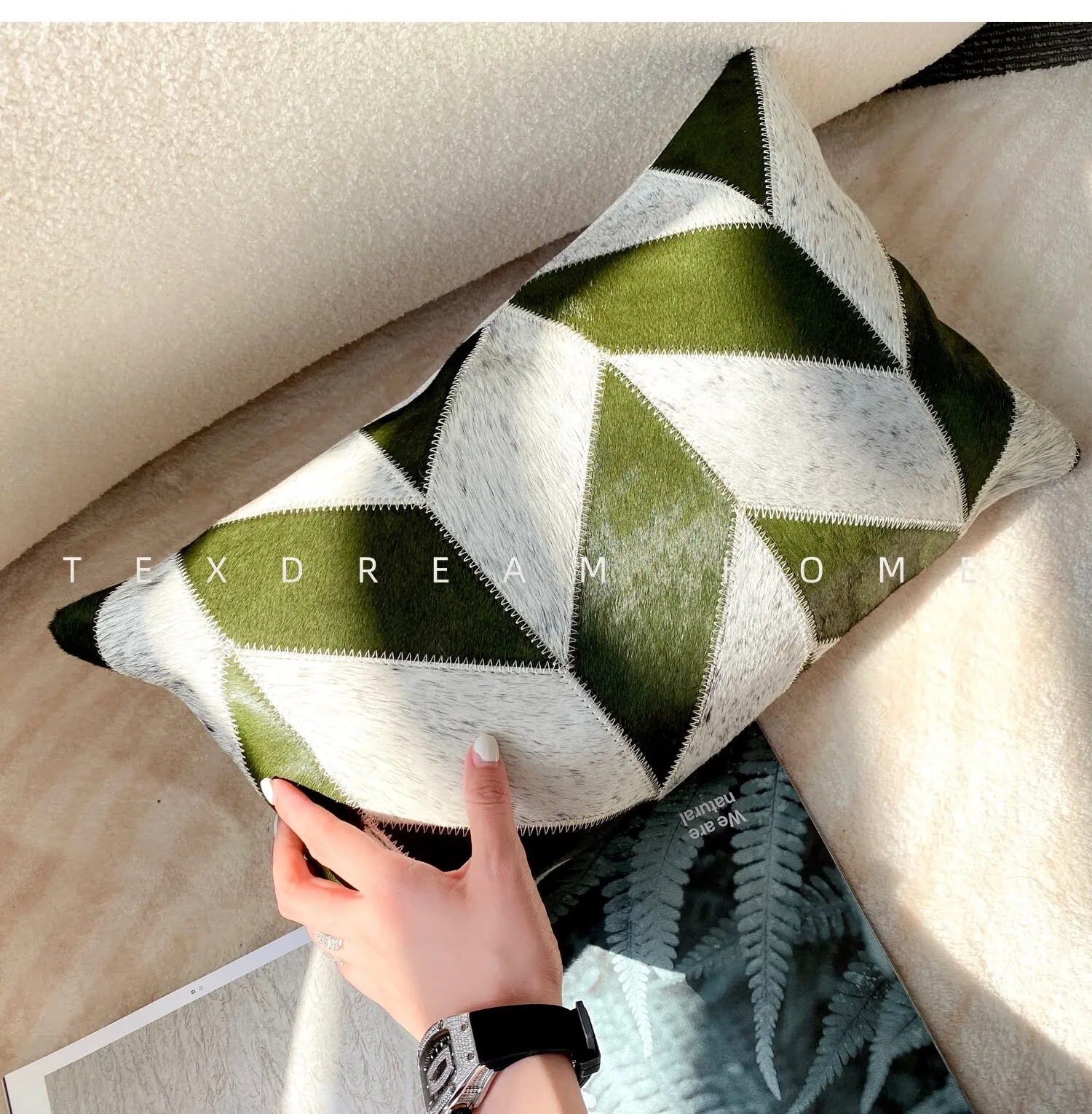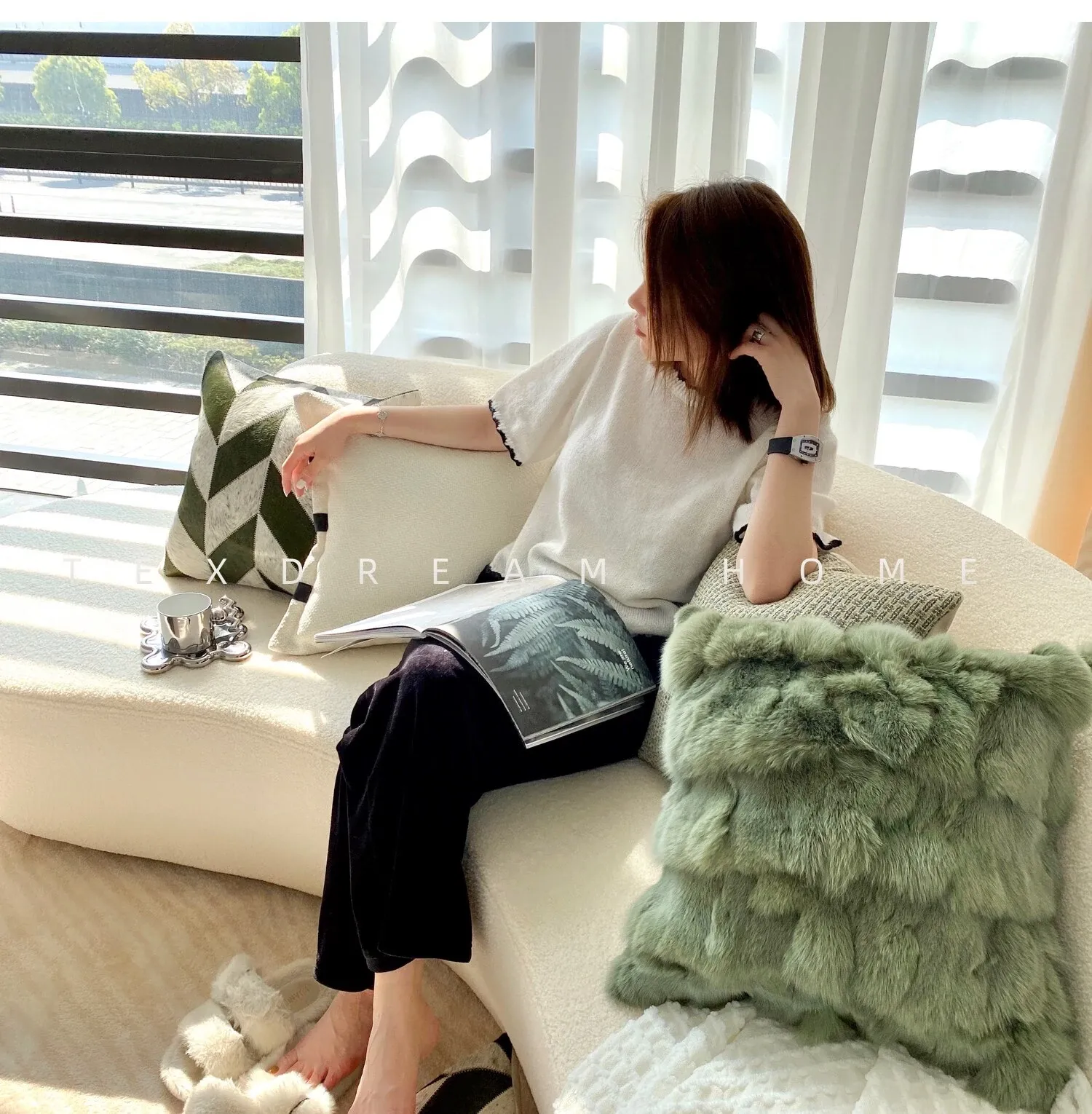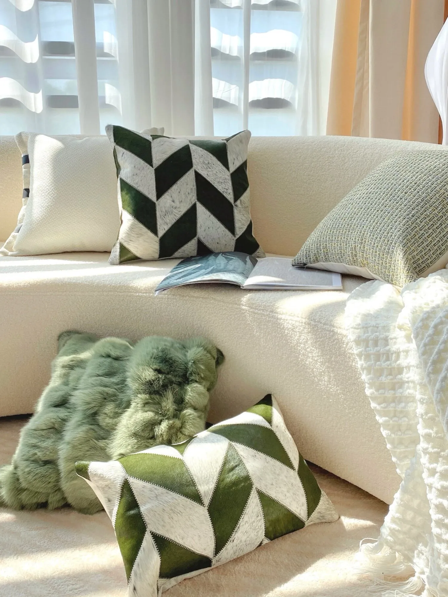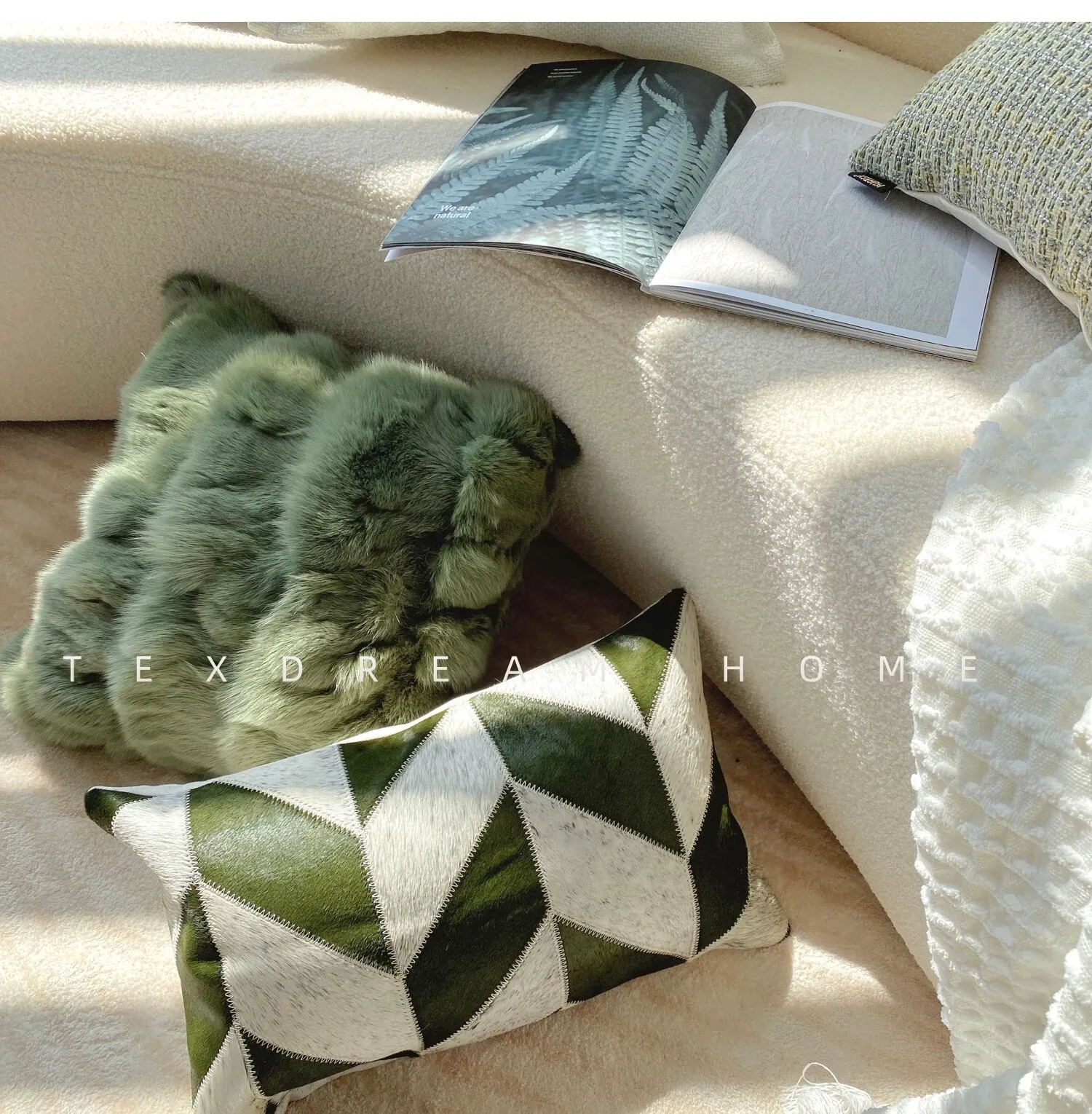 Texdream Attitude Martini Green Luxury Genuine Leather Fox Fur Sofa Pillow - Chic Cushion for Living Room Comfort