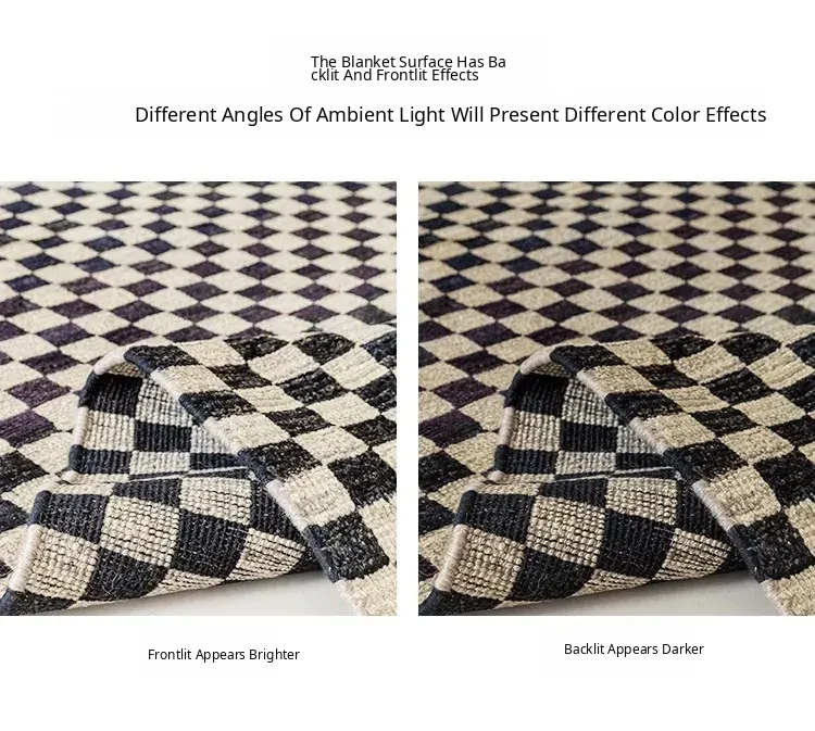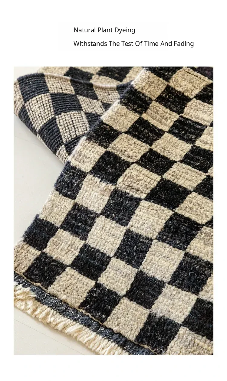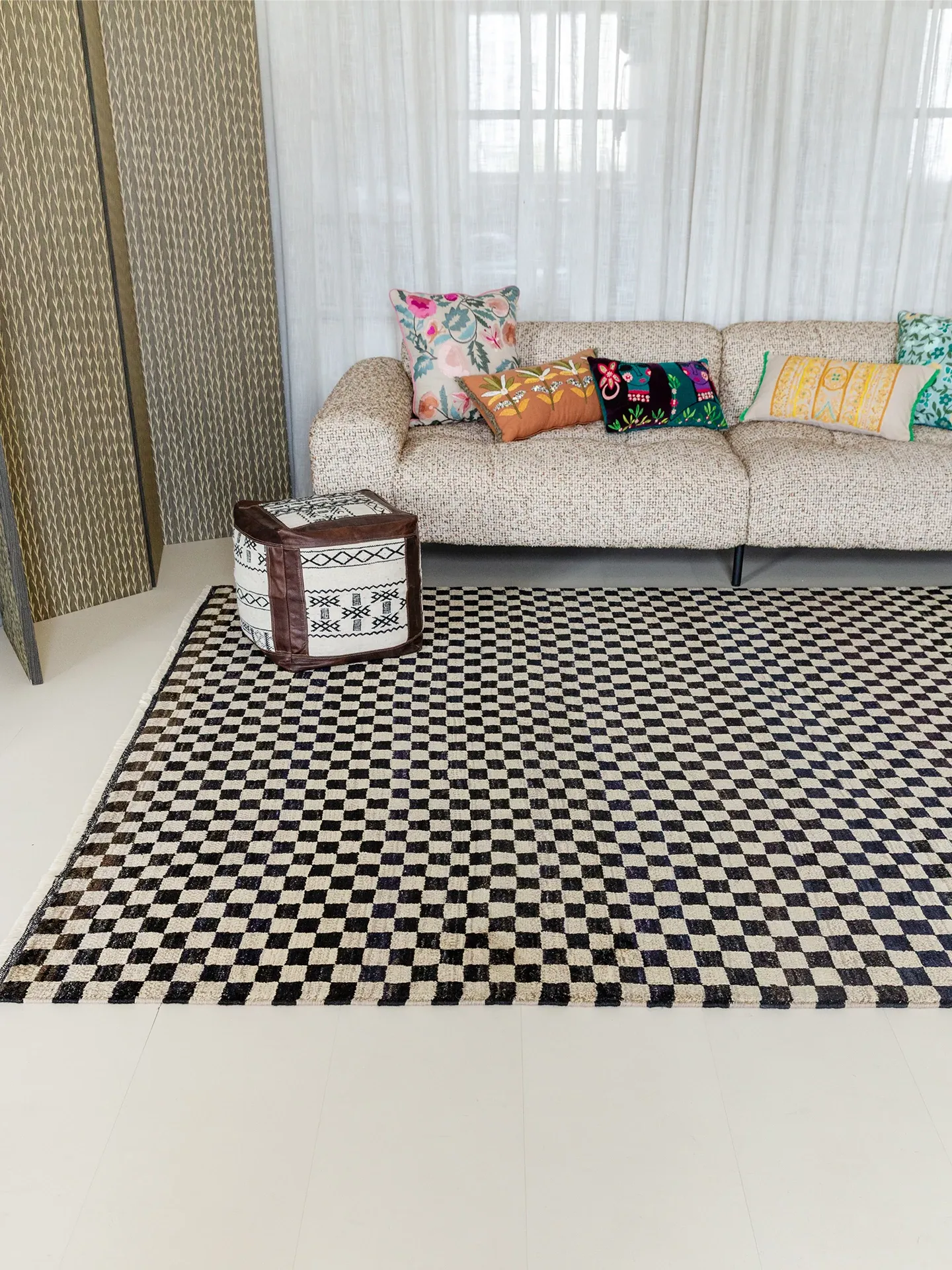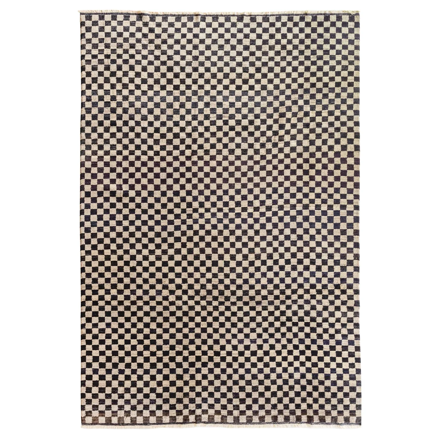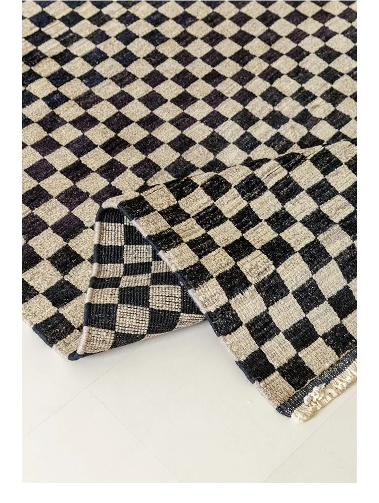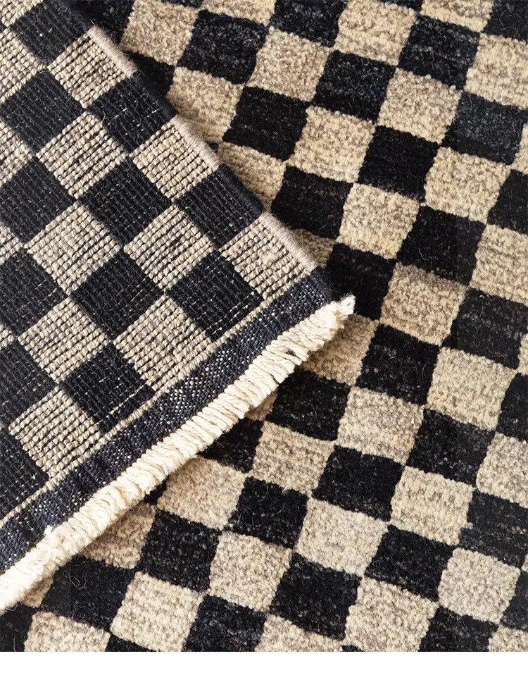 "Visual Delight: Handmade Afghan Wool Carpet - Classic Black and White Chessboard Design for Your Vintage Living Room"