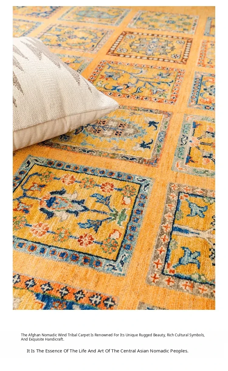 Visual Delight: Handwoven Vintage Afghan Wool Carpet - Golden Tribal Design for Living Room Elegance