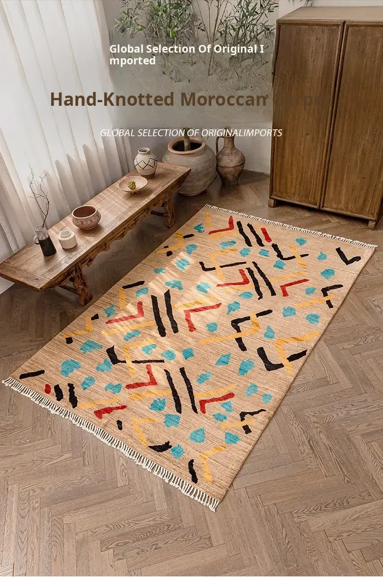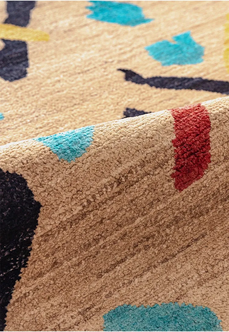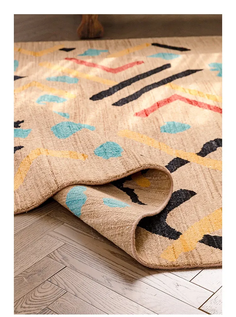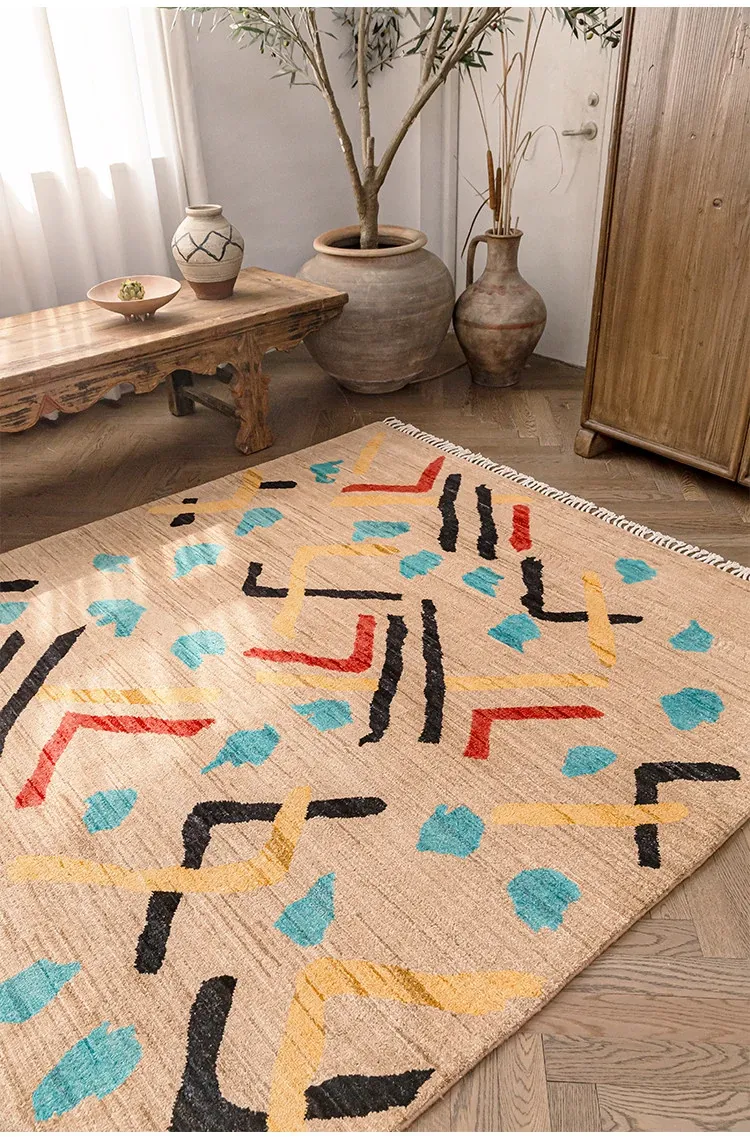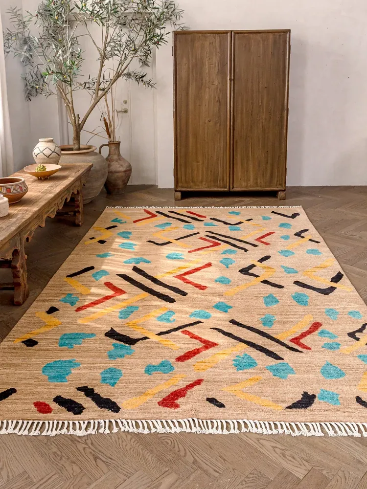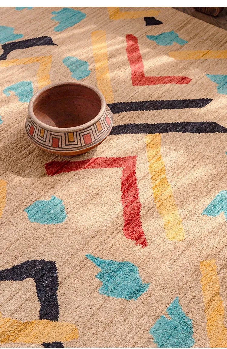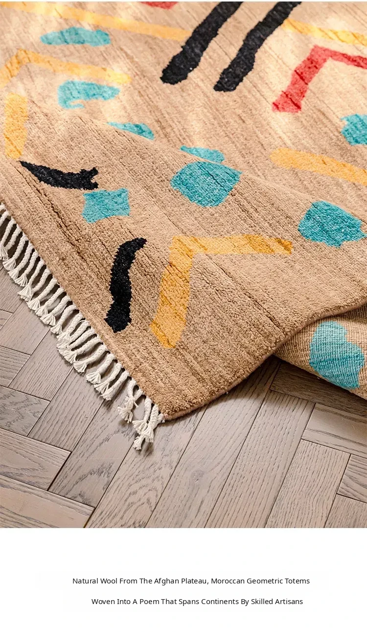 Visual Flavor: Hand-Knotted Afghan Wool Rug - Modern Wabi-Sabi Style, Colorful Living Room Carpet, Imported Elegance