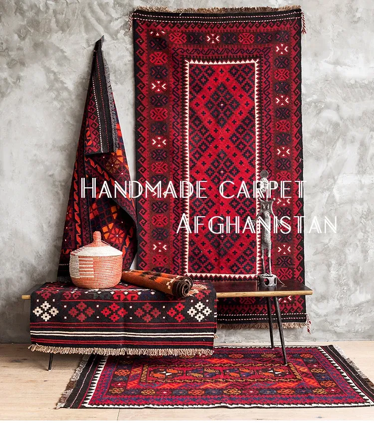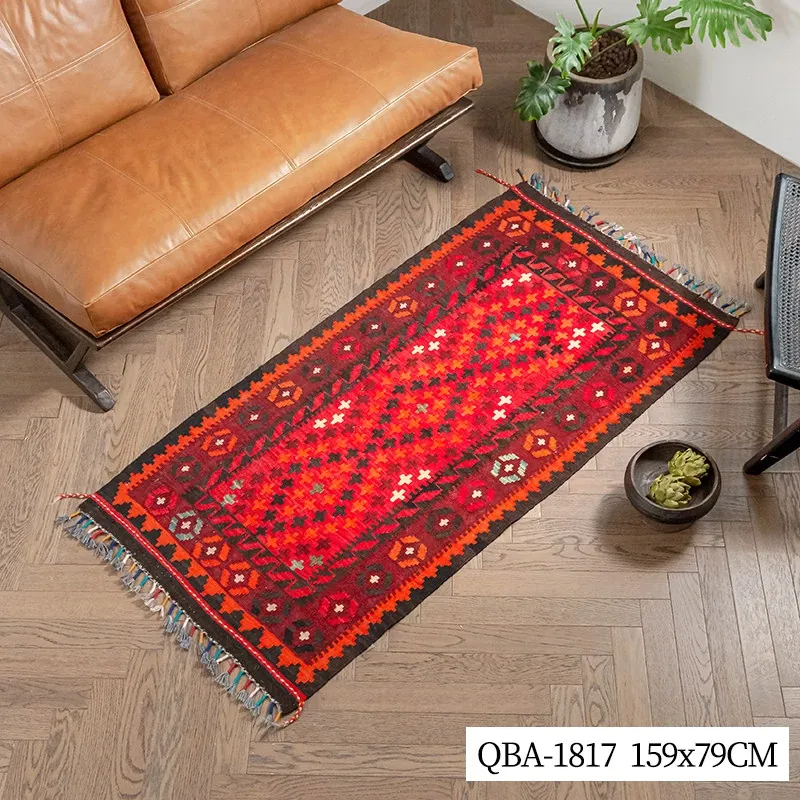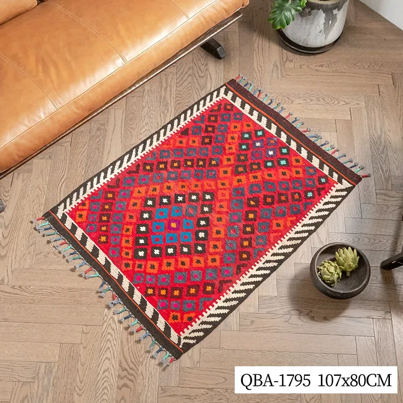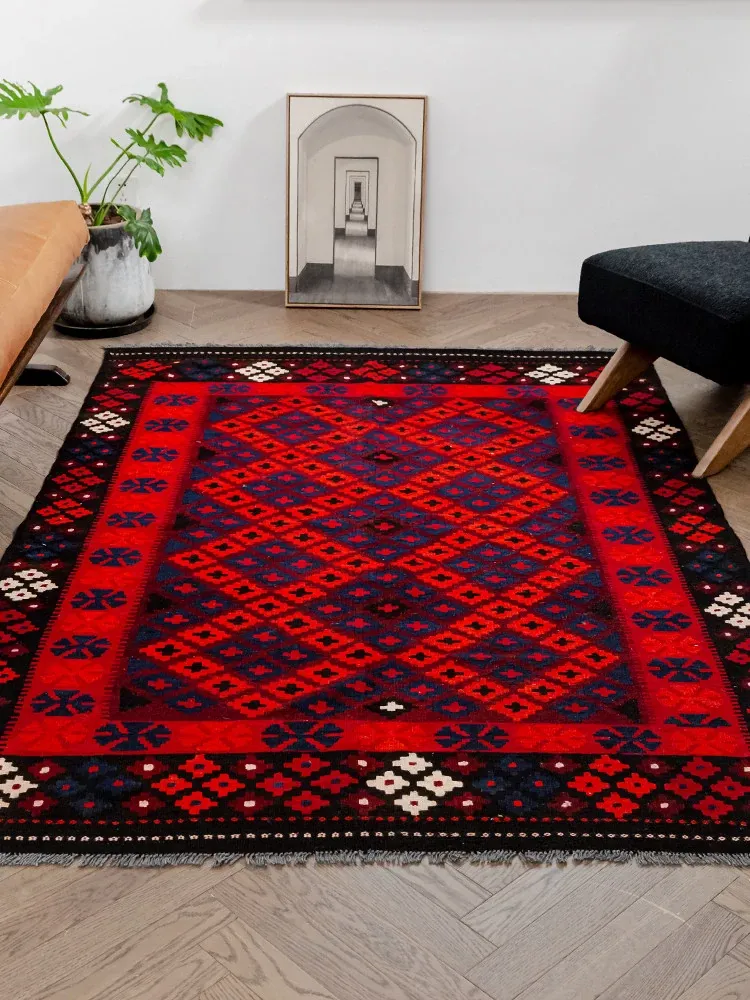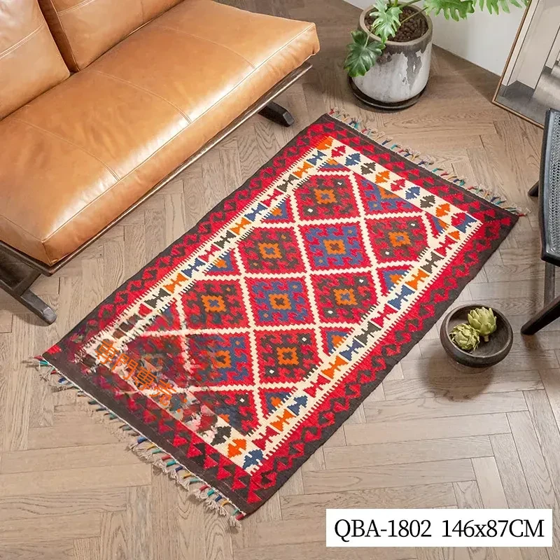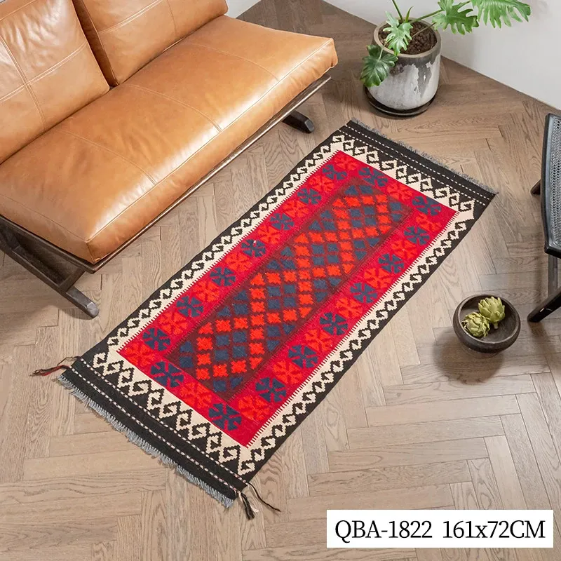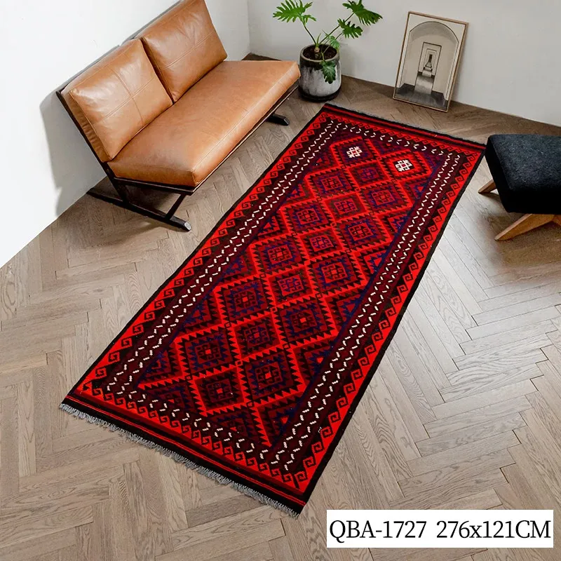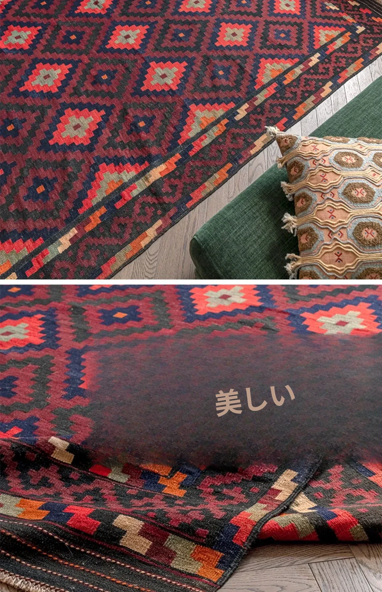 アフガニスタン直輸入の手作りウールレッドキリム!ボヘミアンスタイルのリビングルームにぴったりな個性的なタペストリー&カーペットマット。おしゃれで温かみのある空間を演出します!
