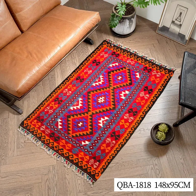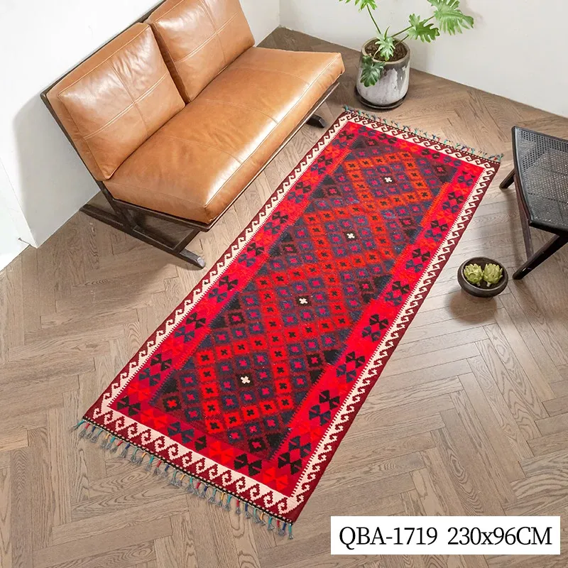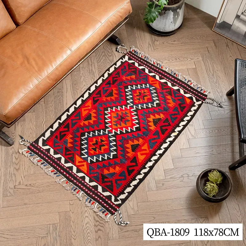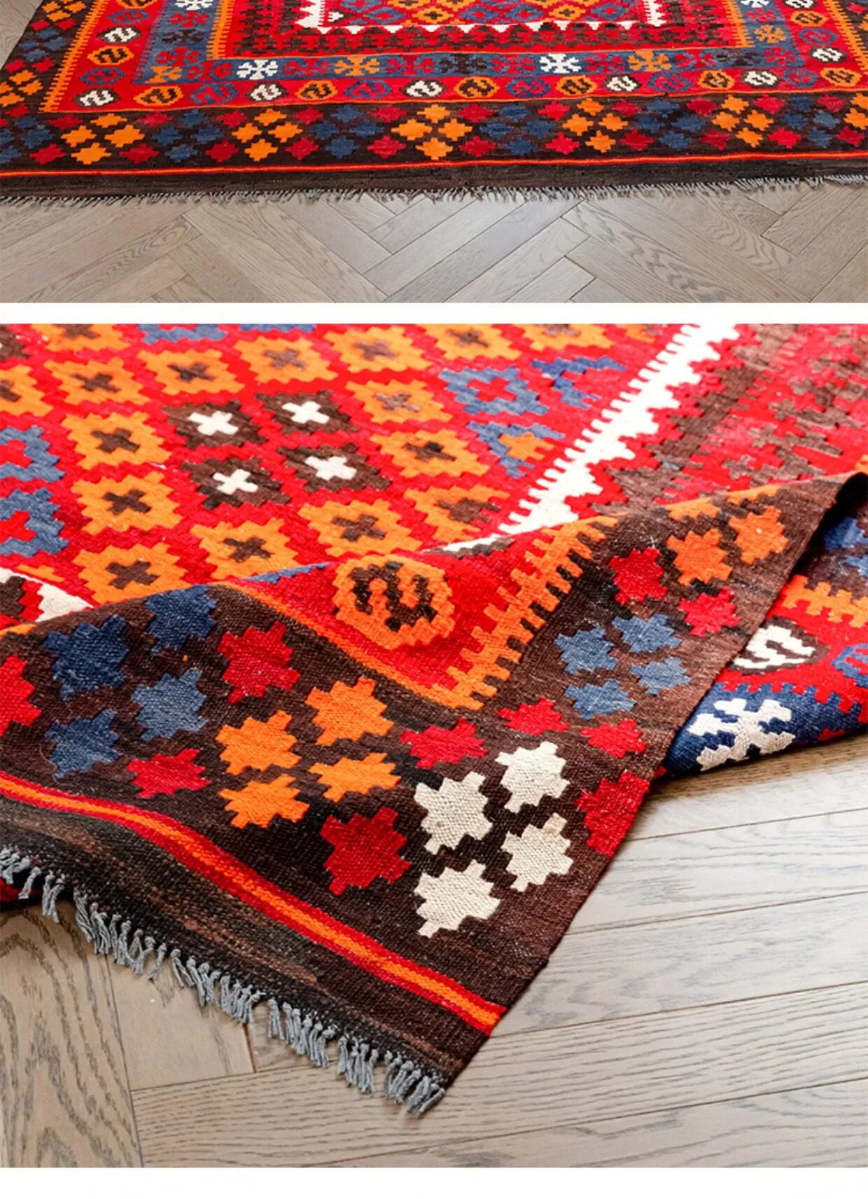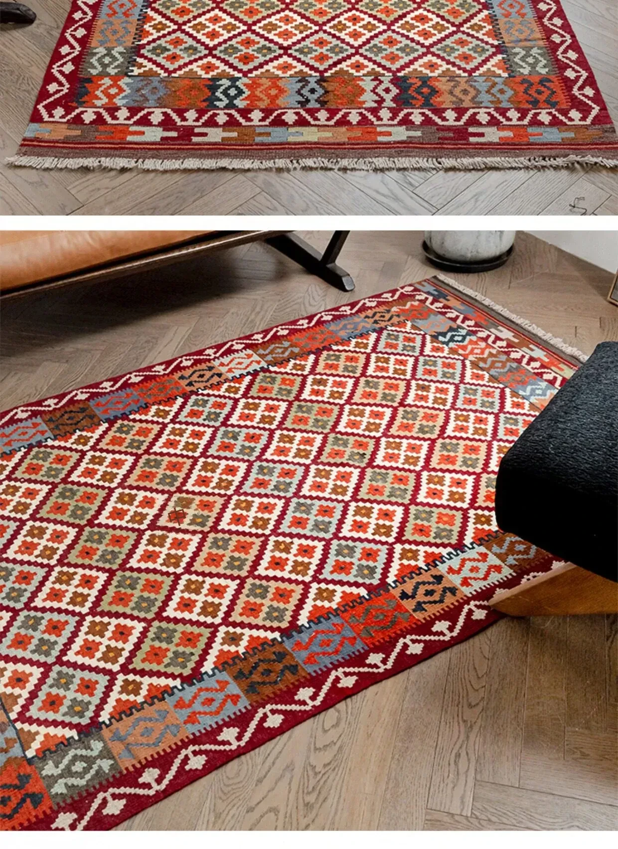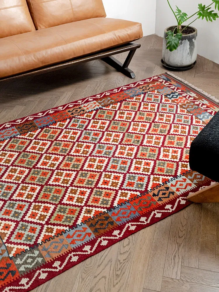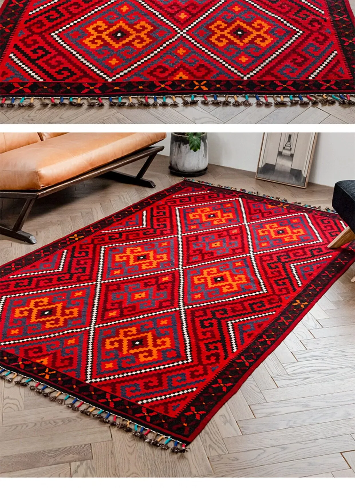 アフガニスタン直輸入の手作りウールレッドキリム!ボヘミアンスタイルのリビングルームにぴったりな個性的なタペストリー&カーペットマット。おしゃれで温かみのある空間を演出します!