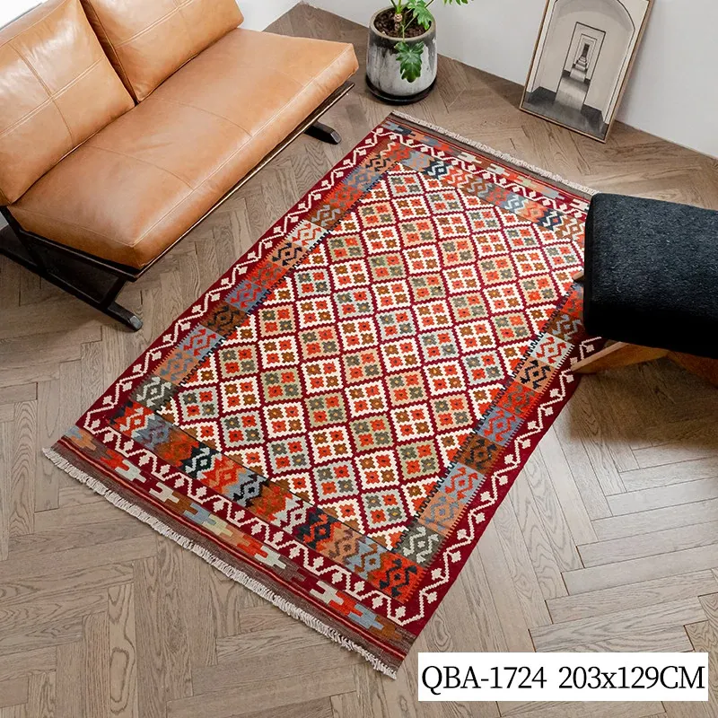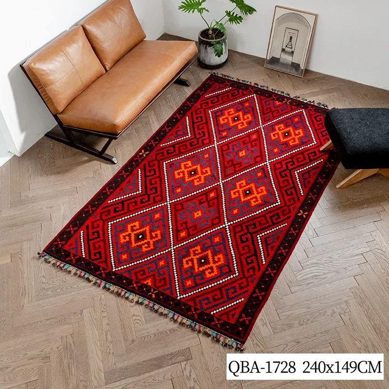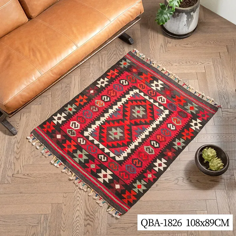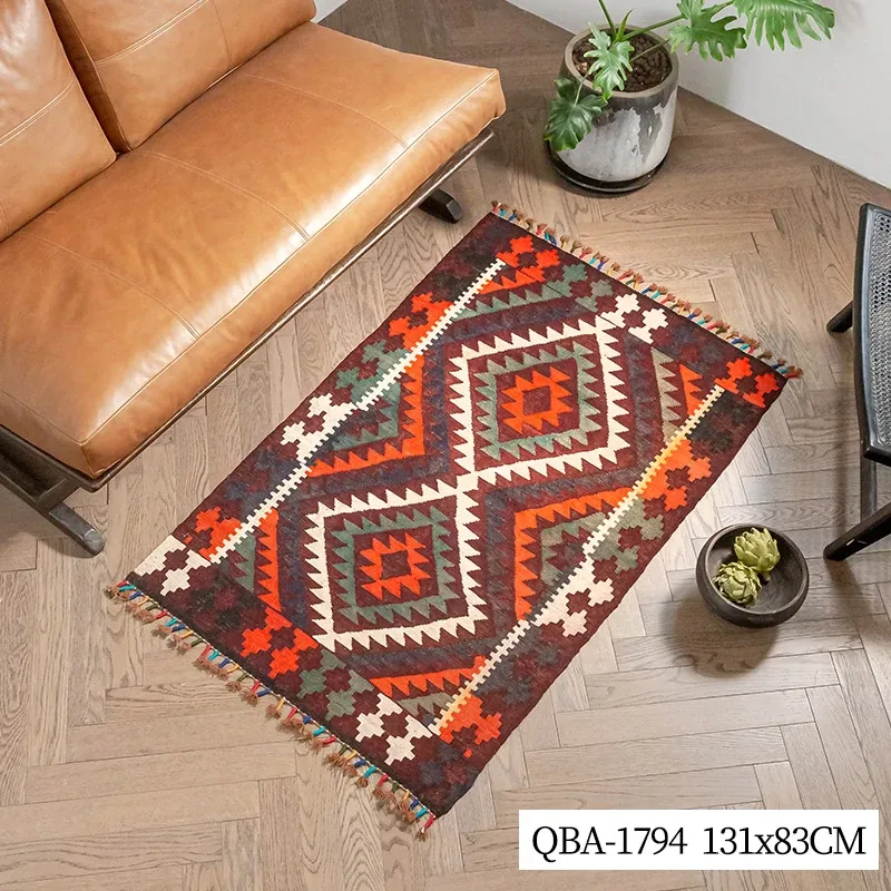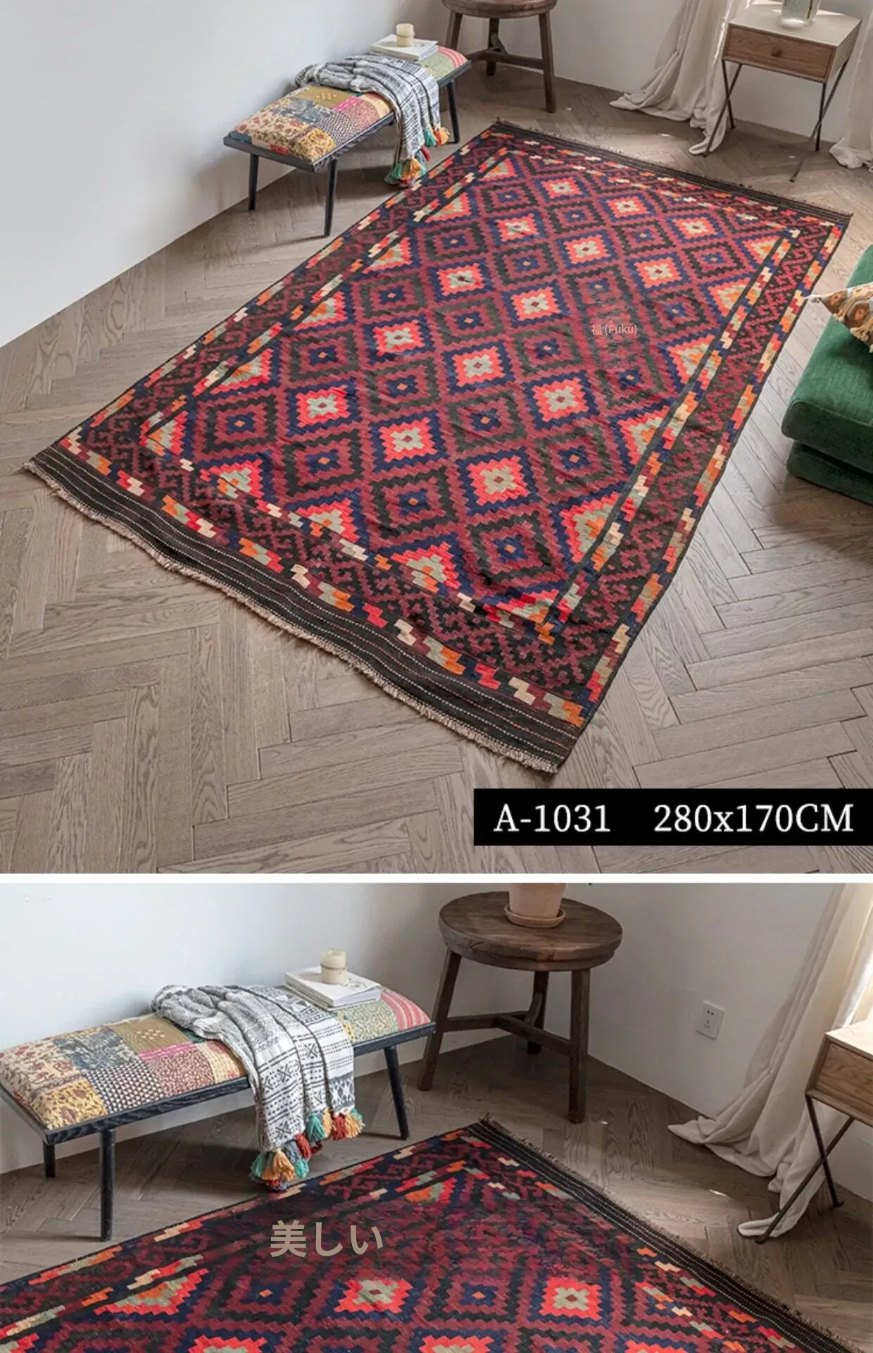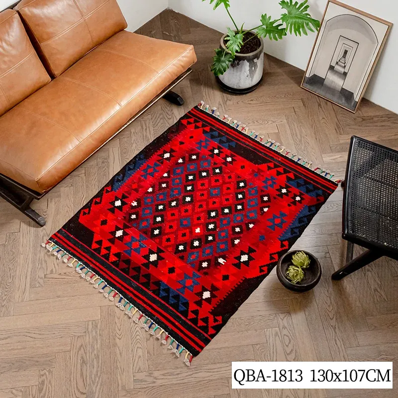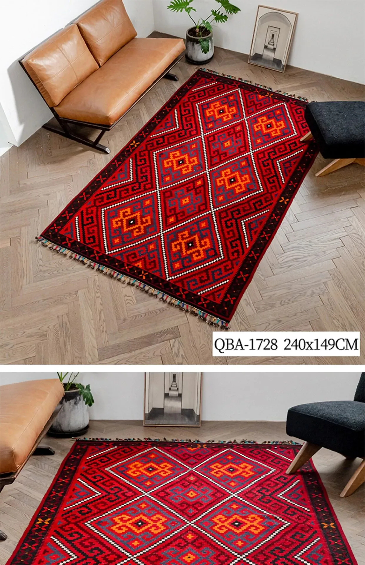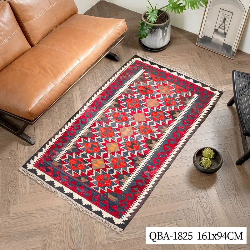 アフガニスタン直輸入の手作りウールレッドキリム!ボヘミアンスタイルのリビングルームにぴったりな個性的なタペストリー&カーペットマット。おしゃれで温かみのある空間を演出します!