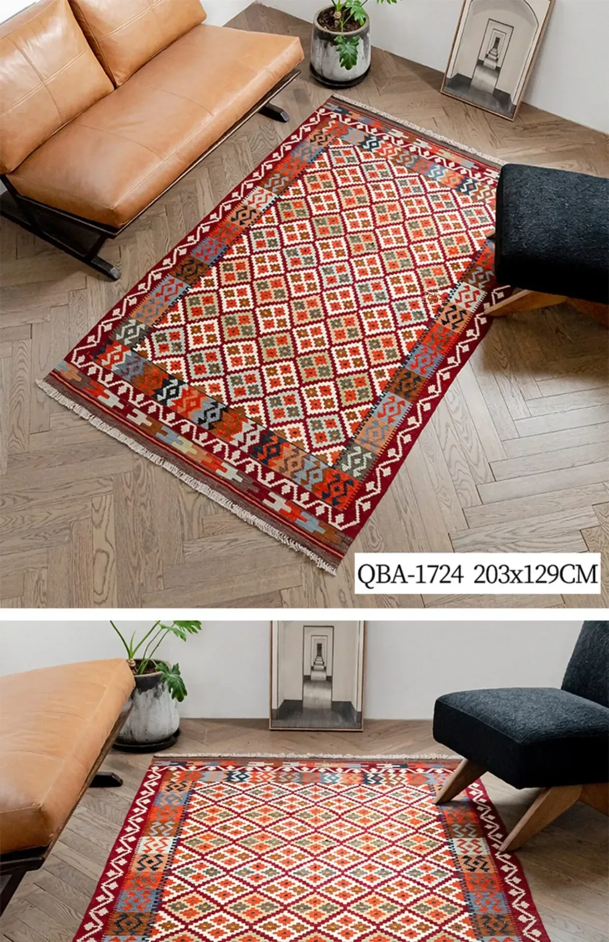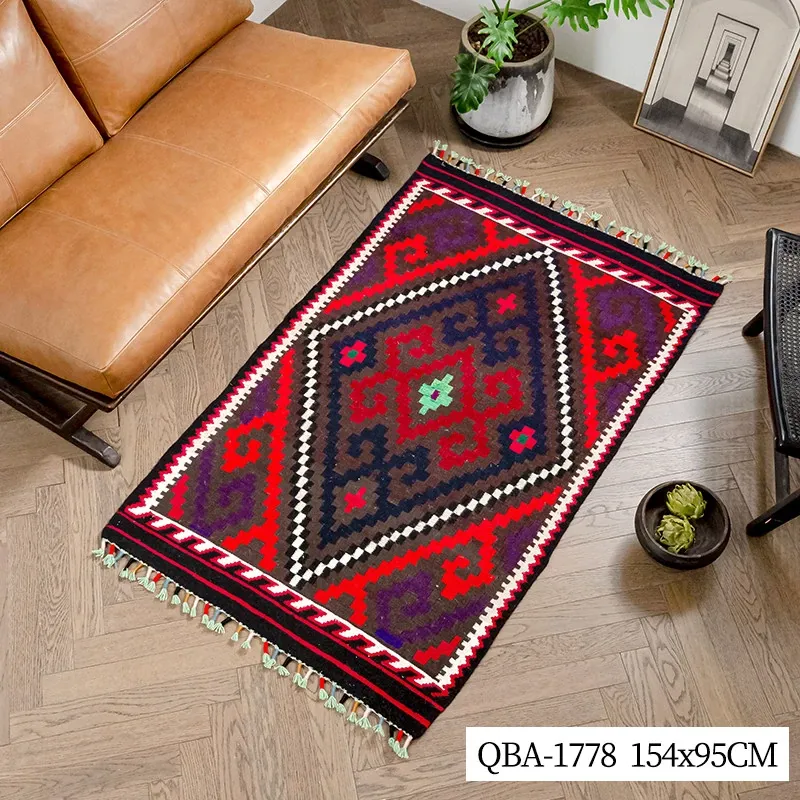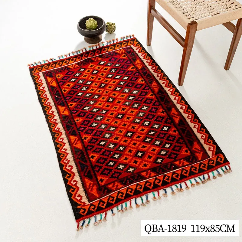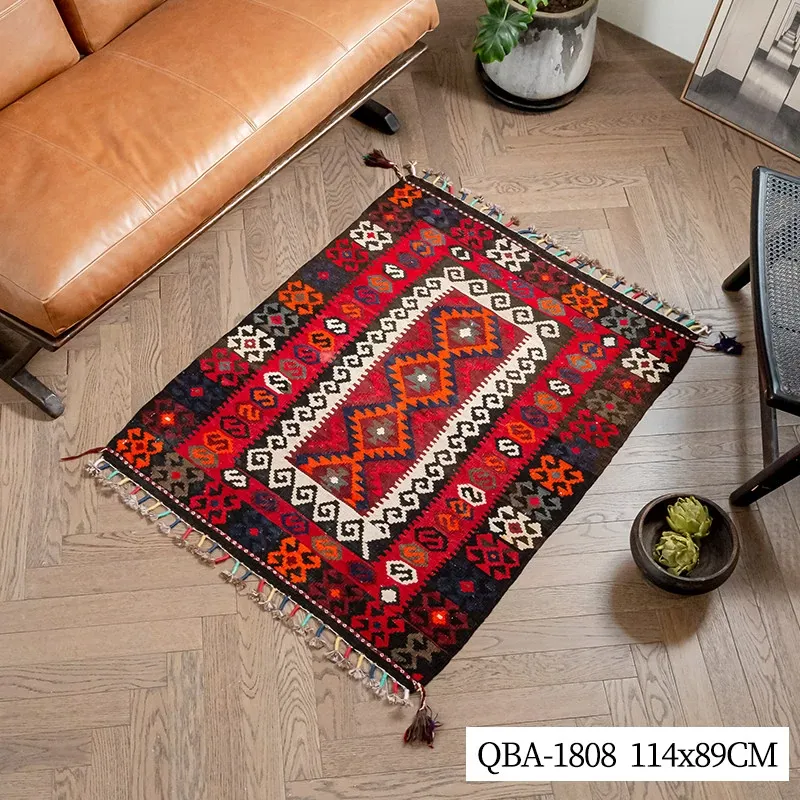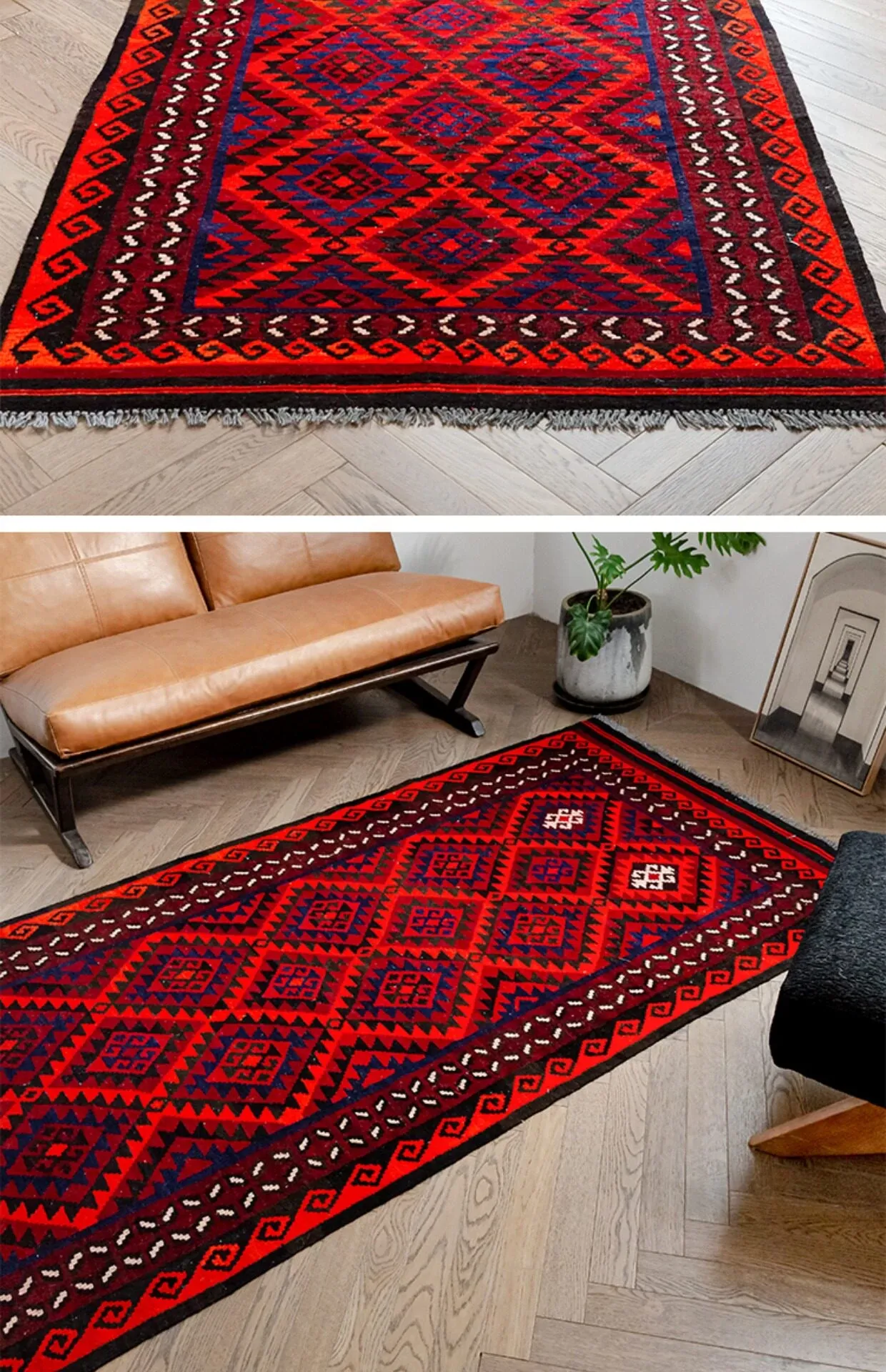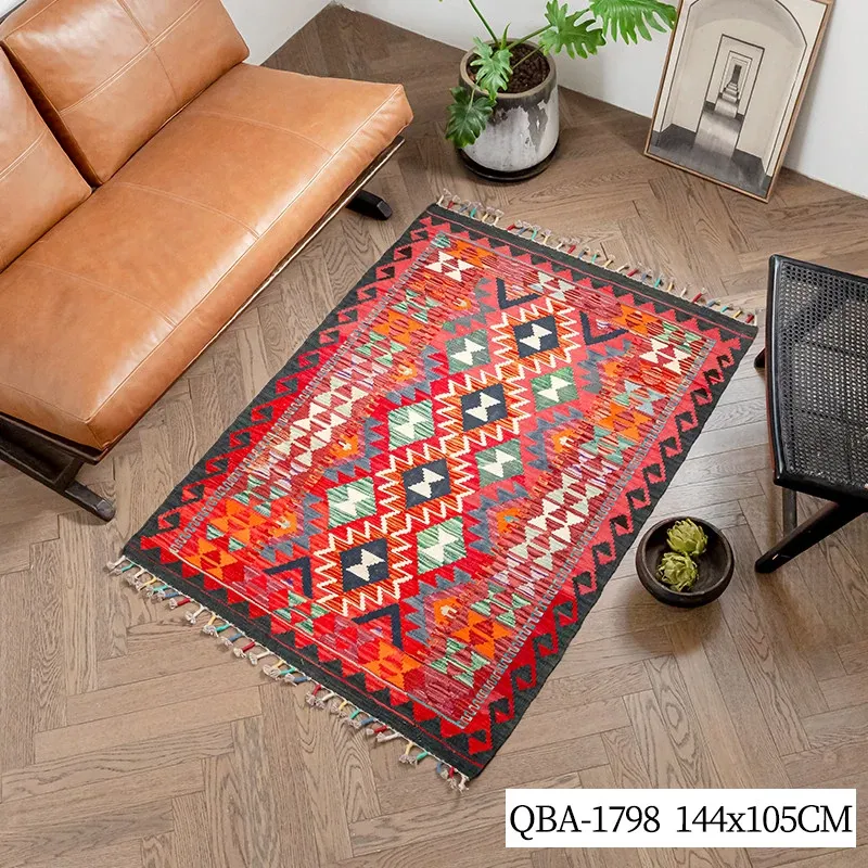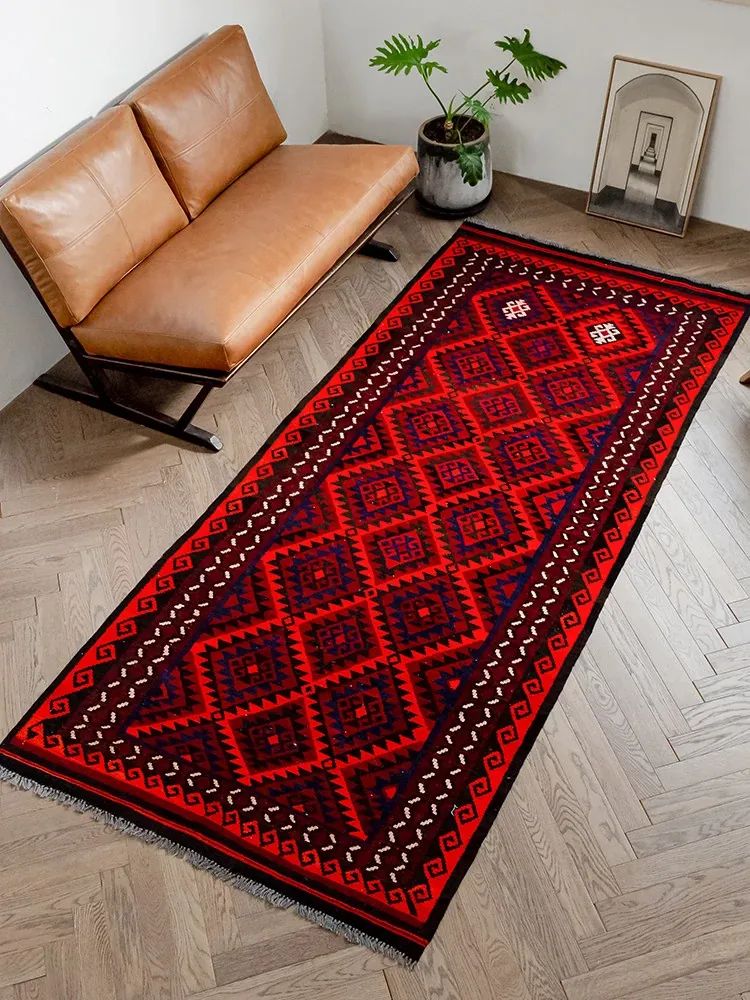 アフガニスタン直輸入の手作りウールレッドキリム!ボヘミアンスタイルのリビングルームにぴったりな個性的なタペストリー&カーペットマット。おしゃれで温かみのある空間を演出します!