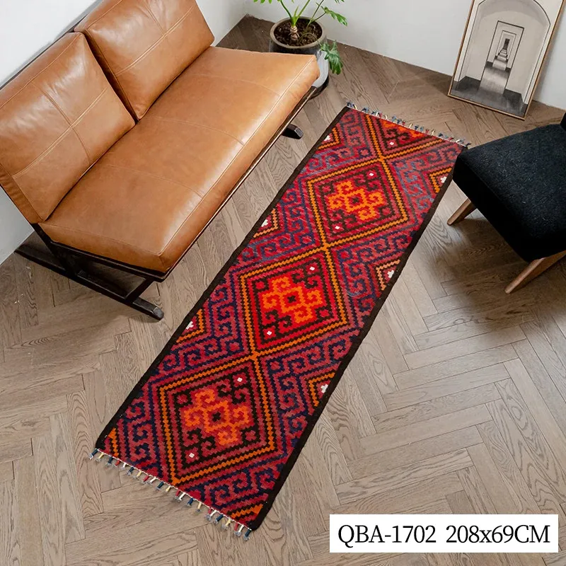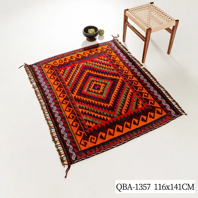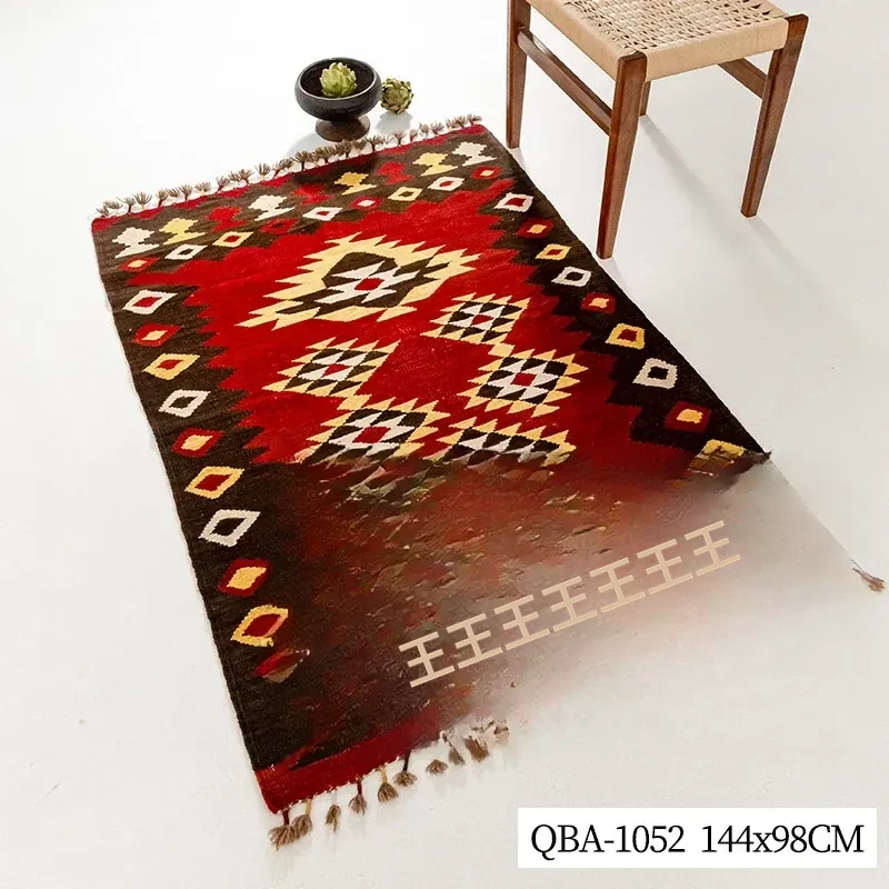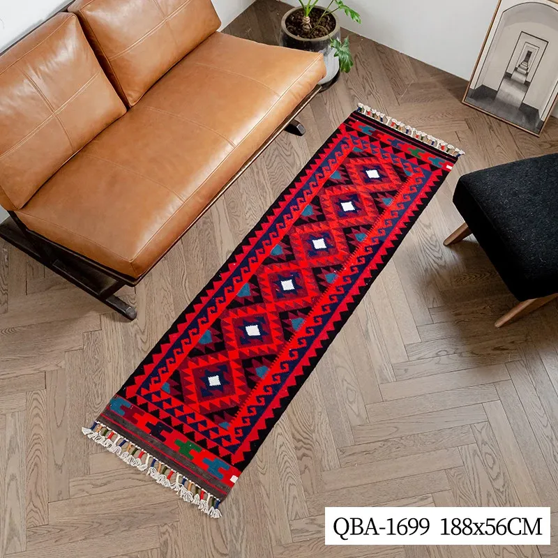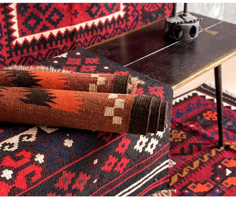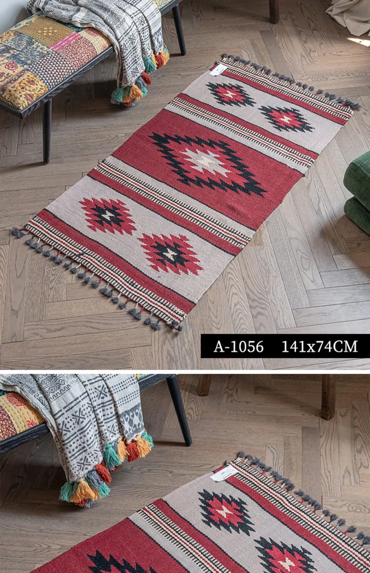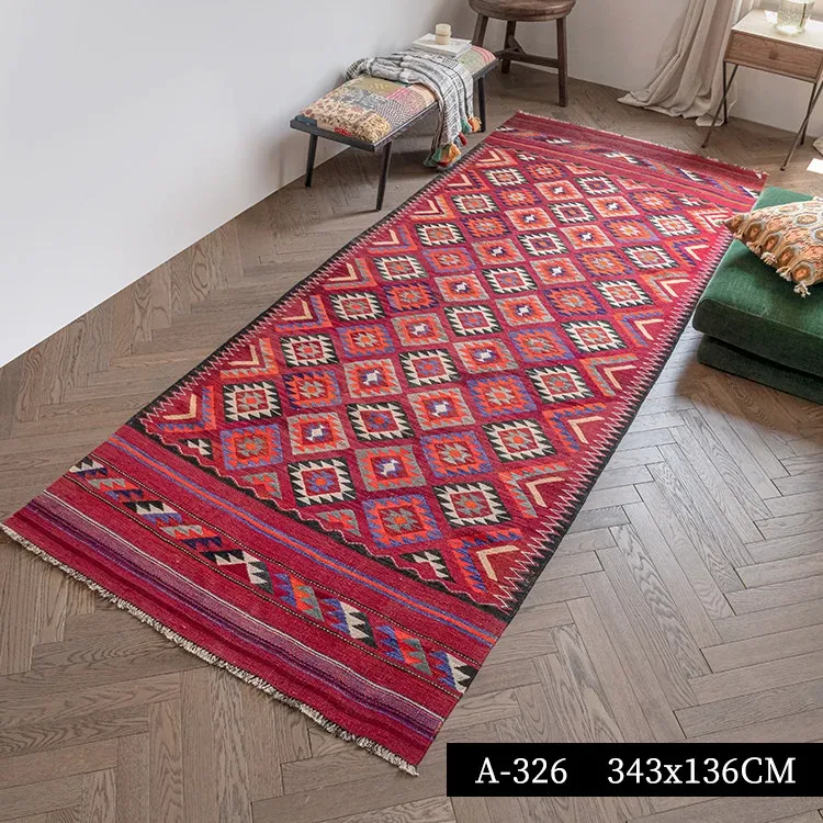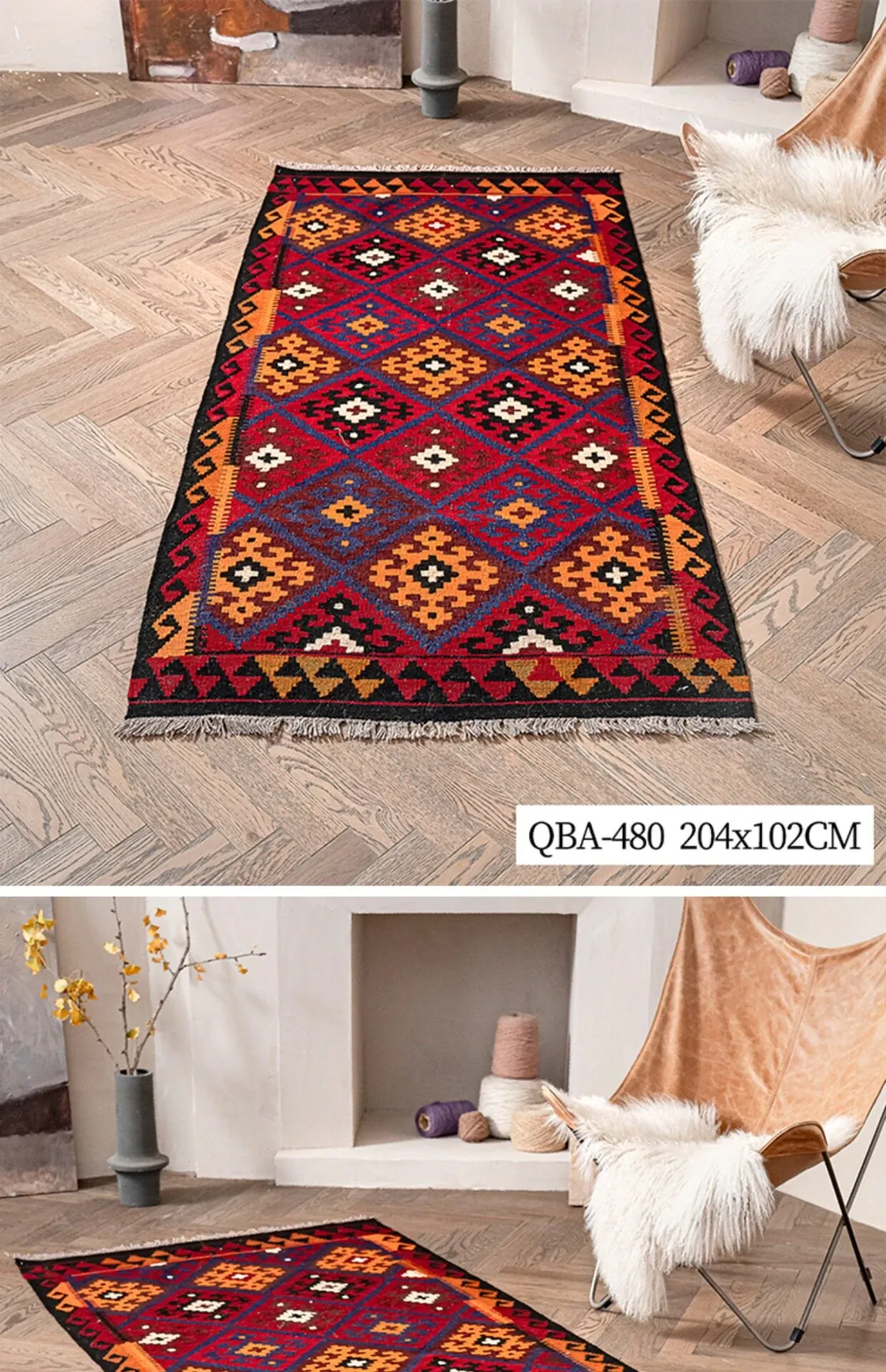 アフガニスタン直輸入の手作りウールレッドキリム!ボヘミアンスタイルのリビングルームにぴったりな個性的なタペストリー&カーペットマット。おしゃれで温かみのある空間を演出します!