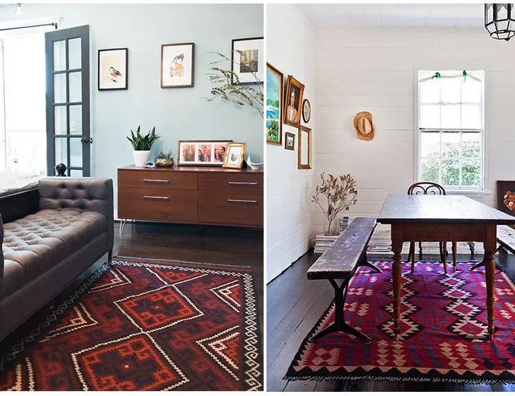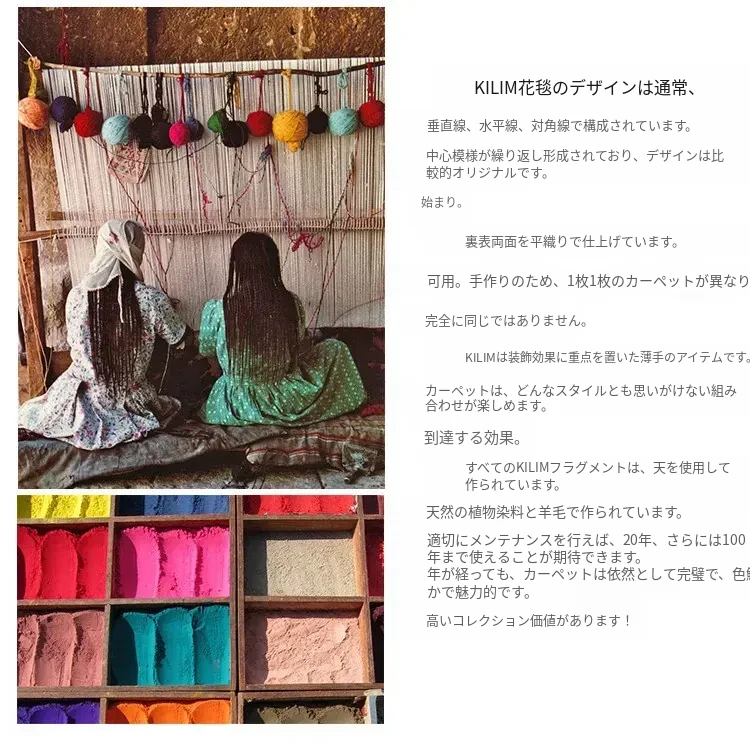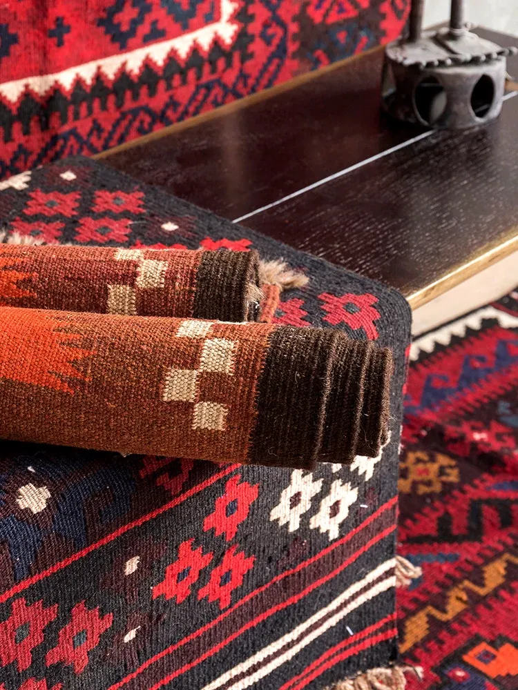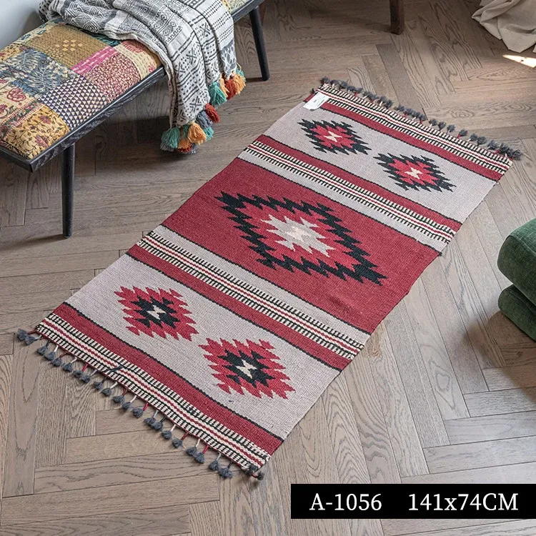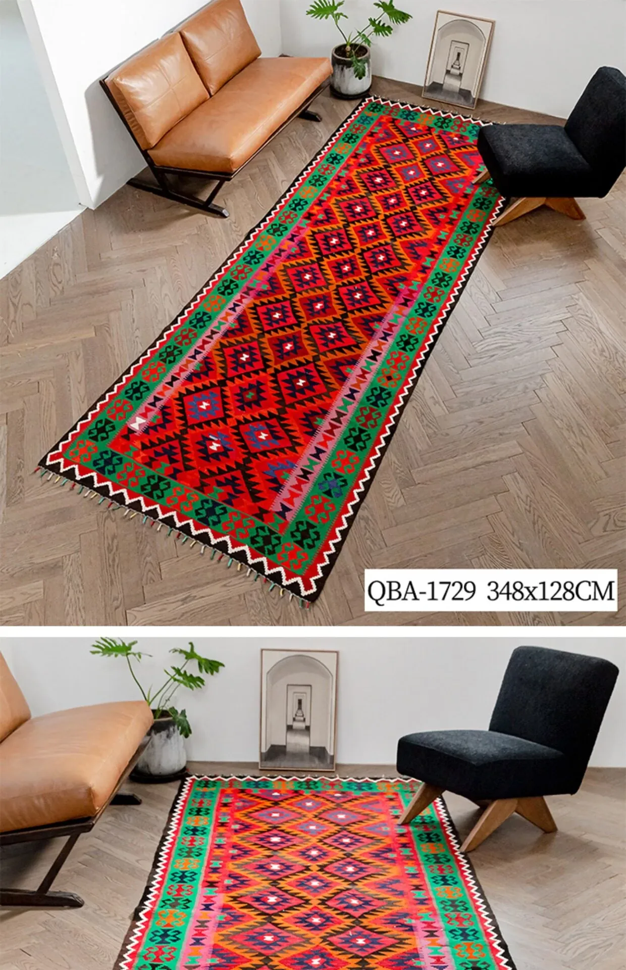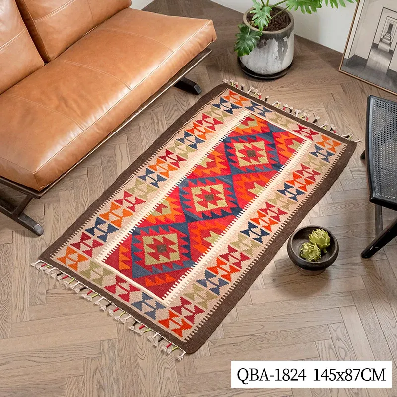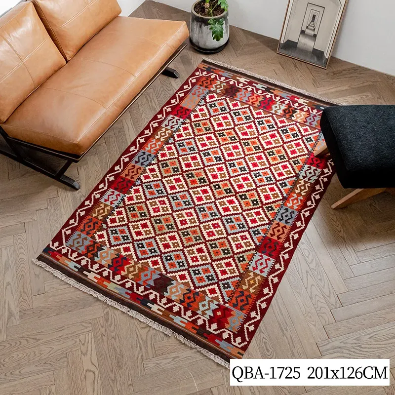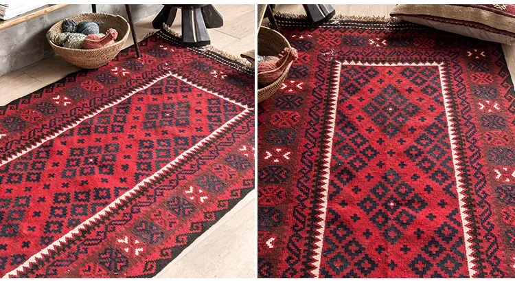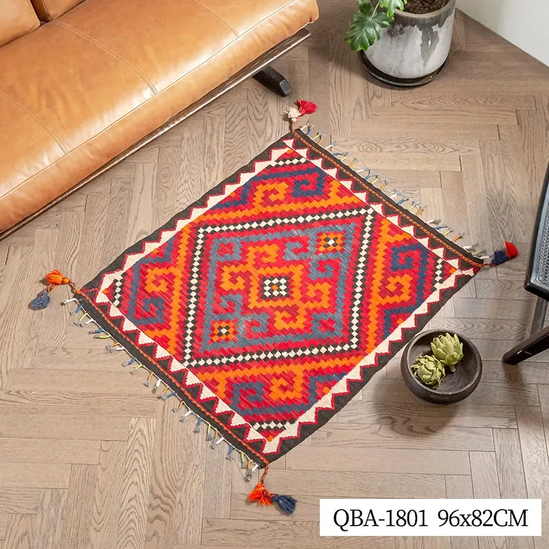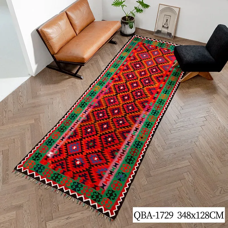 アフガニスタン直輸入の手作りウールレッドキリム!ボヘミアンスタイルのリビングルームにぴったりな個性的なタペストリー&カーペットマット。おしゃれで温かみのある空間を演出します!