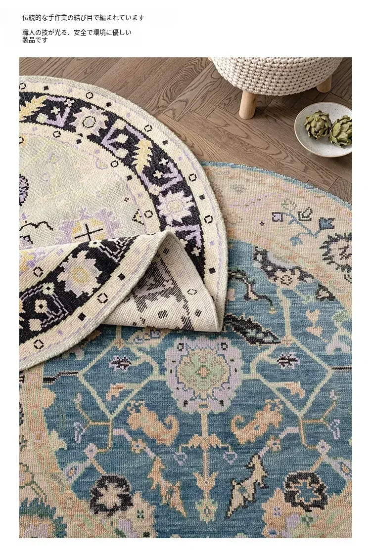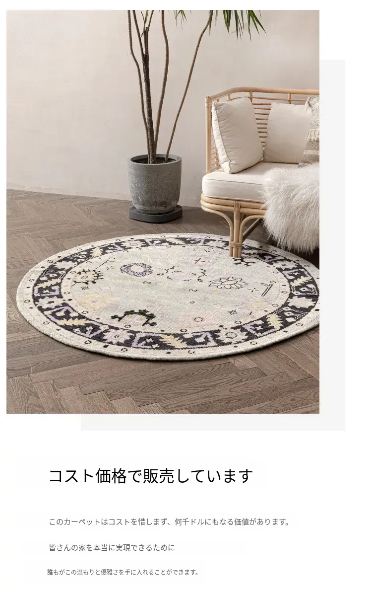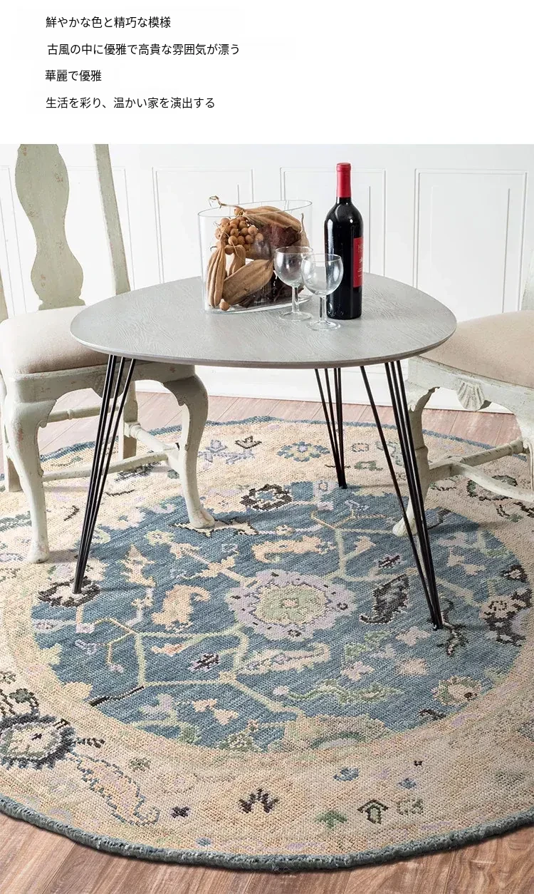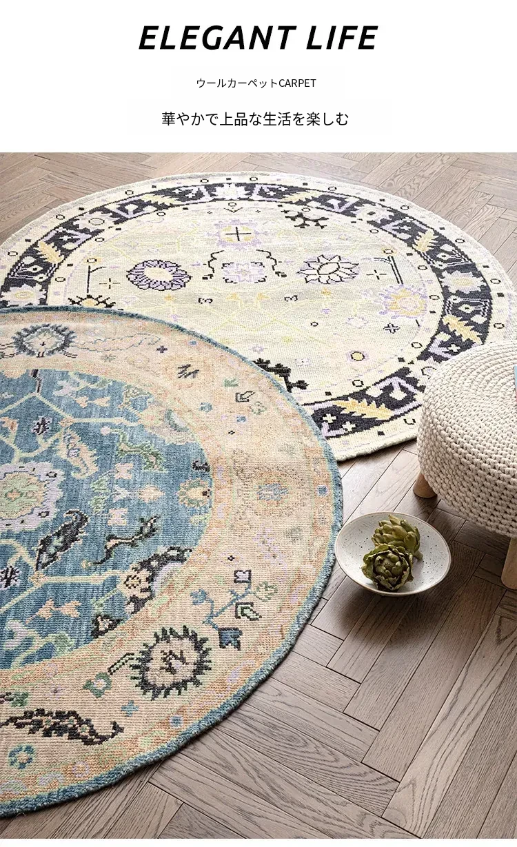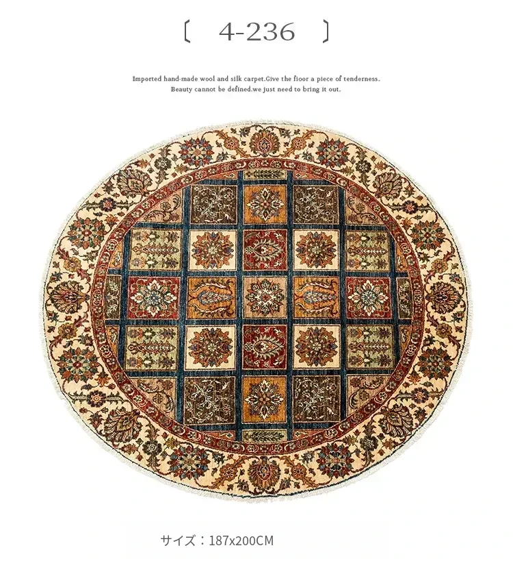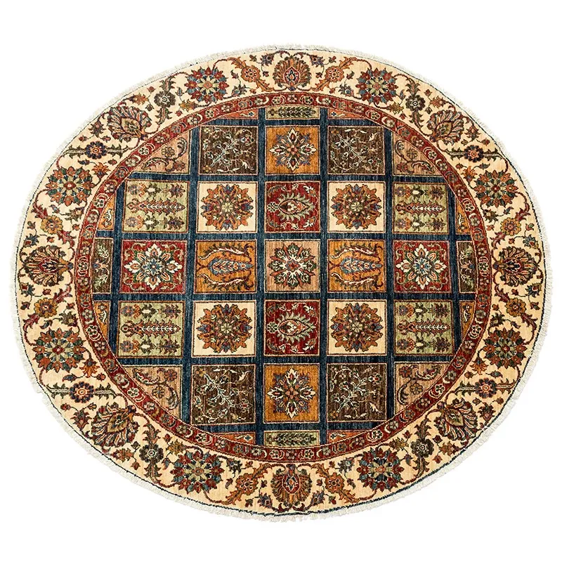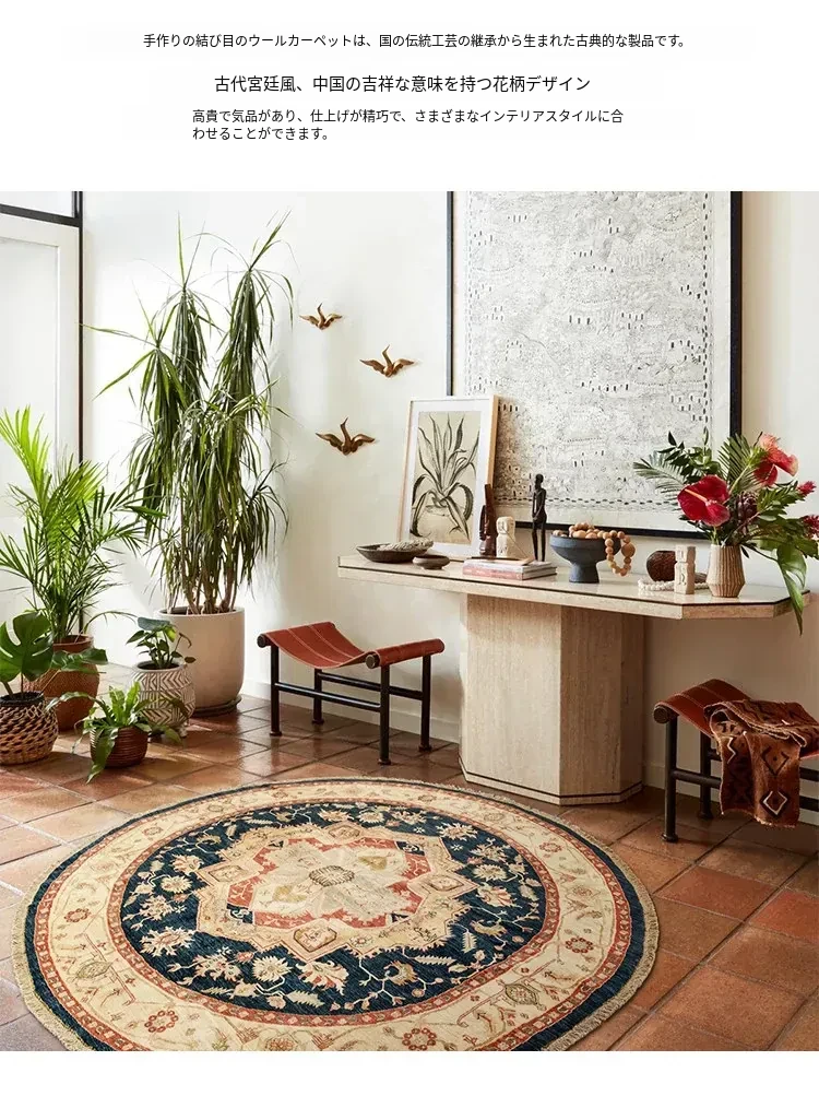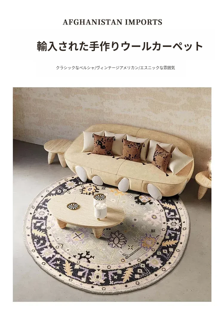 アフガニスタン直輸入のラグジュアリーな円形ヴィンテージモダンスタイルのウール手織りラグ。豪邸のリビングにぴったりな手作りの結び目の絨毯で、空間を華やかに演出します。