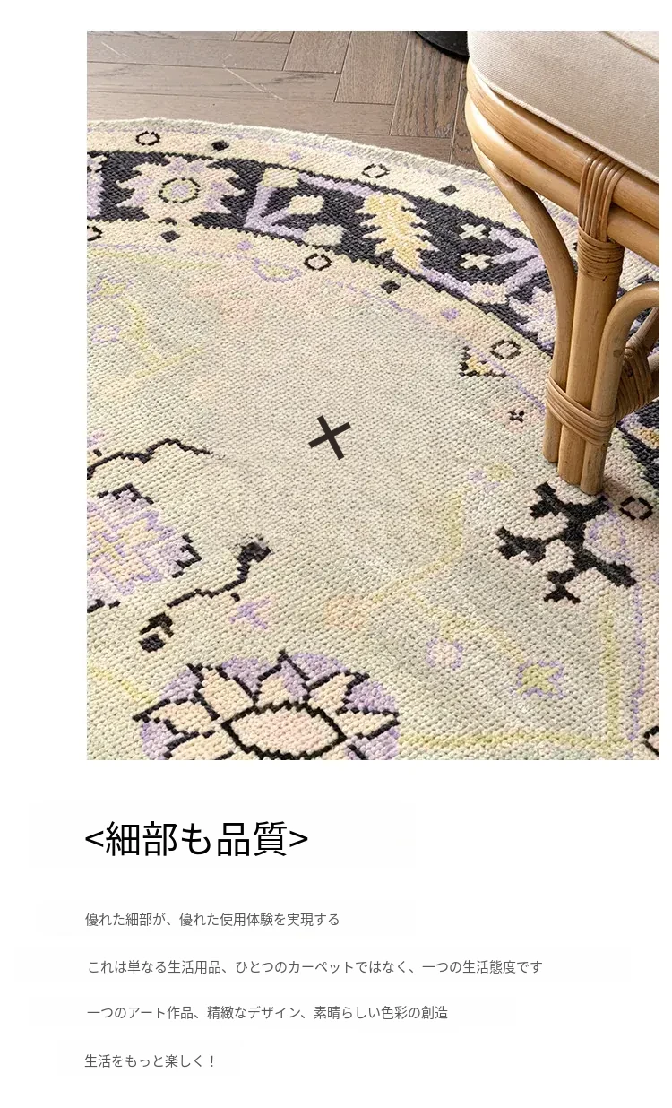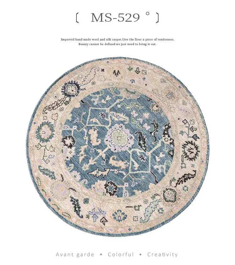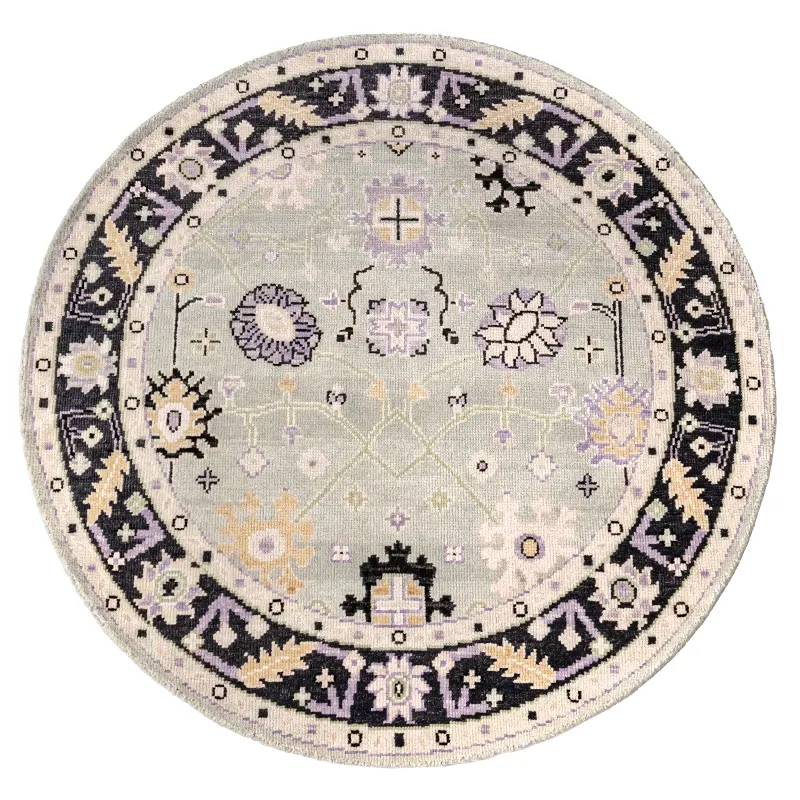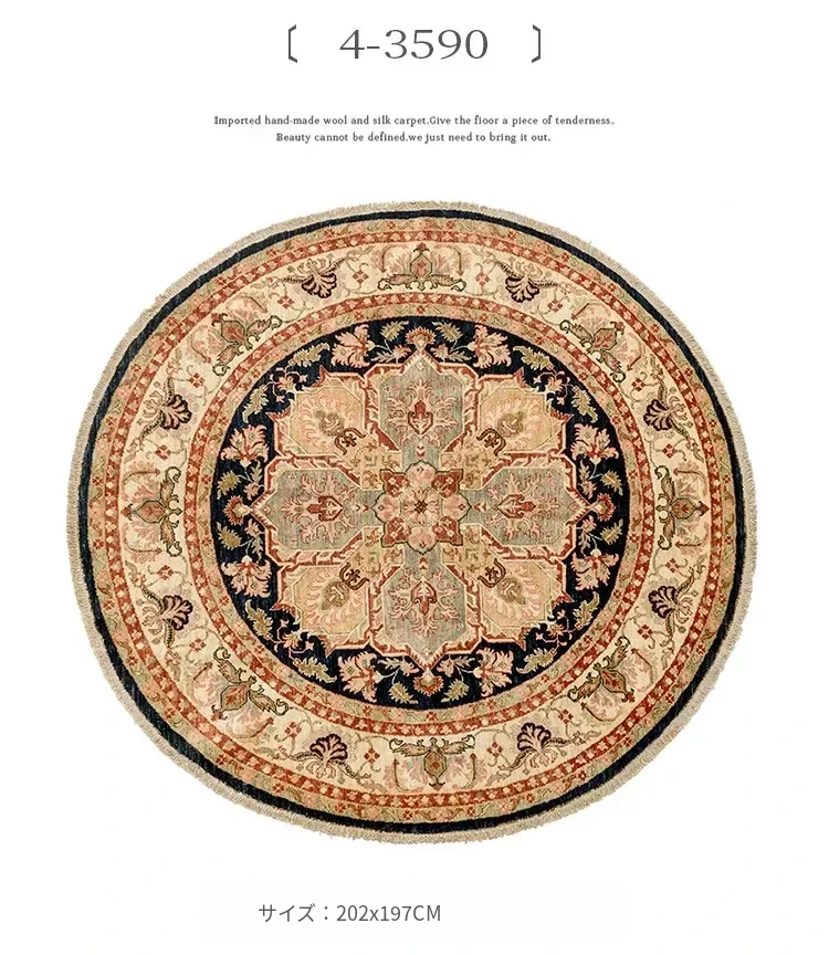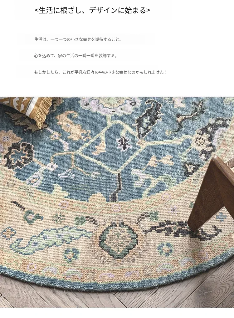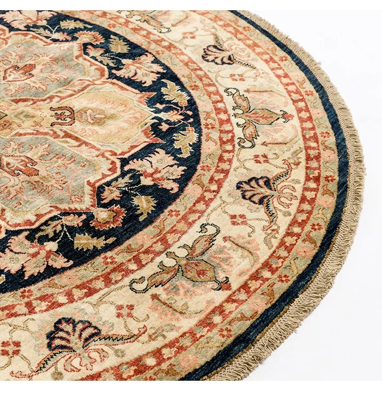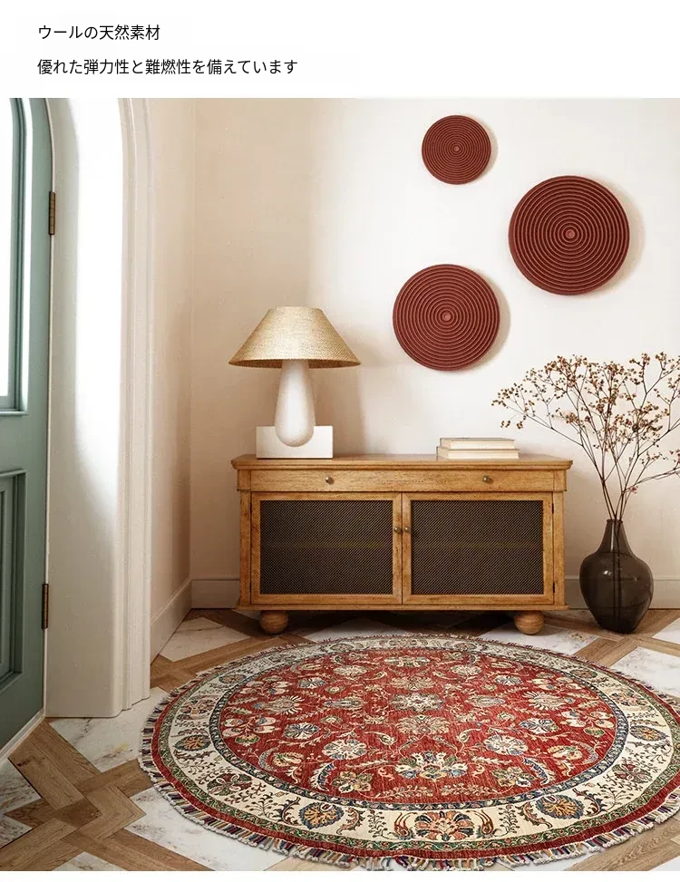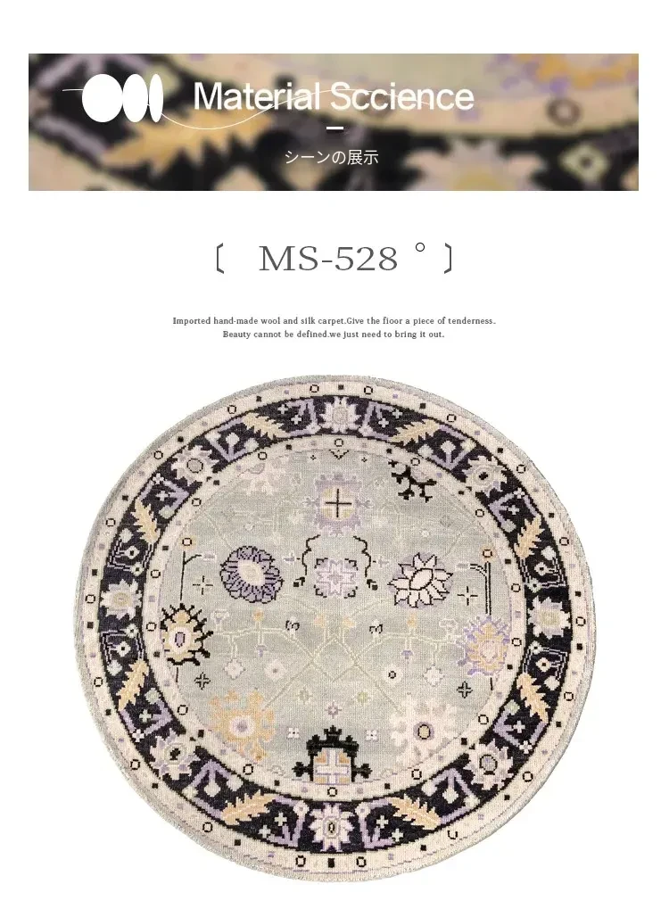 アフガニスタン直輸入のラグジュアリーな円形ヴィンテージモダンスタイルのウール手織りラグ。豪邸のリビングにぴったりな手作りの結び目の絨毯で、空間を華やかに演出します。