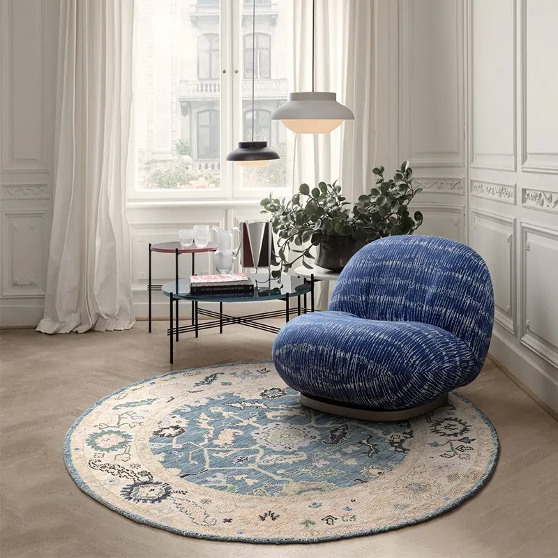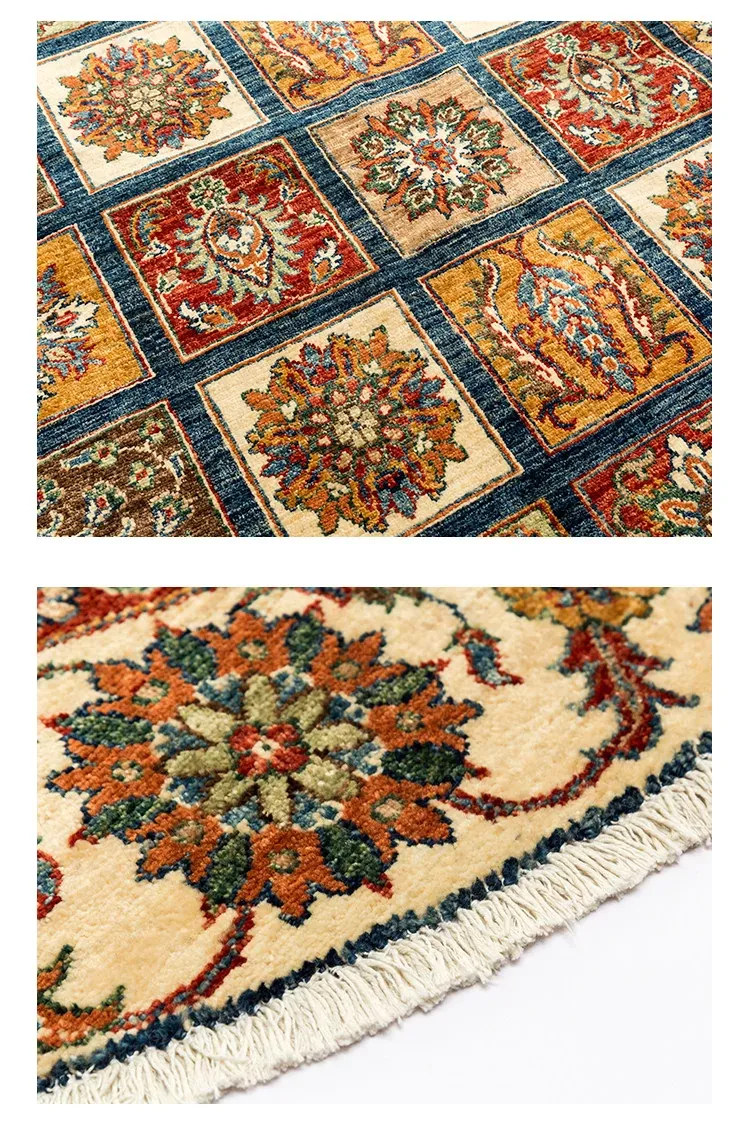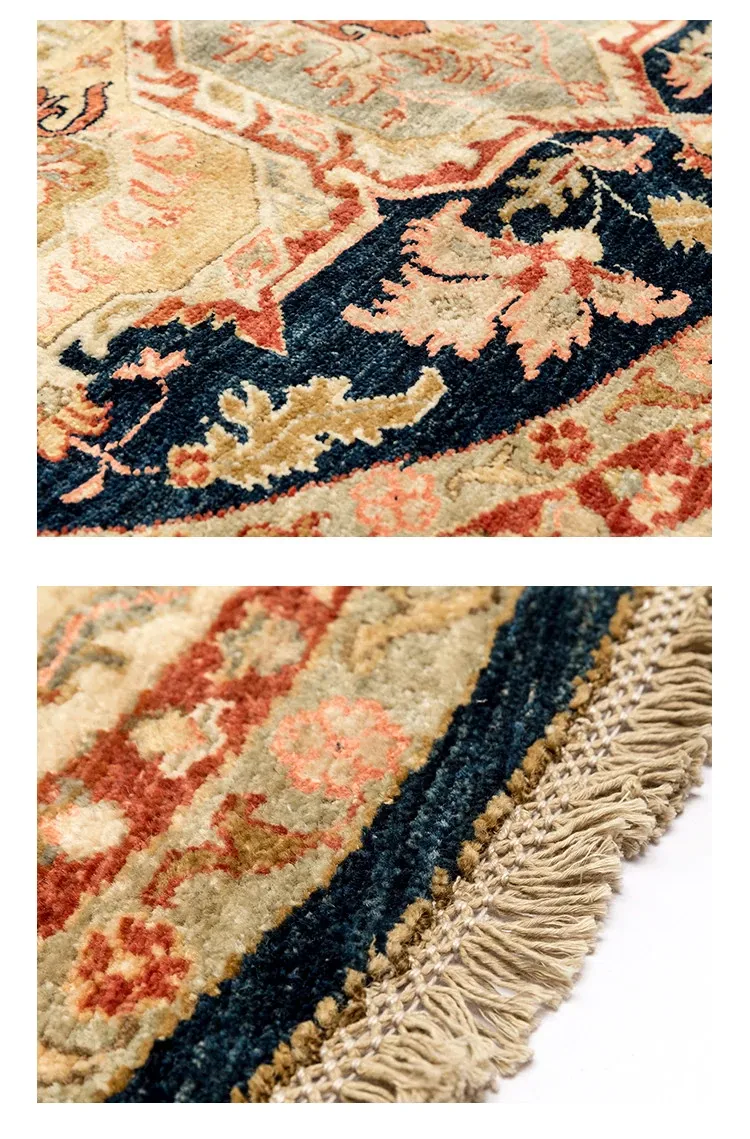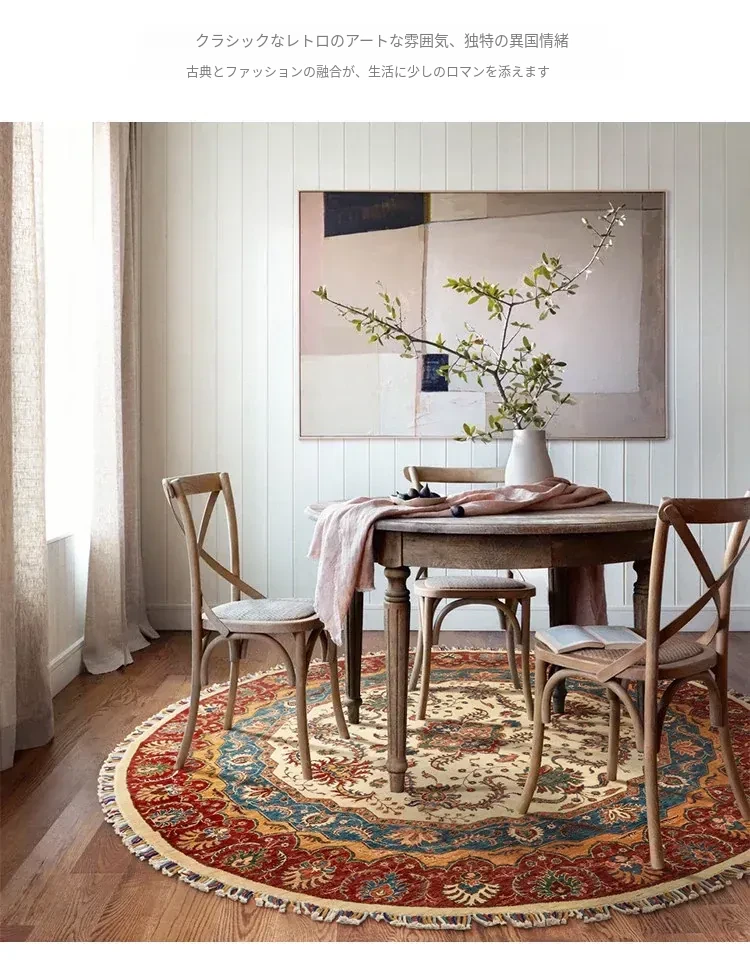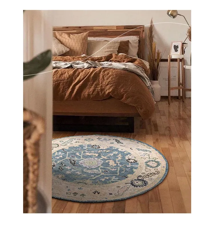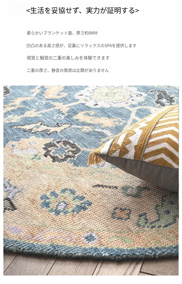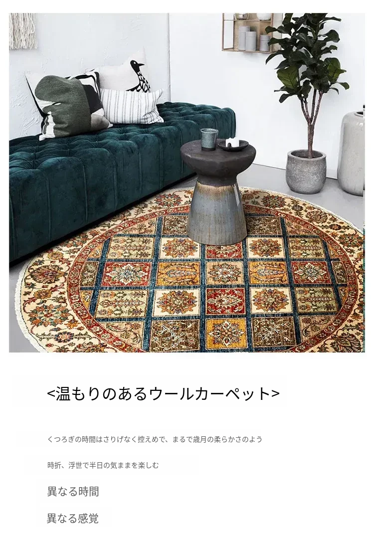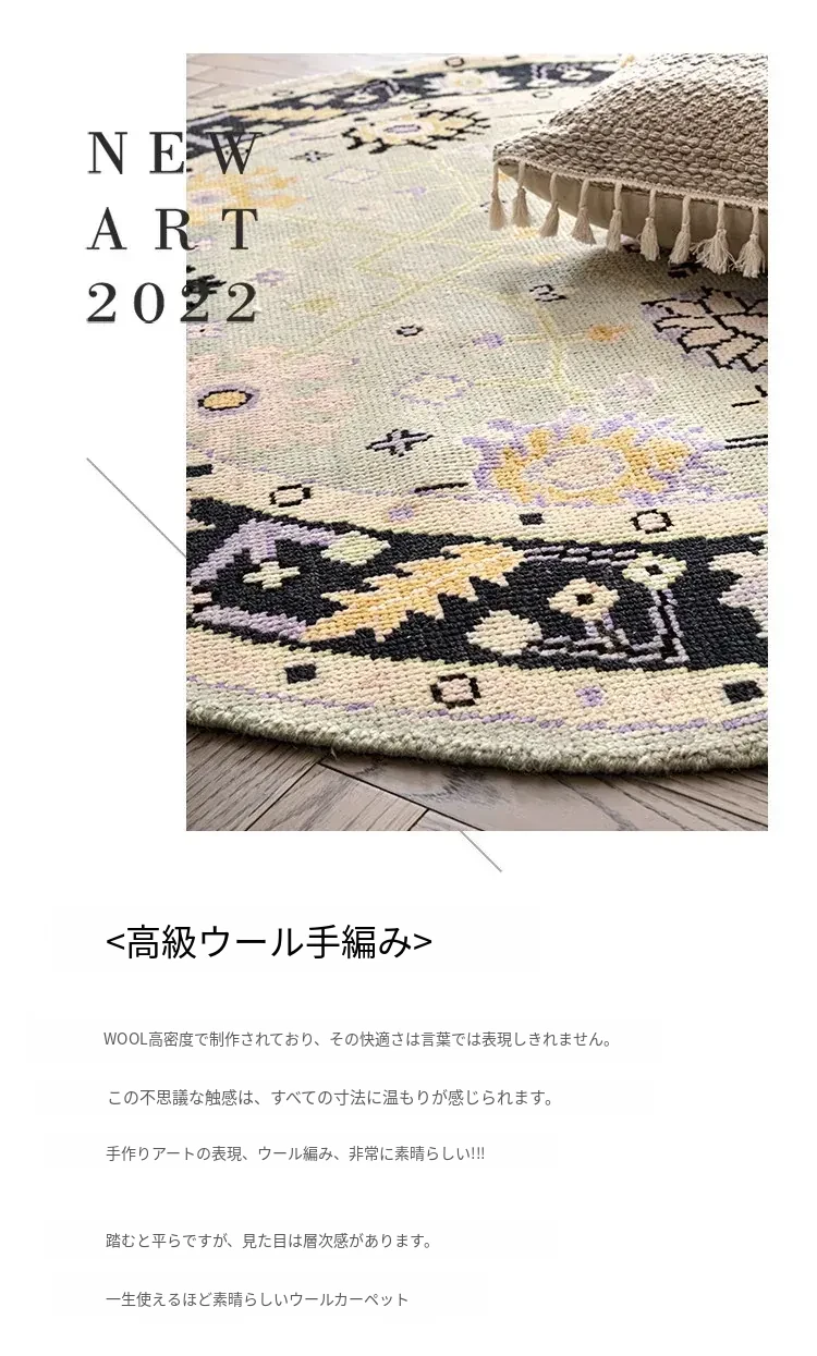 アフガニスタン直輸入のラグジュアリーな円形ヴィンテージモダンスタイルのウール手織りラグ。豪邸のリビングにぴったりな手作りの結び目の絨毯で、空間を華やかに演出します。