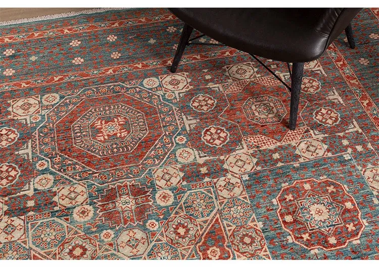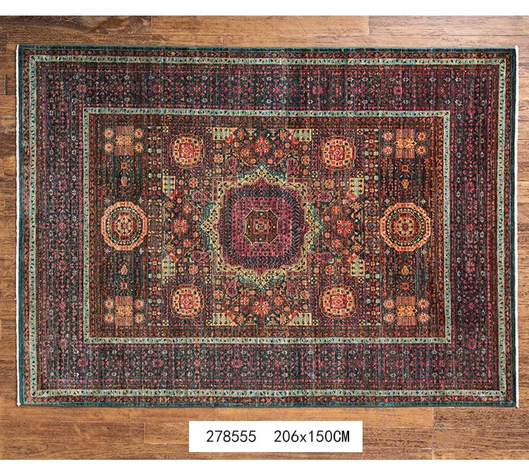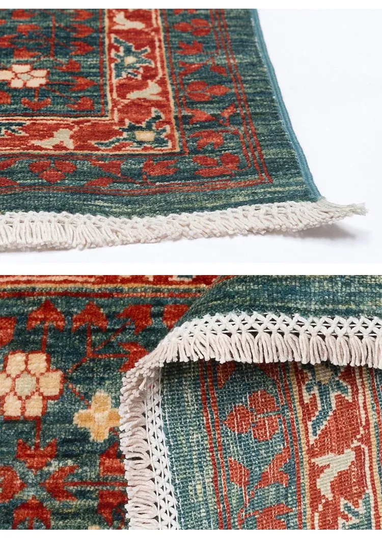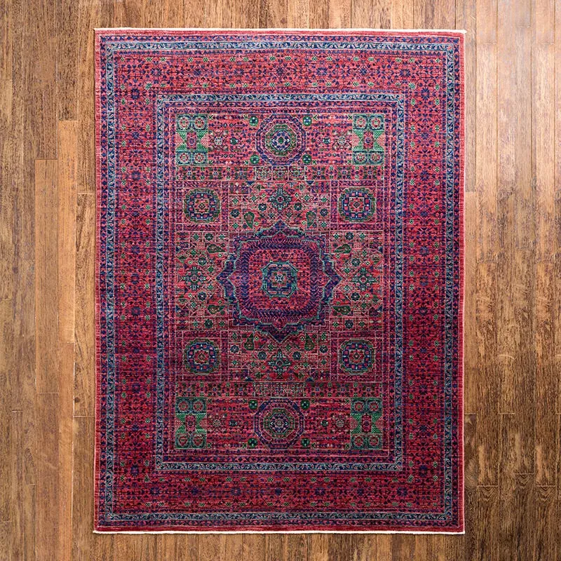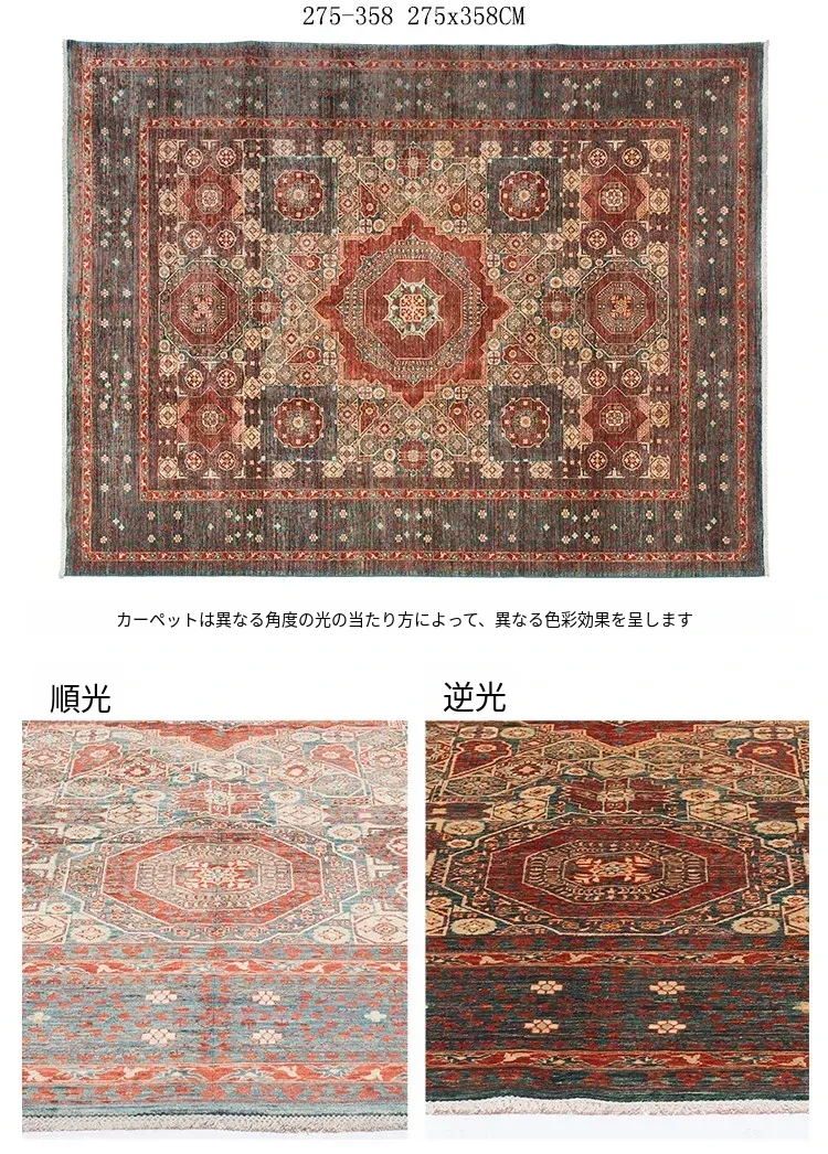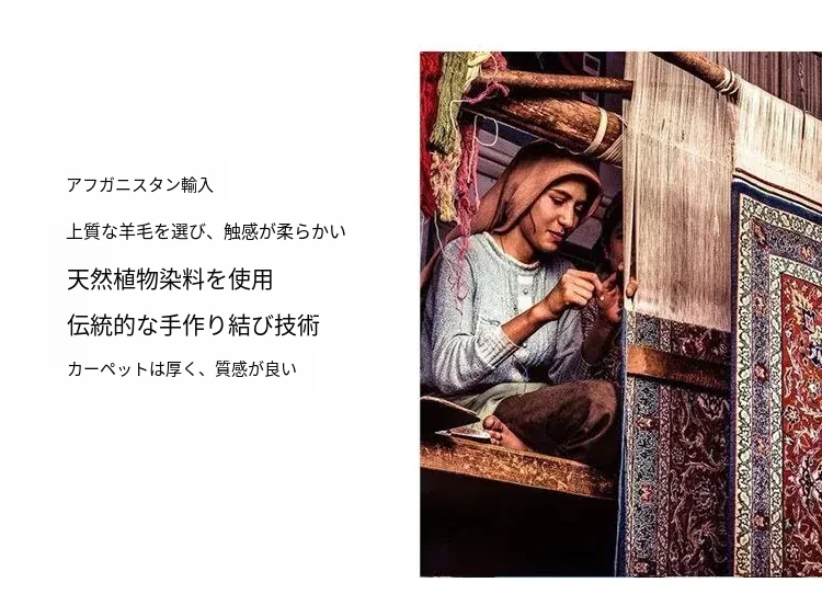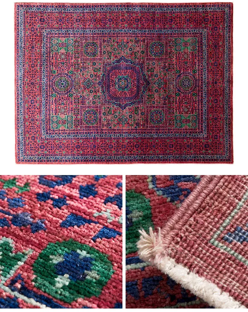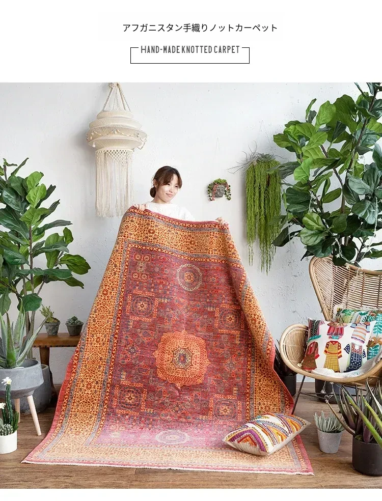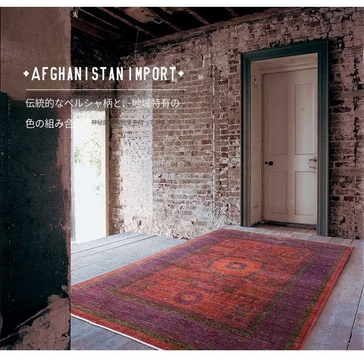 アフガニスタン直輸入!アメリカンレトロスタイルのペルシャ柄手作りウールラグ。寝室やリビングにぴったりの民族風デザイン、ふわふわの肌触りで心地よい空間を演出します。