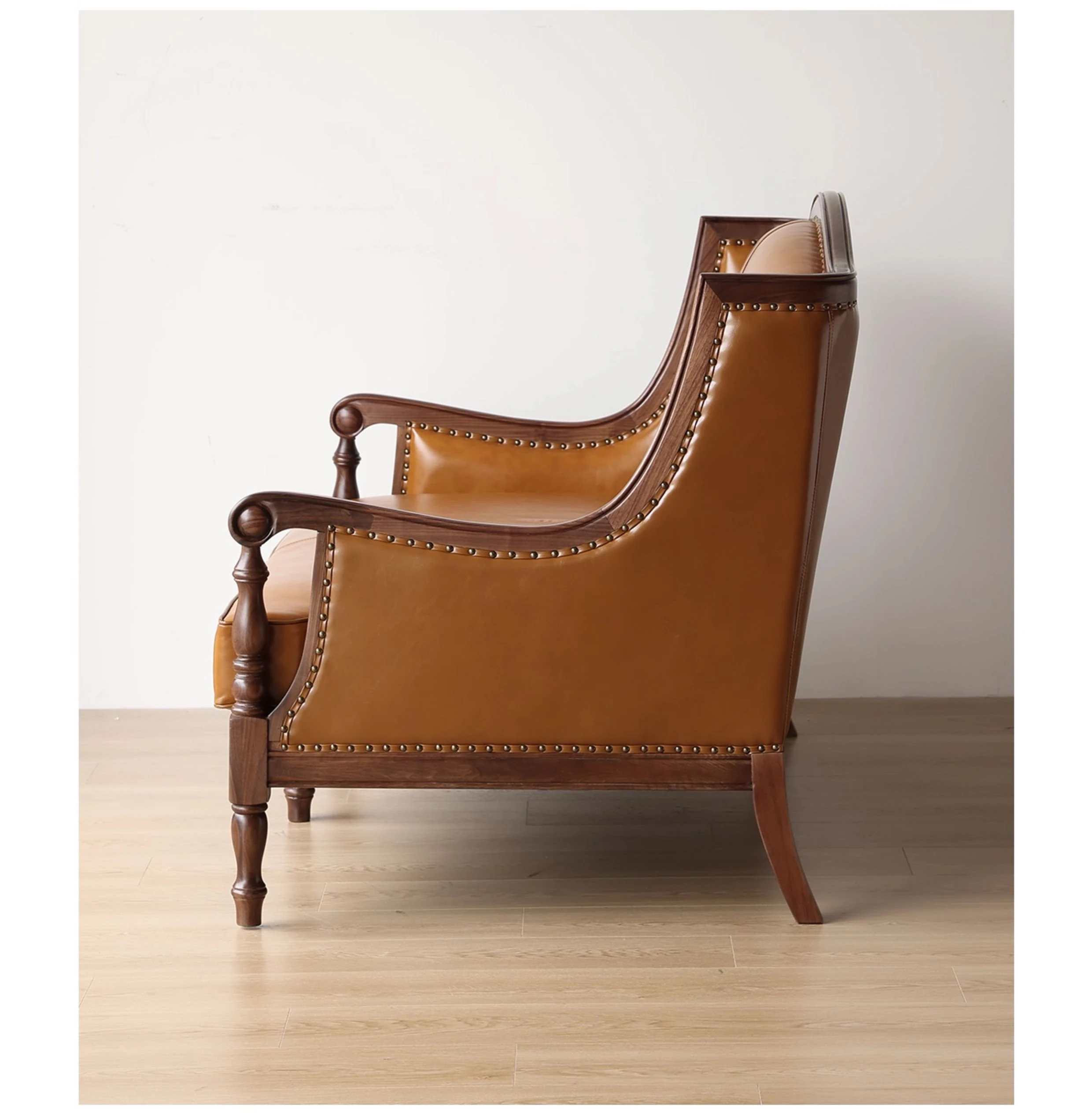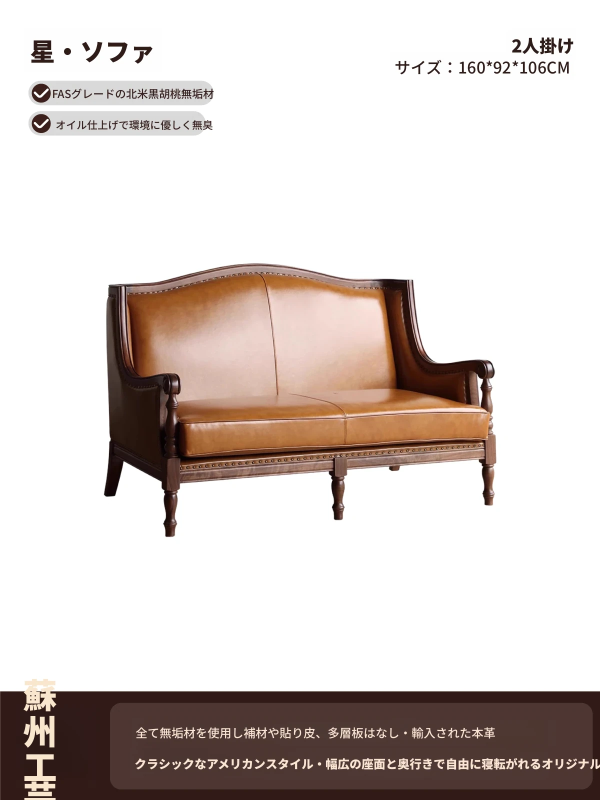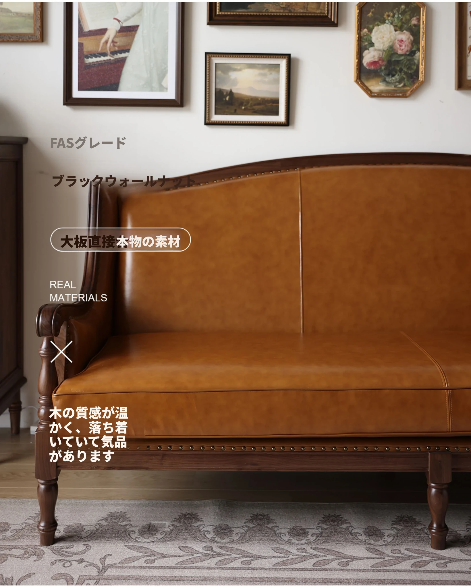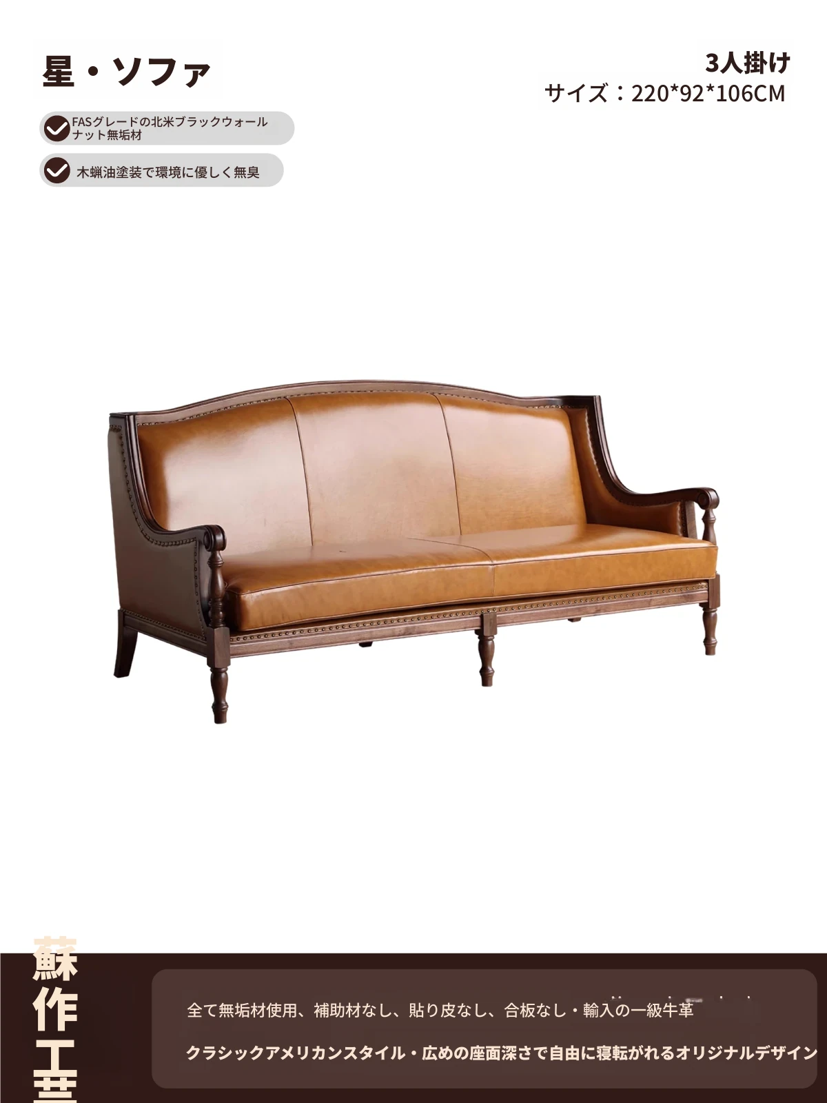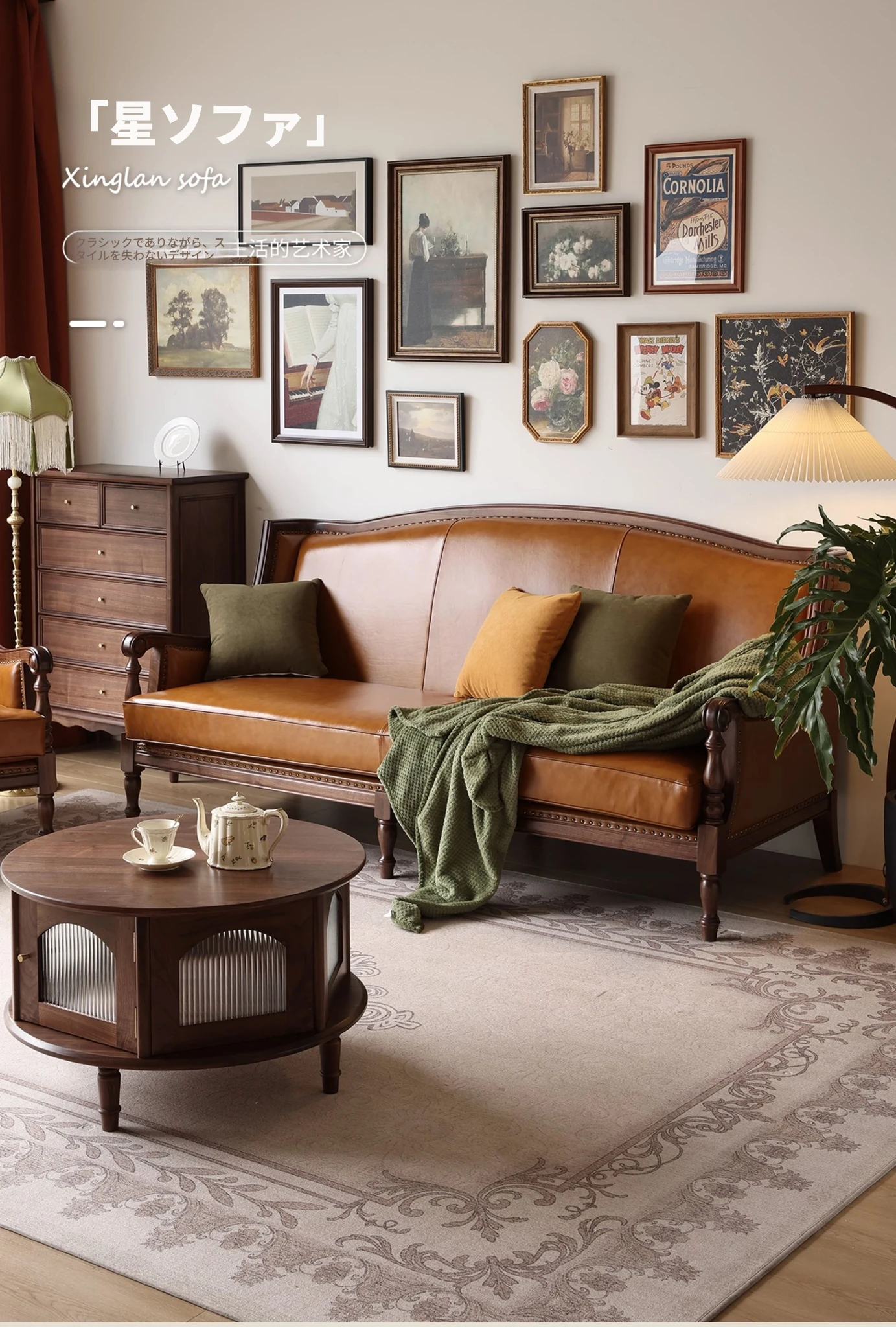 アメリカンレトロの無垢材と本革ソファ|北米産ブラックウォールナット使用|123cmコンビネーション|シンプルで洗練された高級ヴィラリビングルーム家具