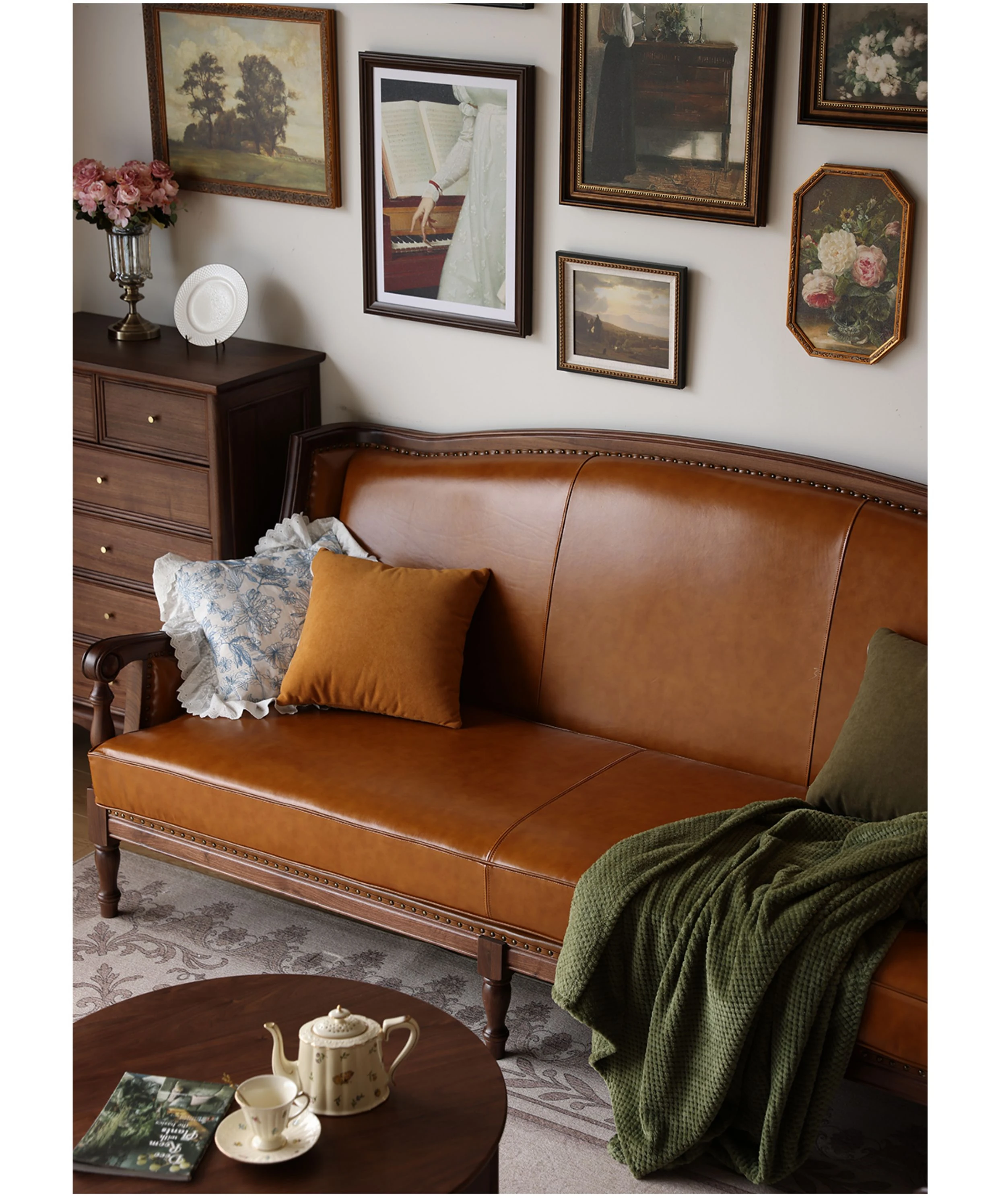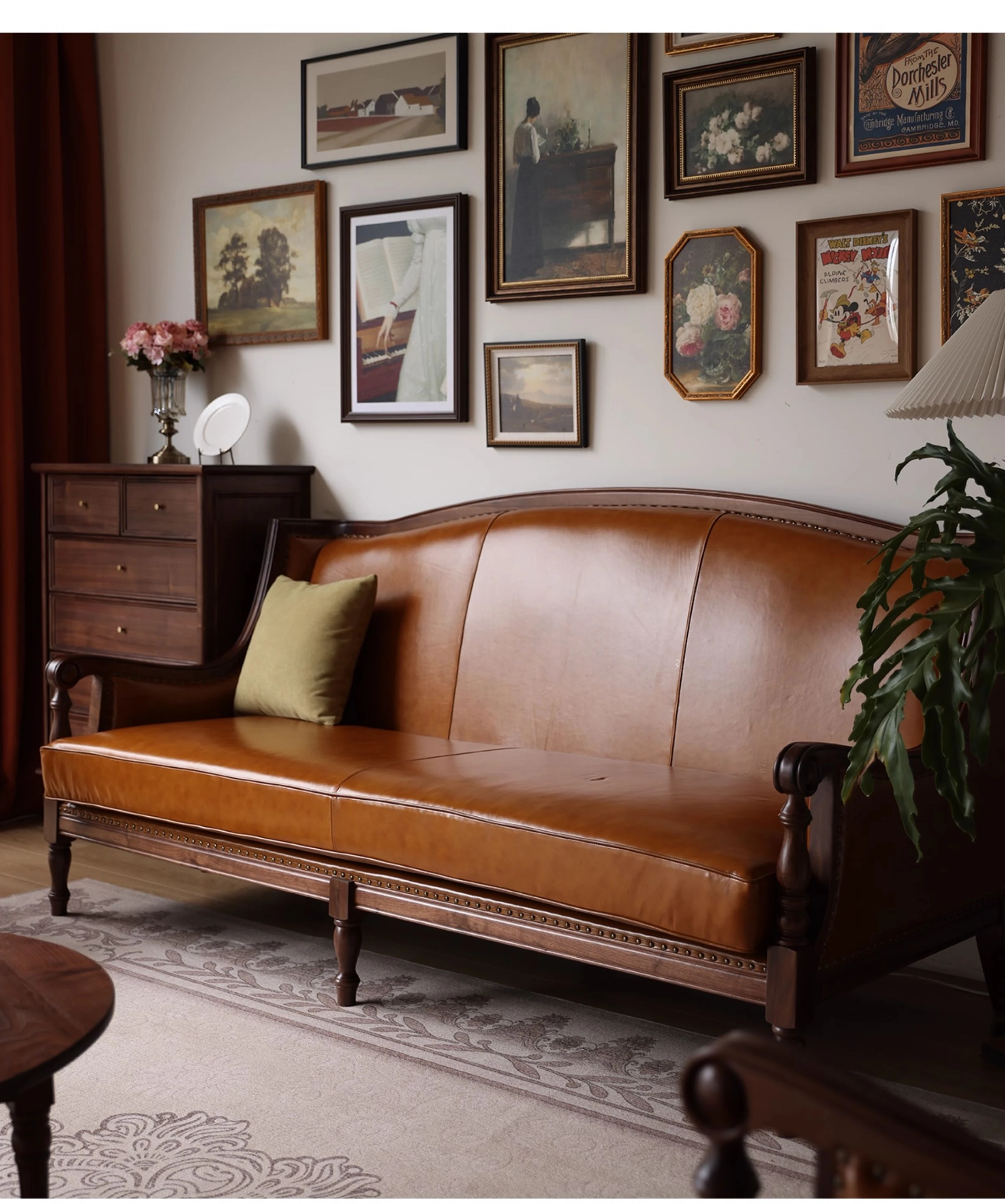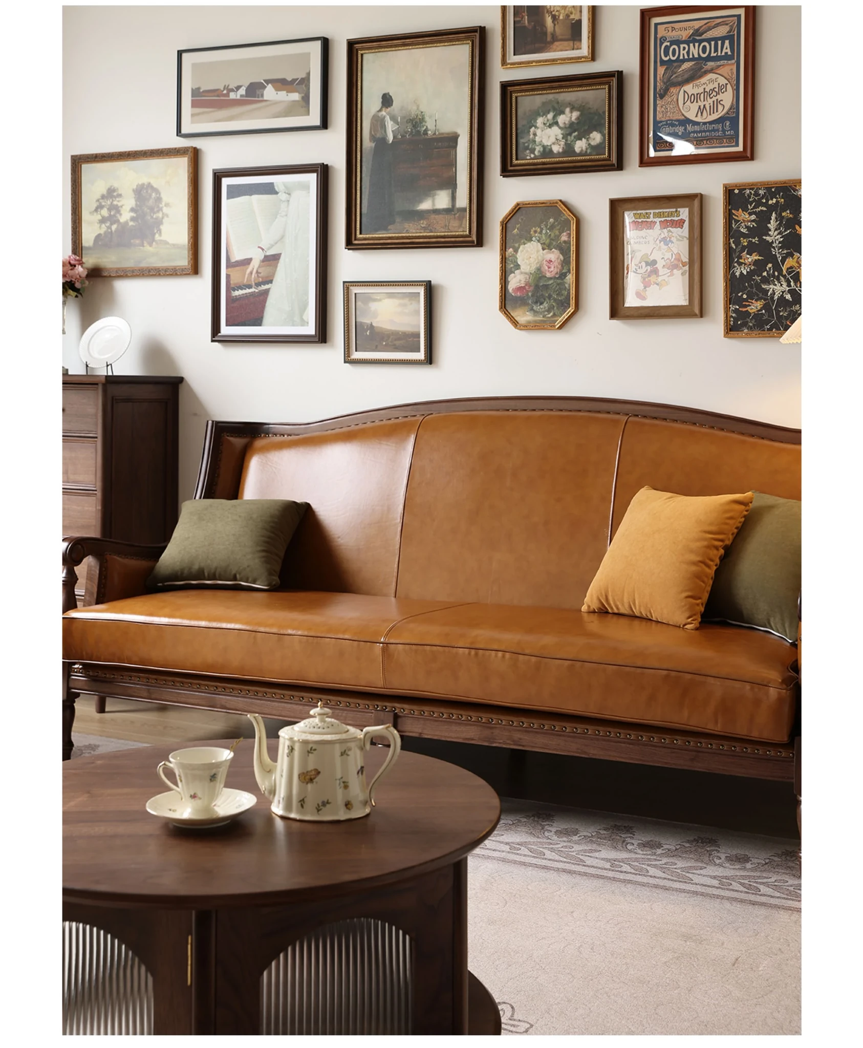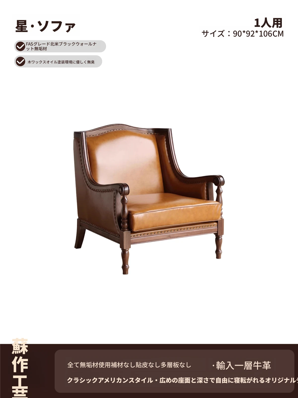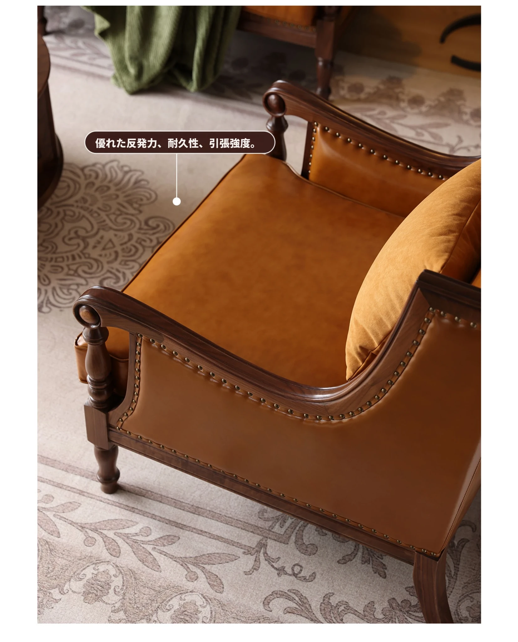 アメリカンレトロの無垢材と本革ソファ|北米産ブラックウォールナット使用|123cmコンビネーション|シンプルで洗練された高級ヴィラリビングルーム家具