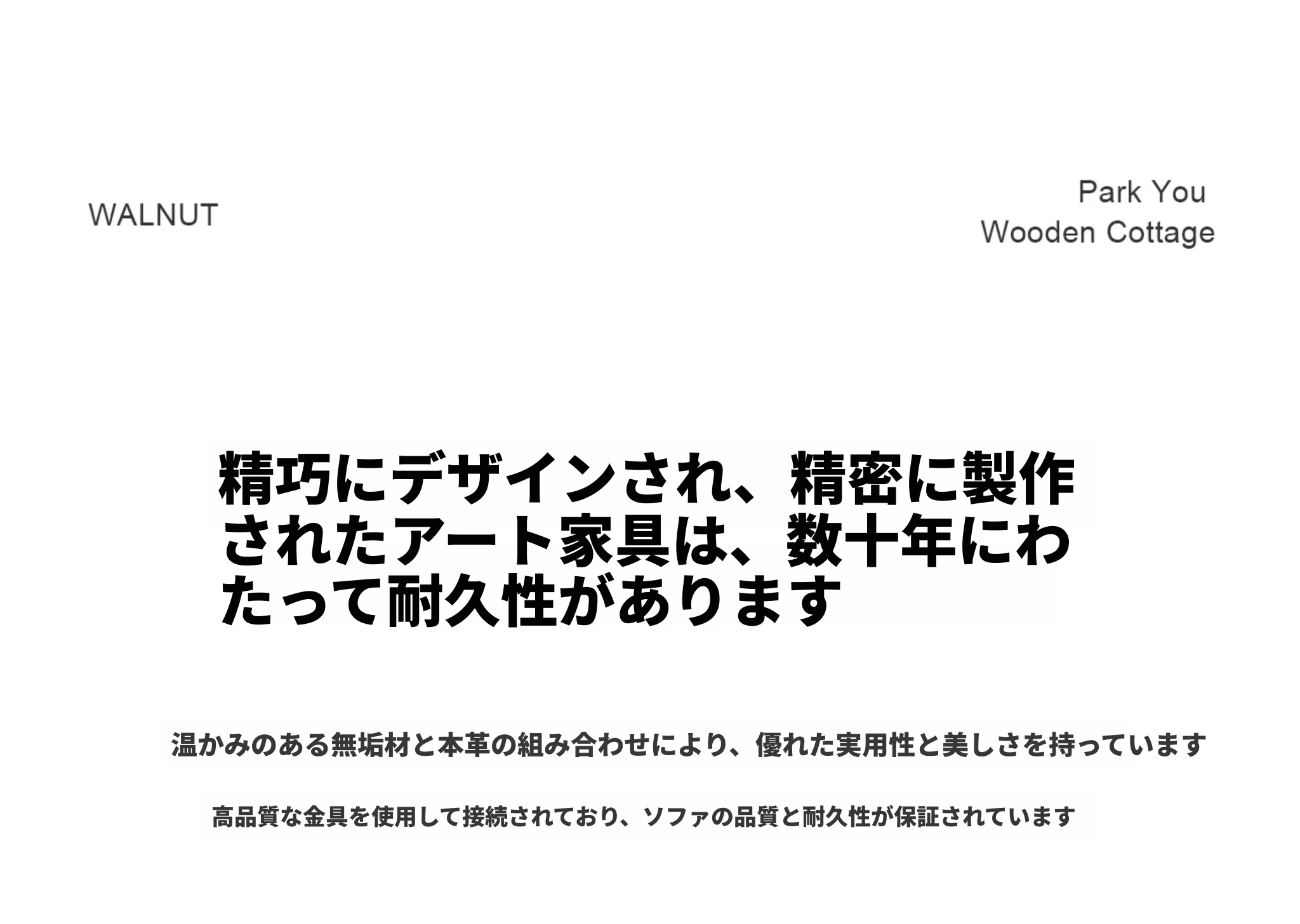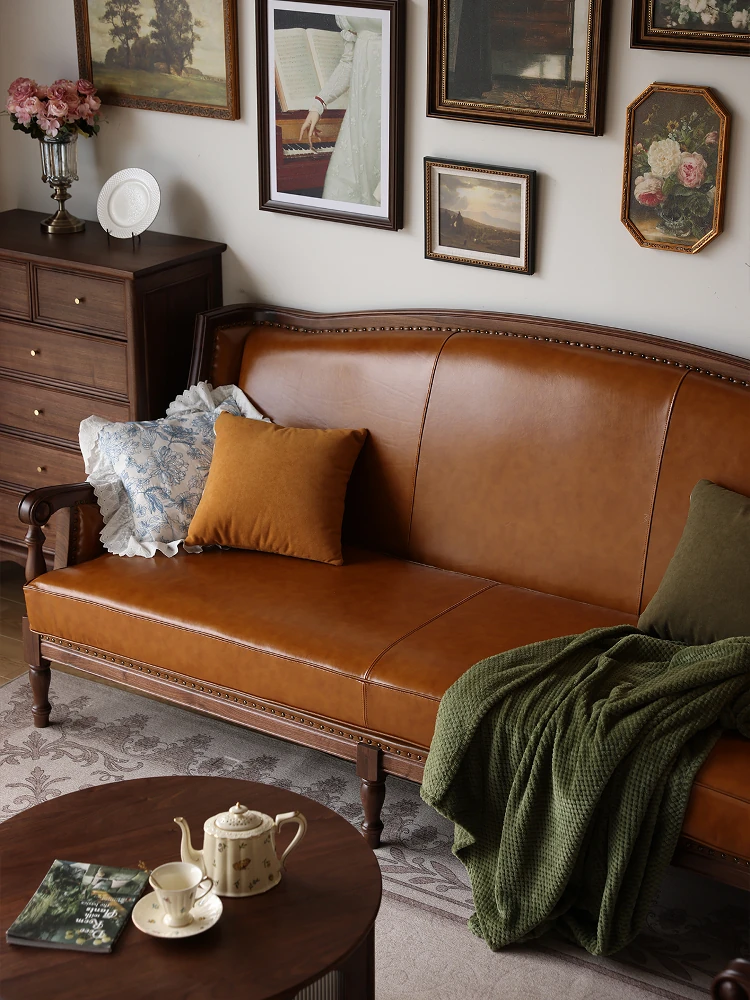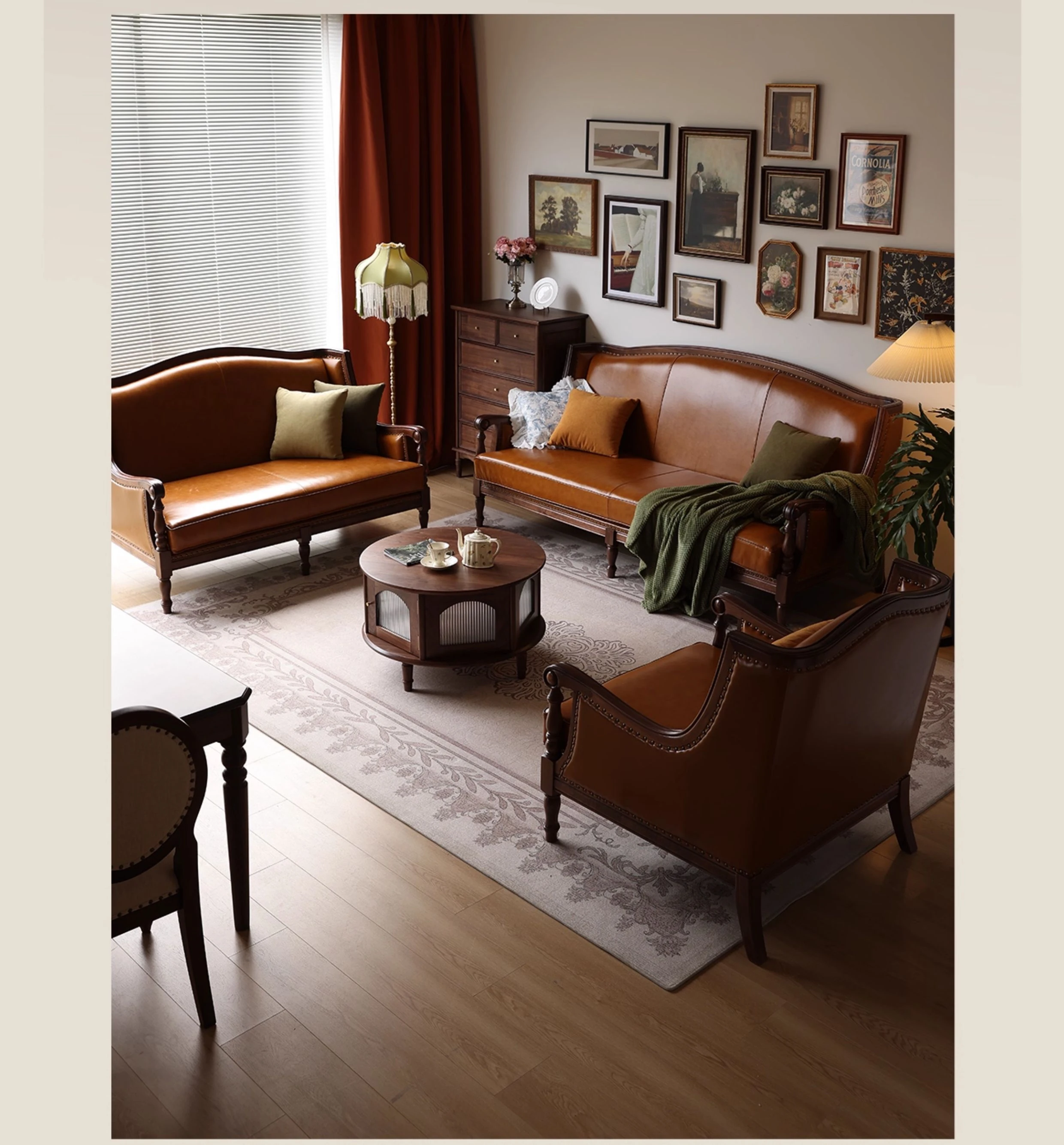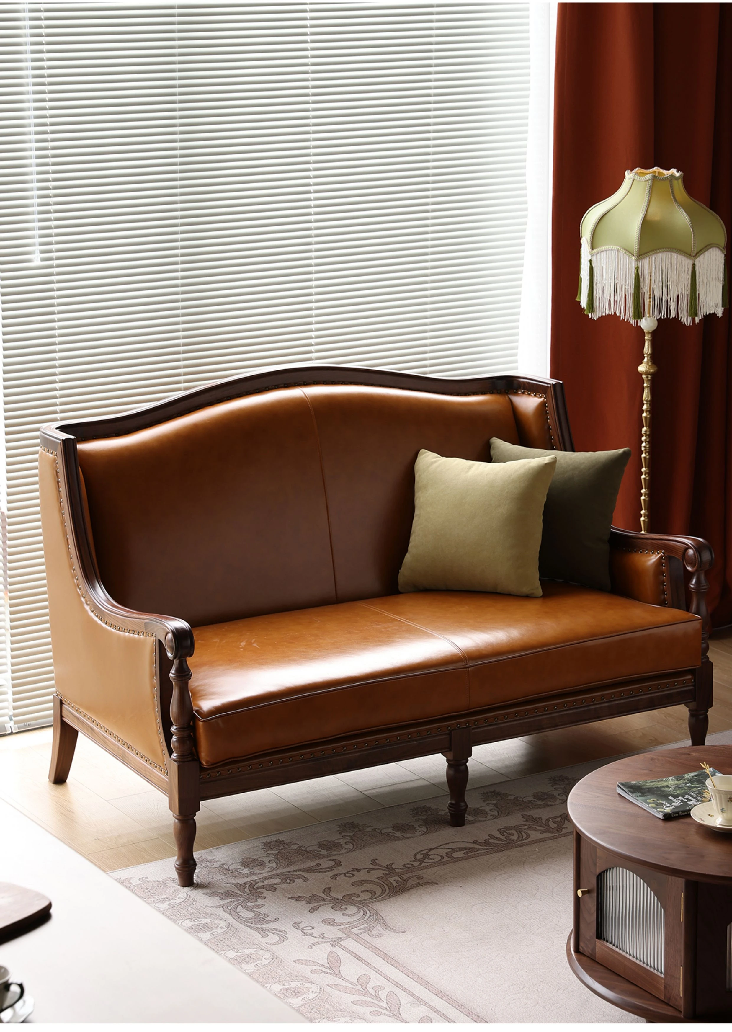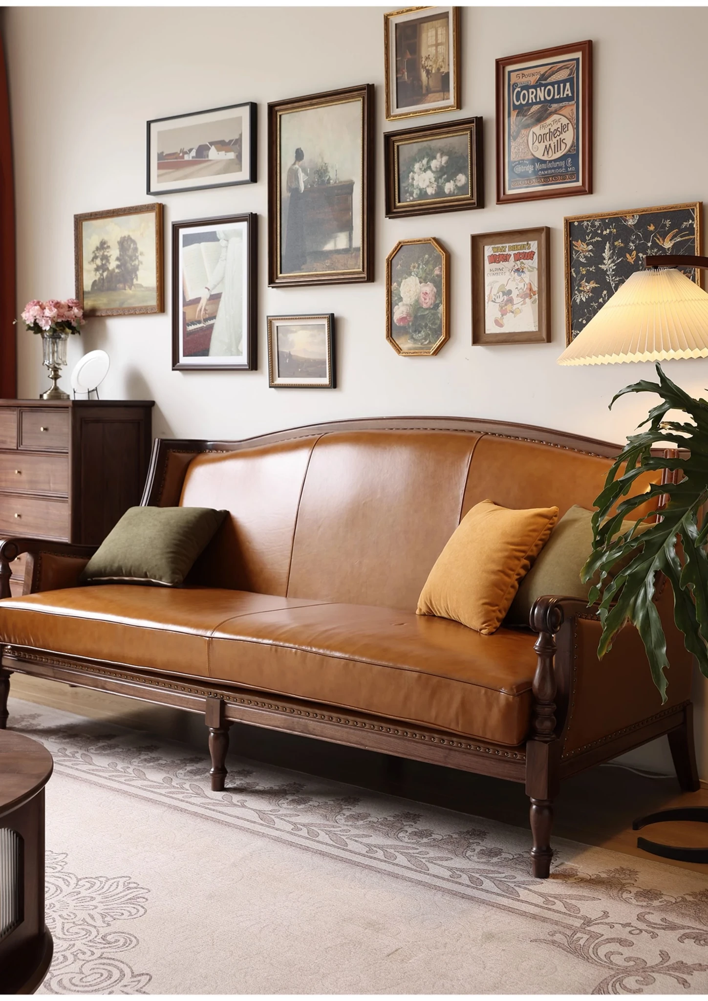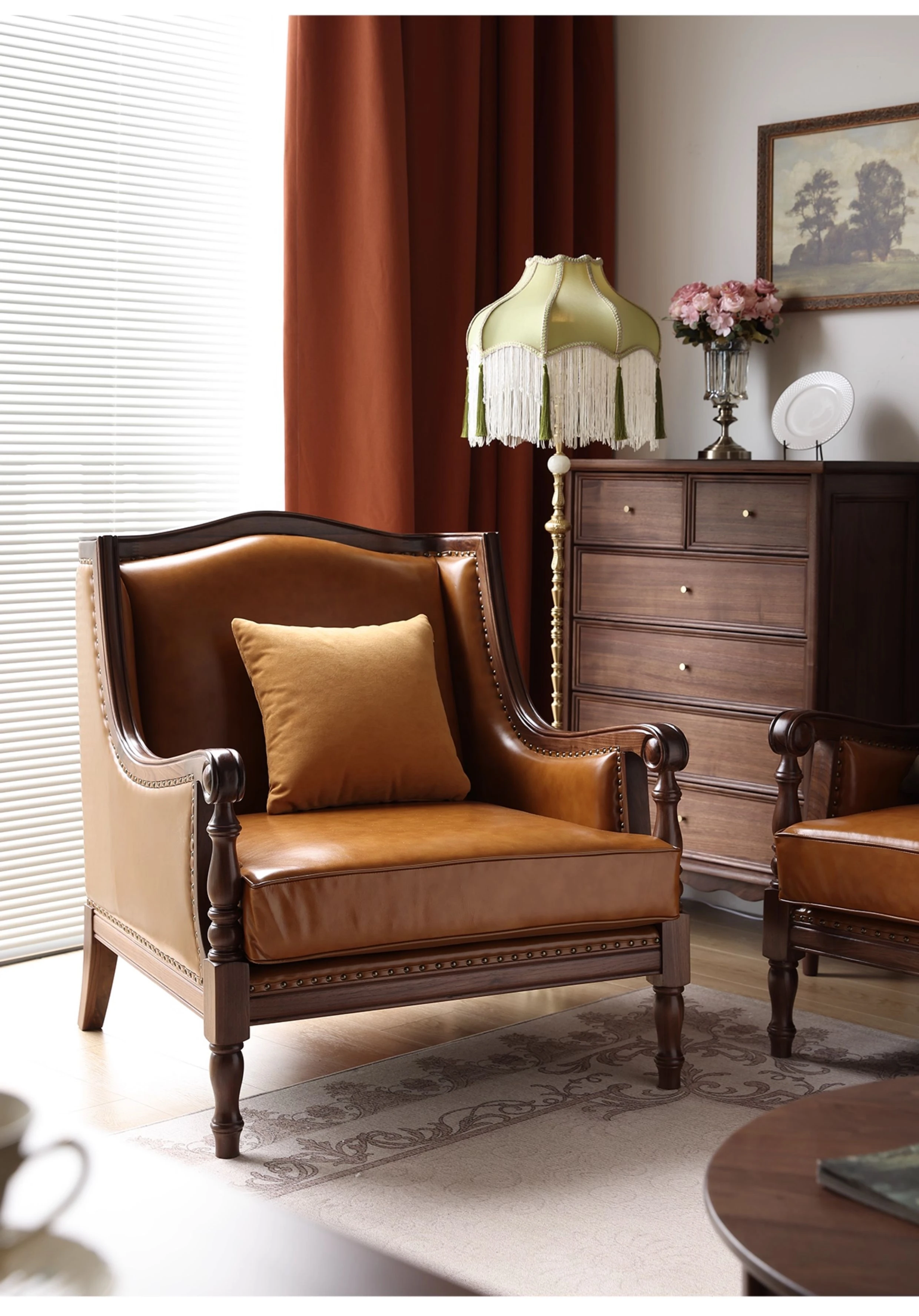 アメリカンレトロの無垢材と本革ソファ|北米産ブラックウォールナット使用|123cmコンビネーション|シンプルで洗練された高級ヴィラリビングルーム家具